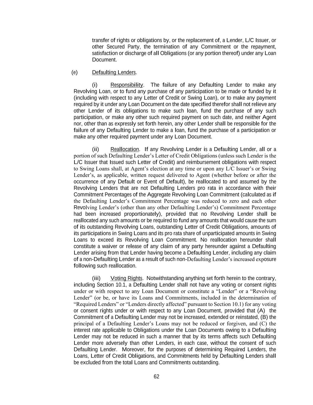 62 transfer of rights or obligations by, or the replacement of, a Lender, L/C Issuer, or other Secured Party, the termination of any Commitment or the repayment, satisfaction or discharge of all Obligations (or any portion thereof) under any Loan Document. (e) Defaulting Lenders. (i) Responsibility. The failure of any Defaulting Lender to make any Revolving Loan, or to fund any purchase of any participation to be made or funded by it (including with respect to any Letter of Credit or Swing Loan), or to make any payment required by it under any Loan Document on the date specified therefor shall not relieve any other Lender of its obligations to make such loan, fund the purchase of any such participation, or make any other such required payment on such date, and neither Agent nor, other than as expressly set forth herein, any other Lender shall be responsible for the failure of any Defaulting Lender to make a loan, fund the purchase of a participation or make any other required payment under any Loan Document. (ii) Reallocation. If any Revolving Lender is a Defaulting Lender, all or a portion of such Defaulting Lender’s Letter of Credit Obligations (unless such Lender is the L/C Issuer that Issued such Letter of Credit) and reimbursement obligations with respect to Swing Loans shall, at Agent’s election at any time or upon any L/C Issuer’s or Swing Lender’s, as applicable, written request delivered to Agent (whether before or after the occurrence of any Default or Event of Default), be reallocated to and assumed by the Revolving Lenders that are not Defaulting Lenders pro rata in accordance with their Commitment Percentages of the Aggregate Revolving Loan Commitment (calculated as if the Defaulting Lender’s Commitment Percentage was reduced to zero and each other Revolving Lender’s (other than any other Defaulting Lender’s) Commitment Percentage had been increased proportionately), provided that no Revolving Lender shall be reallocated any such amounts or be required to fund any amounts that would cause the sum of its outstanding Revolving Loans, outstanding Letter of Credit Obligations, amounts of its participations in Swing Loans and its pro rata share of unparticipated amounts in Swing Loans to exceed its Revolving Loan Commitment. No reallocation hereunder shall constitute a waiver or release of any claim of any party hereunder against a Defaulting Lender arising from that Lender having become a Defaulting Lender, including any claim of a non-Defaulting Lender as a result of such non-Defaulting Lender’s increased exposure following such reallocation. (iii) Voting Rights. Notwithstanding anything set forth herein to the contrary, including Section 10.1, a Defaulting Lender shall not have any voting or consent rights under or with respect to any Loan Document or constitute a “Lender” or a “Revolving Lender” (or be, or have its Loans and Commitments, included in the determination of “Required Lenders” or “Lenders directly affected” pursuant to Section 10.1) for any voting or consent rights under or with respect to any Loan Document, provided that (A) the Commitment of a Defaulting Lender may not be increased, extended or reinstated, (B) the principal of a Defaulting Lender’s Loans may not be reduced or forgiven, and (C) the interest rate applicable to Obligations under the Loan Documents owing to a Defaulting Lender may not be reduced in such a manner that by its terms affects such Defaulting Lender more adversely than other Lenders, in each case, without the consent of such Defaulting Lender. Moreover, for the purposes of determining Required Lenders, the Loans, Letter of Credit Obligations, and Commitments held by Defaulting Lenders shall be excluded from the total Loans and Commitments outstanding.