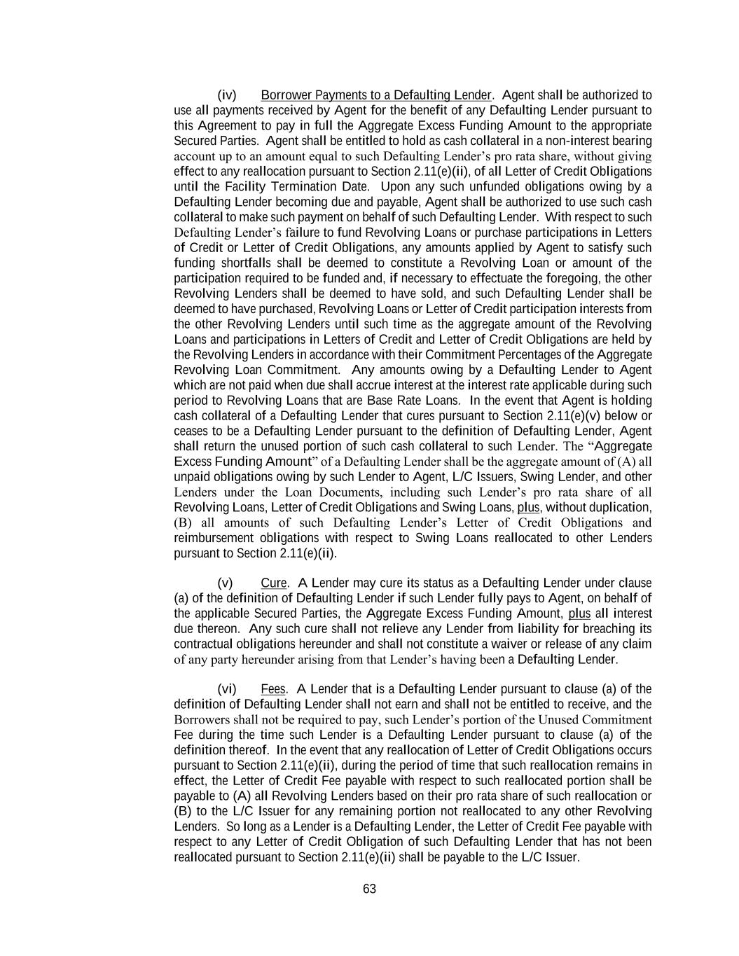 63 (iv) Borrower Payments to a Defaulting Lender. Agent shall be authorized to use all payments received by Agent for the benefit of any Defaulting Lender pursuant to this Agreement to pay in full the Aggregate Excess Funding Amount to the appropriate Secured Parties. Agent shall be entitled to hold as cash collateral in a non-interest bearing account up to an amount equal to such Defaulting Lender’s pro rata share, without giving effect to any reallocation pursuant to Section 2.11(e)(ii), of all Letter of Credit Obligations until the Facility Termination Date. Upon any such unfunded obligations owing by a Defaulting Lender becoming due and payable, Agent shall be authorized to use such cash collateral to make such payment on behalf of such Defaulting Lender. With respect to such Defaulting Lender’s failure to fund Revolving Loans or purchase participations in Letters of Credit or Letter of Credit Obligations, any amounts applied by Agent to satisfy such funding shortfalls shall be deemed to constitute a Revolving Loan or amount of the participation required to be funded and, if necessary to effectuate the foregoing, the other Revolving Lenders shall be deemed to have sold, and such Defaulting Lender shall be deemed to have purchased, Revolving Loans or Letter of Credit participation interests from the other Revolving Lenders until such time as the aggregate amount of the Revolving Loans and participations in Letters of Credit and Letter of Credit Obligations are held by the Revolving Lenders in accordance with their Commitment Percentages of the Aggregate Revolving Loan Commitment. Any amounts owing by a Defaulting Lender to Agent which are not paid when due shall accrue interest at the interest rate applicable during such period to Revolving Loans that are Base Rate Loans. In the event that Agent is holding cash collateral of a Defaulting Lender that cures pursuant to Section 2.11(e)(v) below or ceases to be a Defaulting Lender pursuant to the definition of Defaulting Lender, Agent shall return the unused portion of such cash collateral to such Lender. The “Aggregate Excess Funding Amount” of a Defaulting Lender shall be the aggregate amount of (A) all unpaid obligations owing by such Lender to Agent, L/C Issuers, Swing Lender, and other Lenders under the Loan Documents, including such Lender’s pro rata share of all Revolving Loans, Letter of Credit Obligations and Swing Loans, plus, without duplication, (B) all amounts of such Defaulting Lender’s Letter of Credit Obligations and reimbursement obligations with respect to Swing Loans reallocated to other Lenders pursuant to Section 2.11(e)(ii). (v) Cure. A Lender may cure its status as a Defaulting Lender under clause (a) of the definition of Defaulting Lender if such Lender fully pays to Agent, on behalf of the applicable Secured Parties, the Aggregate Excess Funding Amount, plus all interest due thereon. Any such cure shall not relieve any Lender from liability for breaching its contractual obligations hereunder and shall not constitute a waiver or release of any claim of any party hereunder arising from that Lender’s having been a Defaulting Lender. (vi) Fees. A Lender that is a Defaulting Lender pursuant to clause (a) of the definition of Defaulting Lender shall not earn and shall not be entitled to receive, and the Borrowers shall not be required to pay, such Lender’s portion of the Unused Commitment Fee during the time such Lender is a Defaulting Lender pursuant to clause (a) of the definition thereof. In the event that any reallocation of Letter of Credit Obligations occurs pursuant to Section 2.11(e)(ii), during the period of time that such reallocation remains in effect, the Letter of Credit Fee payable with respect to such reallocated portion shall be payable to (A) all Revolving Lenders based on their pro rata share of such reallocation or (B) to the L/C Issuer for any remaining portion not reallocated to any other Revolving Lenders. So long as a Lender is a Defaulting Lender, the Letter of Credit Fee payable with respect to any Letter of Credit Obligation of such Defaulting Lender that has not been reallocated pursuant to Section 2.11(e)(ii) shall be payable to the L/C Issuer.