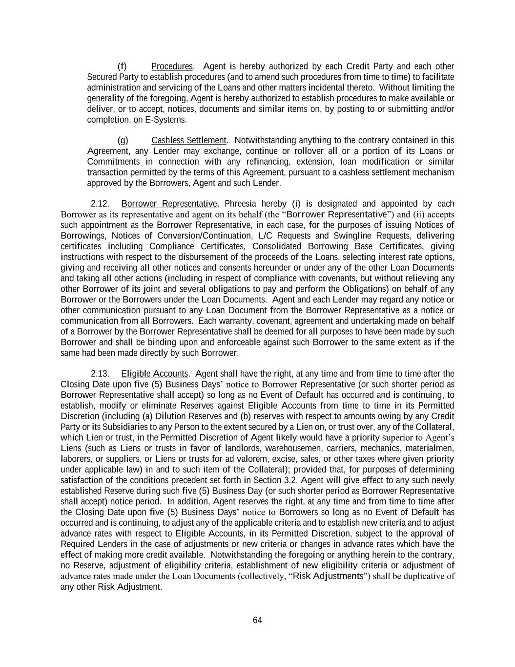 64 (f) Procedures. Agent is hereby authorized by each Credit Party and each other Secured Party to establish procedures (and to amend such procedures from time to time) to facilitate administration and servicing of the Loans and other matters incidental thereto. Without limiting the generality of the foregoing, Agent is hereby authorized to establish procedures to make available or deliver, or to accept, notices, documents and similar items on, by posting to or submitting and/or completion, on E-Systems. (g) Cashless Settlement. Notwithstanding anything to the contrary contained in this Agreement, any Lender may exchange, continue or rollover all or a portion of its Loans or Commitments in connection with any refinancing, extension, loan modification or similar transaction permitted by the terms of this Agreement, pursuant to a cashless settlement mechanism approved by the Borrowers, Agent and such Lender. 2.12. Borrower Representative. Phreesia hereby (i) is designated and appointed by each Borrower as its representative and agent on its behalf (the “Borrower Representative”) and (ii) accepts such appointment as the Borrower Representative, in each case, for the purposes of issuing Notices of Borrowings, Notices of Conversion/Continuation, L/C Requests and Swingline Requests, delivering certificates including Compliance Certificates, Consolidated Borrowing Base Certificates, giving instructions with respect to the disbursement of the proceeds of the Loans, selecting interest rate options, giving and receiving all other notices and consents hereunder or under any of the other Loan Documents and taking all other actions (including in respect of compliance with covenants, but without relieving any other Borrower of its joint and several obligations to pay and perform the Obligations) on behalf of any Borrower or the Borrowers under the Loan Documents. Agent and each Lender may regard any notice or other communication pursuant to any Loan Document from the Borrower Representative as a notice or communication from all Borrowers. Each warranty, covenant, agreement and undertaking made on behalf of a Borrower by the Borrower Representative shall be deemed for all purposes to have been made by such Borrower and shall be binding upon and enforceable against such Borrower to the same extent as if the same had been made directly by such Borrower. 2.13. Eligible Accounts. Agent shall have the right, at any time and from time to time after the Closing Date upon five (5) Business Days’ notice to Borrower Representative (or such shorter period as Borrower Representative shall accept) so long as no Event of Default has occurred and is continuing, to establish, modify or eliminate Reserves against Eligible Accounts from time to time in its Permitted Discretion (including (a) Dilution Reserves and (b) reserves with respect to amounts owing by any Credit Party or its Subsidiaries to any Person to the extent secured by a Lien on, or trust over, any of the Collateral, which Lien or trust, in the Permitted Discretion of Agent likely would have a priority superior to Agent’s Liens (such as Liens or trusts in favor of landlords, warehousemen, carriers, mechanics, materialmen, laborers, or suppliers, or Liens or trusts for ad valorem, excise, sales, or other taxes where given priority under applicable law) in and to such item of the Collateral); provided that, for purposes of determining satisfaction of the conditions precedent set forth in Section 3.2, Agent will give effect to any such newly established Reserve during such five (5) Business Day (or such shorter period as Borrower Representative shall accept) notice period. In addition, Agent reserves the right, at any time and from time to time after the Closing Date upon five (5) Business Days’ notice to Borrowers so long as no Event of Default has occurred and is continuing, to adjust any of the applicable criteria and to establish new criteria and to adjust advance rates with respect to Eligible Accounts, in its Permitted Discretion, subject to the approval of Required Lenders in the case of adjustments or new criteria or changes in advance rates which have the effect of making more credit available. Notwithstanding the foregoing or anything herein to the contrary, no Reserve, adjustment of eligibility criteria, establishment of new eligibility criteria or adjustment of advance rates made under the Loan Documents (collectively, “Risk Adjustments”) shall be duplicative of any other Risk Adjustment.