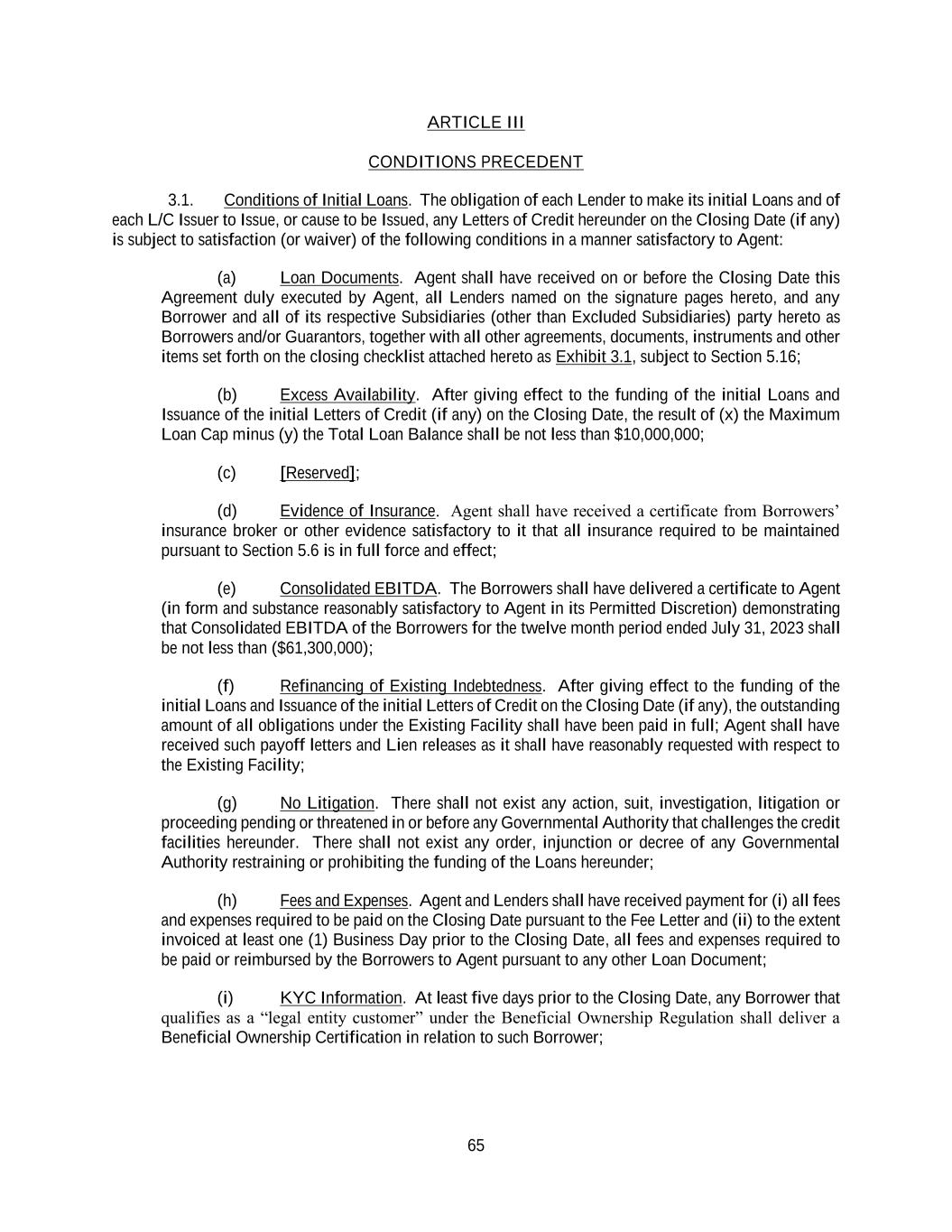 65 ARTICLE III CONDITIONS PRECEDENT 3.1. Conditions of Initial Loans. The obligation of each Lender to make its initial Loans and of each L/C Issuer to Issue, or cause to be Issued, any Letters of Credit hereunder on the Closing Date (if any) is subject to satisfaction (or waiver) of the following conditions in a manner satisfactory to Agent: (a) Loan Documents. Agent shall have received on or before the Closing Date this Agreement duly executed by Agent, all Lenders named on the signature pages hereto, and any Borrower and all of its respective Subsidiaries (other than Excluded Subsidiaries) party hereto as Borrowers and/or Guarantors, together with all other agreements, documents, instruments and other items set forth on the closing checklist attached hereto as Exhibit 3.1, subject to Section 5.16; (b) Excess Availability. After giving effect to the funding of the initial Loans and Issuance of the initial Letters of Credit (if any) on the Closing Date, the result of (x) the Maximum Loan Cap minus (y) the Total Loan Balance shall be not less than $10,000,000; (c) [Reserved]; (d) Evidence of Insurance. Agent shall have received a certificate from Borrowers’ insurance broker or other evidence satisfactory to it that all insurance required to be maintained pursuant to Section 5.6 is in full force and effect; (e) Consolidated EBITDA. The Borrowers shall have delivered a certificate to Agent (in form and substance reasonably satisfactory to Agent in its Permitted Discretion) demonstrating that Consolidated EBITDA of the Borrowers for the twelve month period ended July 31, 2023 shall be not less than ($61,300,000); (f) Refinancing of Existing Indebtedness. After giving effect to the funding of the initial Loans and Issuance of the initial Letters of Credit on the Closing Date (if any), the outstanding amount of all obligations under the Existing Facility shall have been paid in full; Agent shall have received such payoff letters and Lien releases as it shall have reasonably requested with respect to the Existing Facility; (g) No Litigation. There shall not exist any action, suit, investigation, litigation or proceeding pending or threatened in or before any Governmental Authority that challenges the credit facilities hereunder. There shall not exist any order, injunction or decree of any Governmental Authority restraining or prohibiting the funding of the Loans hereunder; (h) Fees and Expenses. Agent and Lenders shall have received payment for (i) all fees and expenses required to be paid on the Closing Date pursuant to the Fee Letter and (ii) to the extent invoiced at least one (1) Business Day prior to the Closing Date, all fees and expenses required to be paid or reimbursed by the Borrowers to Agent pursuant to any other Loan Document; (i) KYC Information. At least five days prior to the Closing Date, any Borrower that qualifies as a “legal entity customer” under the Beneficial Ownership Regulation shall deliver a Beneficial Ownership Certification in relation to such Borrower;