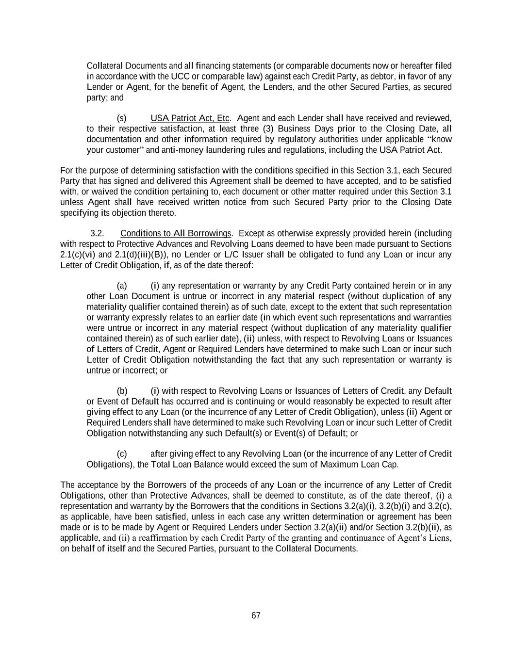 67 Collateral Documents and all financing statements (or comparable documents now or hereafter filed in accordance with the UCC or comparable law) against each Credit Party, as debtor, in favor of any Lender or Agent, for the benefit of Agent, the Lenders, and the other Secured Parties, as secured party; and (s) USA Patriot Act, Etc. Agent and each Lender shall have received and reviewed, to their respective satisfaction, at least three (3) Business Days prior to the Closing Date, all documentation and other information required by regulatory authorities under applicable “know your customer” and anti-money laundering rules and regulations, including the USA Patriot Act. For the purpose of determining satisfaction with the conditions specified in this Section 3.1, each Secured Party that has signed and delivered this Agreement shall be deemed to have accepted, and to be satisfied with, or waived the condition pertaining to, each document or other matter required under this Section 3.1 unless Agent shall have received written notice from such Secured Party prior to the Closing Date specifying its objection thereto. 3.2. Conditions to All Borrowings. Except as otherwise expressly provided herein (including with respect to Protective Advances and Revolving Loans deemed to have been made pursuant to Sections 2.1(c)(vi) and 2.1(d)(iii)(B)), no Lender or L/C Issuer shall be obligated to fund any Loan or incur any Letter of Credit Obligation, if, as of the date thereof: (a) (i) any representation or warranty by any Credit Party contained herein or in any other Loan Document is untrue or incorrect in any material respect (without duplication of any materiality qualifier contained therein) as of such date, except to the extent that such representation or warranty expressly relates to an earlier date (in which event such representations and warranties were untrue or incorrect in any material respect (without duplication of any materiality qualifier contained therein) as of such earlier date), (ii) unless, with respect to Revolving Loans or Issuances of Letters of Credit, Agent or Required Lenders have determined to make such Loan or incur such Letter of Credit Obligation notwithstanding the fact that any such representation or warranty is untrue or incorrect; or (b) (i) with respect to Revolving Loans or Issuances of Letters of Credit, any Default or Event of Default has occurred and is continuing or would reasonably be expected to result after giving effect to any Loan (or the incurrence of any Letter of Credit Obligation), unless (ii) Agent or Required Lenders shall have determined to make such Revolving Loan or incur such Letter of Credit Obligation notwithstanding any such Default(s) or Event(s) of Default; or (c) after giving effect to any Revolving Loan (or the incurrence of any Letter of Credit Obligations), the Total Loan Balance would exceed the sum of Maximum Loan Cap. The acceptance by the Borrowers of the proceeds of any Loan or the incurrence of any Letter of Credit Obligations, other than Protective Advances, shall be deemed to constitute, as of the date thereof, (i) a representation and warranty by the Borrowers that the conditions in Sections 3.2(a)(i), 3.2(b)(i) and 3.2(c), as applicable, have been satisfied, unless in each case any written determination or agreement has been made or is to be made by Agent or Required Lenders under Section 3.2(a)(ii) and/or Section 3.2(b)(ii), as applicable, and (ii) a reaffirmation by each Credit Party of the granting and continuance of Agent’s Liens, on behalf of itself and the Secured Parties, pursuant to the Collateral Documents.