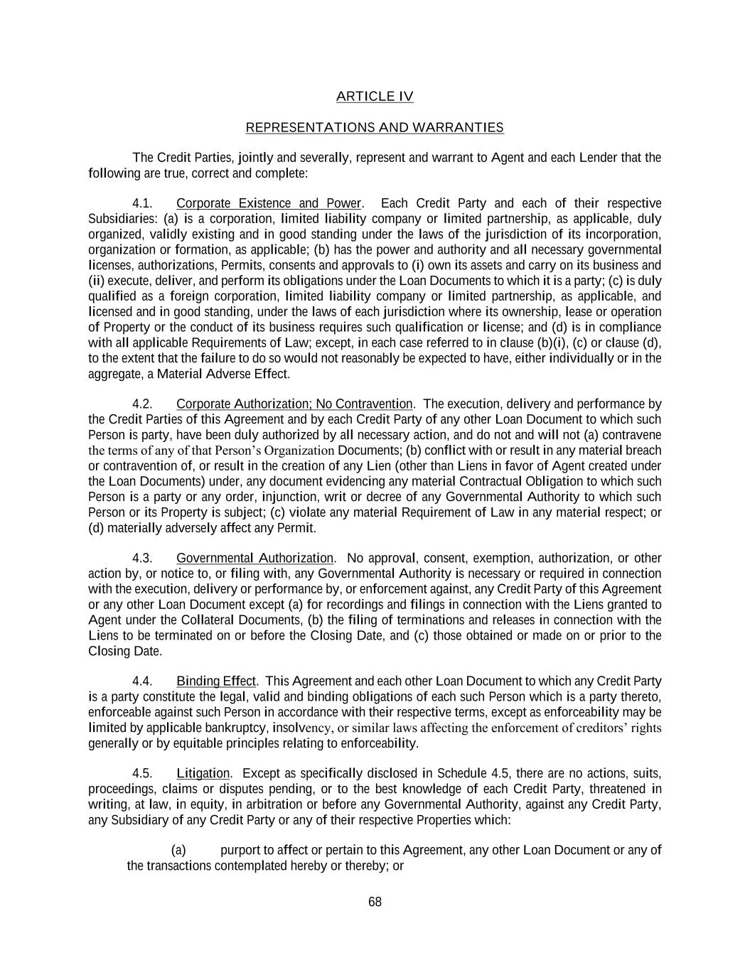 68 ARTICLE IV REPRESENTATIONS AND WARRANTIES The Credit Parties, jointly and severally, represent and warrant to Agent and each Lender that the following are true, correct and complete: 4.1. Corporate Existence and Power. Each Credit Party and each of their respective Subsidiaries: (a) is a corporation, limited liability company or limited partnership, as applicable, duly organized, validly existing and in good standing under the laws of the jurisdiction of its incorporation, organization or formation, as applicable; (b) has the power and authority and all necessary governmental licenses, authorizations, Permits, consents and approvals to (i) own its assets and carry on its business and (ii) execute, deliver, and perform its obligations under the Loan Documents to which it is a party; (c) is duly qualified as a foreign corporation, limited liability company or limited partnership, as applicable, and licensed and in good standing, under the laws of each jurisdiction where its ownership, lease or operation of Property or the conduct of its business requires such qualification or license; and (d) is in compliance with all applicable Requirements of Law; except, in each case referred to in clause (b)(i), (c) or clause (d), to the extent that the failure to do so would not reasonably be expected to have, either individually or in the aggregate, a Material Adverse Effect. 4.2. Corporate Authorization; No Contravention. The execution, delivery and performance by the Credit Parties of this Agreement and by each Credit Party of any other Loan Document to which such Person is party, have been duly authorized by all necessary action, and do not and will not (a) contravene the terms of any of that Person’s Organization Documents; (b) conflict with or result in any material breach or contravention of, or result in the creation of any Lien (other than Liens in favor of Agent created under the Loan Documents) under, any document evidencing any material Contractual Obligation to which such Person is a party or any order, injunction, writ or decree of any Governmental Authority to which such Person or its Property is subject; (c) violate any material Requirement of Law in any material respect; or (d) materially adversely affect any Permit. 4.3. Governmental Authorization. No approval, consent, exemption, authorization, or other action by, or notice to, or filing with, any Governmental Authority is necessary or required in connection with the execution, delivery or performance by, or enforcement against, any Credit Party of this Agreement or any other Loan Document except (a) for recordings and filings in connection with the Liens granted to Agent under the Collateral Documents, (b) the filing of terminations and releases in connection with the Liens to be terminated on or before the Closing Date, and (c) those obtained or made on or prior to the Closing Date. 4.4. Binding Effect. This Agreement and each other Loan Document to which any Credit Party is a party constitute the legal, valid and binding obligations of each such Person which is a party thereto, enforceable against such Person in accordance with their respective terms, except as enforceability may be limited by applicable bankruptcy, insolvency, or similar laws affecting the enforcement of creditors’ rights generally or by equitable principles relating to enforceability. 4.5. Litigation. Except as specifically disclosed in Schedule 4.5, there are no actions, suits, proceedings, claims or disputes pending, or to the best knowledge of each Credit Party, threatened in writing, at law, in equity, in arbitration or before any Governmental Authority, against any Credit Party, any Subsidiary of any Credit Party or any of their respective Properties which: (a) purport to affect or pertain to this Agreement, any other Loan Document or any of the transactions contemplated hereby or thereby; or