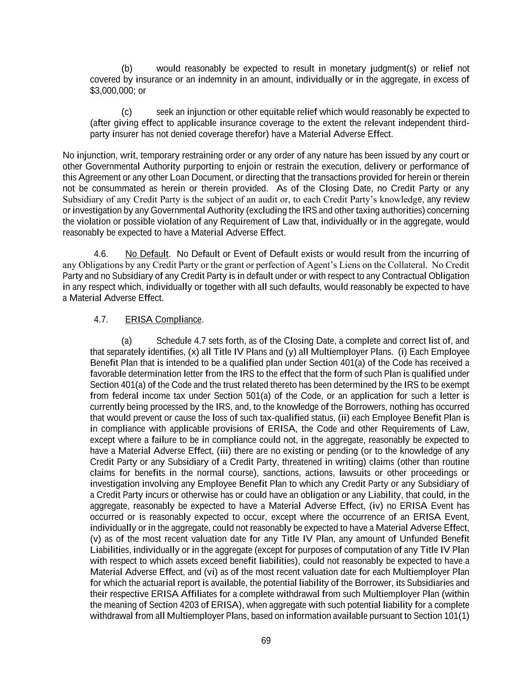 69 (b) would reasonably be expected to result in monetary judgment(s) or relief not covered by insurance or an indemnity in an amount, individually or in the aggregate, in excess of $3,000,000; or (c) seek an injunction or other equitable relief which would reasonably be expected to (after giving effect to applicable insurance coverage to the extent the relevant independent third- party insurer has not denied coverage therefor) have a Material Adverse Effect. No injunction, writ, temporary restraining order or any order of any nature has been issued by any court or other Governmental Authority purporting to enjoin or restrain the execution, delivery or performance of this Agreement or any other Loan Document, or directing that the transactions provided for herein or therein not be consummated as herein or therein provided. As of the Closing Date, no Credit Party or any Subsidiary of any Credit Party is the subject of an audit or, to each Credit Party’s knowledge, any review or investigation by any Governmental Authority (excluding the IRS and other taxing authorities) concerning the violation or possible violation of any Requirement of Law that, individually or in the aggregate, would reasonably be expected to have a Material Adverse Effect. 4.6. No Default. No Default or Event of Default exists or would result from the incurring of any Obligations by any Credit Party or the grant or perfection of Agent’s Liens on the Collateral. No Credit Party and no Subsidiary of any Credit Party is in default under or with respect to any Contractual Obligation in any respect which, individually or together with all such defaults, would reasonably be expected to have a Material Adverse Effect. 4.7. ERISA Compliance. (a) Schedule 4.7 sets forth, as of the Closing Date, a complete and correct list of, and that separately identifies, (x) all Title IV Plans and (y) all Multiemployer Plans. (i) Each Employee Benefit Plan that is intended to be a qualified plan under Section 401(a) of the Code has received a favorable determination letter from the IRS to the effect that the form of such Plan is qualified under Section 401(a) of the Code and the trust related thereto has been determined by the IRS to be exempt from federal income tax under Section 501(a) of the Code, or an application for such a letter is currently being processed by the IRS, and, to the knowledge of the Borrowers, nothing has occurred that would prevent or cause the loss of such tax-qualified status, (ii) each Employee Benefit Plan is in compliance with applicable provisions of ERISA, the Code and other Requirements of Law, except where a failure to be in compliance could not, in the aggregate, reasonably be expected to have a Material Adverse Effect, (iii) there are no existing or pending (or to the knowledge of any Credit Party or any Subsidiary of a Credit Party, threatened in writing) claims (other than routine claims for benefits in the normal course), sanctions, actions, lawsuits or other proceedings or investigation involving any Employee Benefit Plan to which any Credit Party or any Subsidiary of a Credit Party incurs or otherwise has or could have an obligation or any Liability, that could, in the aggregate, reasonably be expected to have a Material Adverse Effect, (iv) no ERISA Event has occurred or is reasonably expected to occur, except where the occurrence of an ERISA Event, individually or in the aggregate, could not reasonably be expected to have a Material Adverse Effect, (v) as of the most recent valuation date for any Title IV Plan, any amount of Unfunded Benefit Liabilities, individually or in the aggregate (except for purposes of computation of any Title IV Plan with respect to which assets exceed benefit liabilities), could not reasonably be expected to have a Material Adverse Effect, and (vi) as of the most recent valuation date for each Multiemployer Plan for which the actuarial report is available, the potential liability of the Borrower, its Subsidiaries and their respective ERISA Affiliates for a complete withdrawal from such Multiemployer Plan (within the meaning of Section 4203 of ERISA), when aggregate with such potential liability for a complete withdrawal from all Multiemployer Plans, based on information available pursuant to Section 101(1)