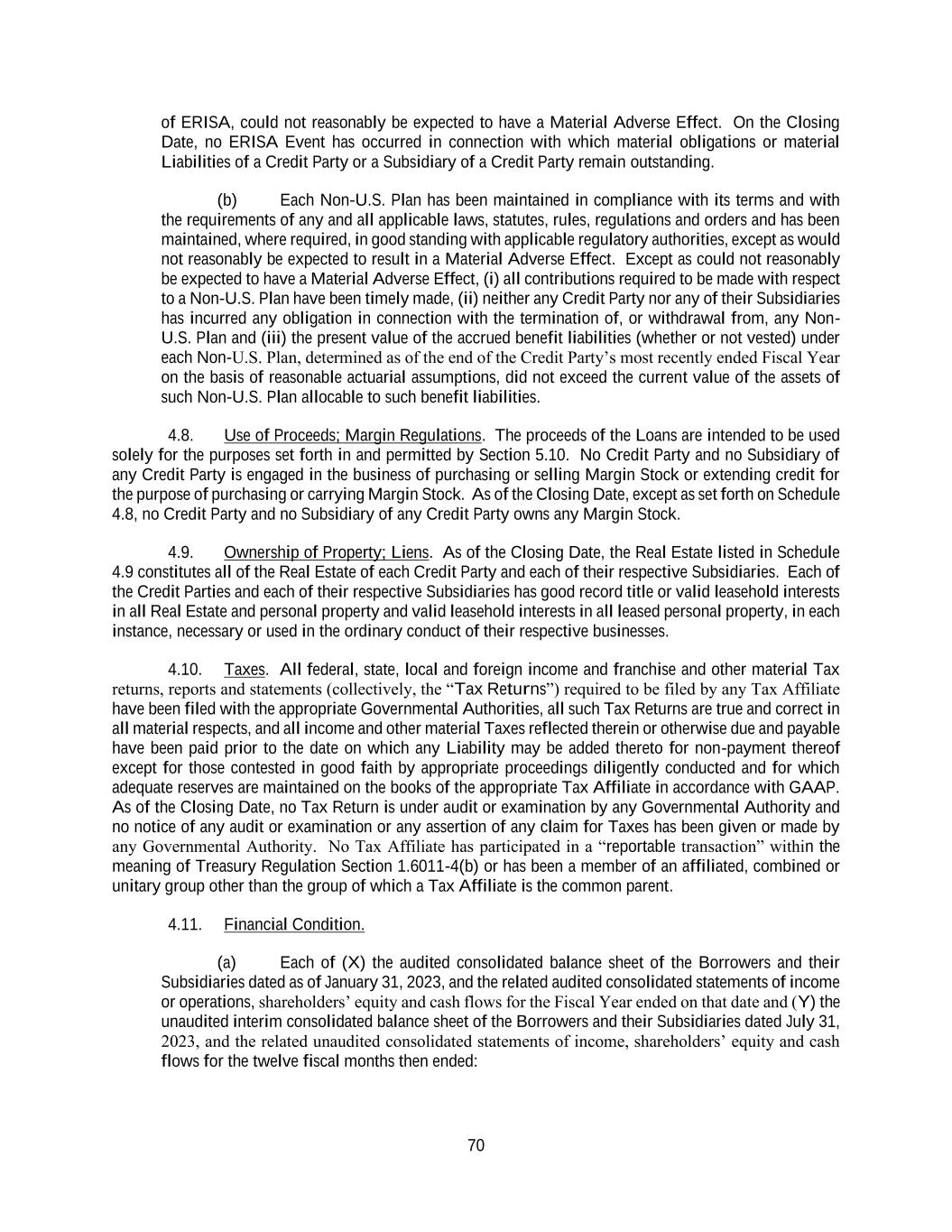 70 of ERISA, could not reasonably be expected to have a Material Adverse Effect. On the Closing Date, no ERISA Event has occurred in connection with which material obligations or material Liabilities of a Credit Party or a Subsidiary of a Credit Party remain outstanding. (b) Each Non-U.S. Plan has been maintained in compliance with its terms and with the requirements of any and all applicable laws, statutes, rules, regulations and orders and has been maintained, where required, in good standing with applicable regulatory authorities, except as would not reasonably be expected to result in a Material Adverse Effect. Except as could not reasonably be expected to have a Material Adverse Effect, (i) all contributions required to be made with respect to a Non-U.S. Plan have been timely made, (ii) neither any Credit Party nor any of their Subsidiaries has incurred any obligation in connection with the termination of, or withdrawal from, any Non- U.S. Plan and (iii) the present value of the accrued benefit liabilities (whether or not vested) under each Non-U.S. Plan, determined as of the end of the Credit Party’s most recently ended Fiscal Year on the basis of reasonable actuarial assumptions, did not exceed the current value of the assets of such Non-U.S. Plan allocable to such benefit liabilities. 4.8. Use of Proceeds; Margin Regulations. The proceeds of the Loans are intended to be used solely for the purposes set forth in and permitted by Section 5.10. No Credit Party and no Subsidiary of any Credit Party is engaged in the business of purchasing or selling Margin Stock or extending credit for the purpose of purchasing or carrying Margin Stock. As of the Closing Date, except as set forth on Schedule 4.8, no Credit Party and no Subsidiary of any Credit Party owns any Margin Stock. 4.9. Ownership of Property; Liens. As of the Closing Date, the Real Estate listed in Schedule 4.9 constitutes all of the Real Estate of each Credit Party and each of their respective Subsidiaries. Each of the Credit Parties and each of their respective Subsidiaries has good record title or valid leasehold interests in all Real Estate and personal property and valid leasehold interests in all leased personal property, in each instance, necessary or used in the ordinary conduct of their respective businesses. 4.10. Taxes. All federal, state, local and foreign income and franchise and other material Tax returns, reports and statements (collectively, the “Tax Returns”) required to be filed by any Tax Affiliate have been filed with the appropriate Governmental Authorities, all such Tax Returns are true and correct in all material respects, and all income and other material Taxes reflected therein or otherwise due and payable have been paid prior to the date on which any Liability may be added thereto for non-payment thereof except for those contested in good faith by appropriate proceedings diligently conducted and for which adequate reserves are maintained on the books of the appropriate Tax Affiliate in accordance with GAAP. As of the Closing Date, no Tax Return is under audit or examination by any Governmental Authority and no notice of any audit or examination or any assertion of any claim for Taxes has been given or made by any Governmental Authority. No Tax Affiliate has participated in a “reportable transaction” within the meaning of Treasury Regulation Section 1.6011-4(b) or has been a member of an affiliated, combined or unitary group other than the group of which a Tax Affiliate is the common parent. 4.11. Financial Condition. (a) Each of (X) the audited consolidated balance sheet of the Borrowers and their Subsidiaries dated as of January 31, 2023, and the related audited consolidated statements of income or operations, shareholders’ equity and cash flows for the Fiscal Year ended on that date and (Y) the unaudited interim consolidated balance sheet of the Borrowers and their Subsidiaries dated July 31, 2023, and the related unaudited consolidated statements of income, shareholders’ equity and cash flows for the twelve fiscal months then ended: