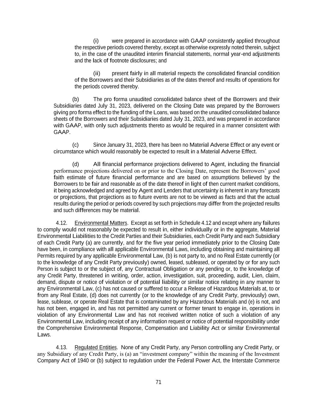 71 (i) were prepared in accordance with GAAP consistently applied throughout the respective periods covered thereby, except as otherwise expressly noted therein, subject to, in the case of the unaudited interim financial statements, normal year-end adjustments and the lack of footnote disclosures; and (ii) present fairly in all material respects the consolidated financial condition of the Borrowers and their Subsidiaries as of the dates thereof and results of operations for the periods covered thereby. (b) The pro forma unaudited consolidated balance sheet of the Borrowers and their Subsidiaries dated July 31, 2023, delivered on the Closing Date was prepared by the Borrowers giving pro forma effect to the funding of the Loans, was based on the unaudited consolidated balance sheets of the Borrowers and their Subsidiaries dated July 31, 2023, and was prepared in accordance with GAAP, with only such adjustments thereto as would be required in a manner consistent with GAAP. (c) Since January 31, 2023, there has been no Material Adverse Effect or any event or circumstance which would reasonably be expected to result in a Material Adverse Effect. (d) All financial performance projections delivered to Agent, including the financial performance projections delivered on or prior to the Closing Date, represent the Borrowers’ good faith estimate of future financial performance and are based on assumptions believed by the Borrowers to be fair and reasonable as of the date thereof in light of then current market conditions, it being acknowledged and agreed by Agent and Lenders that uncertainty is inherent in any forecasts or projections, that projections as to future events are not to be viewed as facts and that the actual results during the period or periods covered by such projections may differ from the projected results and such differences may be material. 4.12. Environmental Matters. Except as set forth in Schedule 4.12 and except where any failures to comply would not reasonably be expected to result in, either individually or in the aggregate, Material Environmental Liabilities to the Credit Parties and their Subsidiaries, each Credit Party and each Subsidiary of each Credit Party (a) are currently, and for the five year period immediately prior to the Closing Date have been, in compliance with all applicable Environmental Laws, including obtaining and maintaining all Permits required by any applicable Environmental Law, (b) is not party to, and no Real Estate currently (or to the knowledge of any Credit Party previously) owned, leased, subleased, or operated by or for any such Person is subject to or the subject of, any Contractual Obligation or any pending or, to the knowledge of any Credit Party, threatened in writing, order, action, investigation, suit, proceeding, audit, Lien, claim, demand, dispute or notice of violation or of potential liability or similar notice relating in any manner to any Environmental Law, (c) has not caused or suffered to occur a Release of Hazardous Materials at, to or from any Real Estate, (d) does not currently (or to the knowledge of any Credit Party, previously) own, lease, sublease, or operate Real Estate that is contaminated by any Hazardous Materials and (e) is not, and has not been, engaged in, and has not permitted any current or former tenant to engage in, operations in violation of any Environmental Law and has not received written notice of such a violation of any Environmental Law, including receipt of any information request or notice of potential responsibility under the Comprehensive Environmental Response, Compensation and Liability Act or similar Environmental Laws. 4.13. Regulated Entities. None of any Credit Party, any Person controlling any Credit Party, or any Subsidiary of any Credit Party, is (a) an “investment company” within the meaning of the Investment Company Act of 1940 or (b) subject to regulation under the Federal Power Act, the Interstate Commerce