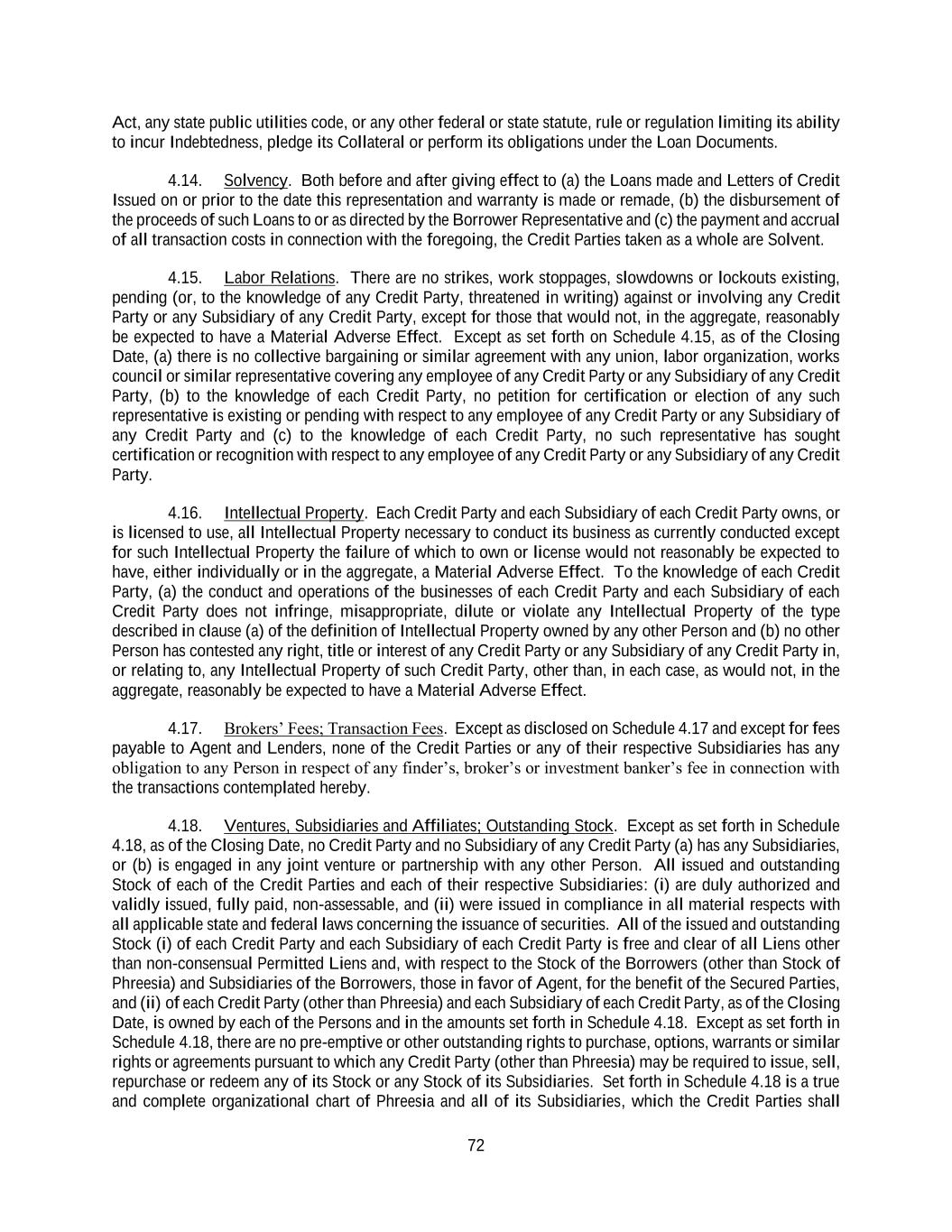 72 Act, any state public utilities code, or any other federal or state statute, rule or regulation limiting its ability to incur Indebtedness, pledge its Collateral or perform its obligations under the Loan Documents. 4.14. Solvency. Both before and after giving effect to (a) the Loans made and Letters of Credit Issued on or prior to the date this representation and warranty is made or remade, (b) the disbursement of the proceeds of such Loans to or as directed by the Borrower Representative and (c) the payment and accrual of all transaction costs in connection with the foregoing, the Credit Parties taken as a whole are Solvent. 4.15. Labor Relations. There are no strikes, work stoppages, slowdowns or lockouts existing, pending (or, to the knowledge of any Credit Party, threatened in writing) against or involving any Credit Party or any Subsidiary of any Credit Party, except for those that would not, in the aggregate, reasonably be expected to have a Material Adverse Effect. Except as set forth on Schedule 4.15, as of the Closing Date, (a) there is no collective bargaining or similar agreement with any union, labor organization, works council or similar representative covering any employee of any Credit Party or any Subsidiary of any Credit Party, (b) to the knowledge of each Credit Party, no petition for certification or election of any such representative is existing or pending with respect to any employee of any Credit Party or any Subsidiary of any Credit Party and (c) to the knowledge of each Credit Party, no such representative has sought certification or recognition with respect to any employee of any Credit Party or any Subsidiary of any Credit Party. 4.16. Intellectual Property. Each Credit Party and each Subsidiary of each Credit Party owns, or is licensed to use, all Intellectual Property necessary to conduct its business as currently conducted except for such Intellectual Property the failure of which to own or license would not reasonably be expected to have, either individually or in the aggregate, a Material Adverse Effect. To the knowledge of each Credit Party, (a) the conduct and operations of the businesses of each Credit Party and each Subsidiary of each Credit Party does not infringe, misappropriate, dilute or violate any Intellectual Property of the type described in clause (a) of the definition of Intellectual Property owned by any other Person and (b) no other Person has contested any right, title or interest of any Credit Party or any Subsidiary of any Credit Party in, or relating to, any Intellectual Property of such Credit Party, other than, in each case, as would not, in the aggregate, reasonably be expected to have a Material Adverse Effect. 4.17. Brokers’ Fees; Transaction Fees. Except as disclosed on Schedule 4.17 and except for fees payable to Agent and Lenders, none of the Credit Parties or any of their respective Subsidiaries has any obligation to any Person in respect of any finder’s, broker’s or investment banker’s fee in connection with the transactions contemplated hereby. 4.18. Ventures, Subsidiaries and Affiliates; Outstanding Stock. Except as set forth in Schedule 4.18, as of the Closing Date, no Credit Party and no Subsidiary of any Credit Party (a) has any Subsidiaries, or (b) is engaged in any joint venture or partnership with any other Person. All issued and outstanding Stock of each of the Credit Parties and each of their respective Subsidiaries: (i) are duly authorized and validly issued, fully paid, non-assessable, and (ii) were issued in compliance in all material respects with all applicable state and federal laws concerning the issuance of securities. All of the issued and outstanding Stock (i) of each Credit Party and each Subsidiary of each Credit Party is free and clear of all Liens other than non-consensual Permitted Liens and, with respect to the Stock of the Borrowers (other than Stock of Phreesia) and Subsidiaries of the Borrowers, those in favor of Agent, for the benefit of the Secured Parties, and (ii) of each Credit Party (other than Phreesia) and each Subsidiary of each Credit Party, as of the Closing Date, is owned by each of the Persons and in the amounts set forth in Schedule 4.18. Except as set forth in Schedule 4.18, there are no pre-emptive or other outstanding rights to purchase, options, warrants or similar rights or agreements pursuant to which any Credit Party (other than Phreesia) may be required to issue, sell, repurchase or redeem any of its Stock or any Stock of its Subsidiaries. Set forth in Schedule 4.18 is a true and complete organizational chart of Phreesia and all of its Subsidiaries, which the Credit Parties shall