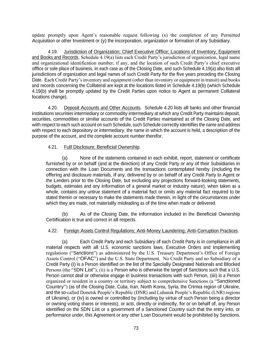 73 update promptly upon Agent’s reasonable request following (x) the completion of any Permitted Acquisition or other Investment or (y) the incorporation, organization or formation of any Subsidiary. 4.19. Jurisdiction of Organization; Chief Executive Office; Locations of Inventory, Equipment and Books and Records. Schedule 4.19(a) lists each Credit Party’s jurisdiction of organization, legal name and organizational identification number, if any, and the location of such Credit Party’s chief executive office or sole place of business, in each case as of the Closing Date, and such Schedule 4.19(a) also lists all jurisdictions of organization and legal names of such Credit Party for the five years preceding the Closing Date. Each Credit Party’s inventory and equipment (other than inventory or equipment in transit) and books and records concerning the Collateral are kept at the locations listed in Schedule 4.19(b) (which Schedule 4.19(b) shall be promptly updated by the Credit Parties upon notice to Agent as permanent Collateral locations change). 4.20. Deposit Accounts and Other Accounts. Schedule 4.20 lists all banks and other financial institutions securities intermediary or commodity intermediary at which any Credit Party maintains deposit, securities, commodities or similar accounts of the Credit Parties maintained as of the Closing Date, and with respect to each such account on such Schedule, such Schedule correctly identifies the name and address with respect to each depository or intermediary, the name in which the account is held, a description of the purpose of the account, and the complete account number therefor. 4.21. Full Disclosure; Beneficial Ownership. (a) None of the statements contained in each exhibit, report, statement or certificate furnished by or on behalf (and at the direction) of any Credit Party or any of their Subsidiaries in connection with the Loan Documents and the transactions contemplated hereby (including the offering and disclosure materials, if any, delivered by or on behalf of any Credit Party to Agent or the Lenders prior to the Closing Date, but excluding any projections forward-looking statements, budgets, estimates and any information of a general market or industry nature), when taken as a whole, contains any untrue statement of a material fact or omits any material fact required to be stated therein or necessary to make the statements made therein, in light of the circumstances under which they are made, not materially misleading as of the time when made or delivered. (b) As of the Closing Date, the information included in the Beneficial Ownership Certification is true and correct in all respects. 4.22. Foreign Assets Control Regulations; Anti-Money Laundering; Anti-Corruption Practices. (a) Each Credit Party and each Subsidiary of each Credit Party is in compliance in all material respects with all U.S. economic sanctions laws, Executive Orders and implementing regulations (“Sanctions”) as administered by the U.S. Treasury Department’s Office of Foreign Assets Control (“OFAC”) and the U.S. State Department. No Credit Party and no Subsidiary of a Credit Party (i) is a Person identified on the list of the Specially Designated Nationals and Blocked Persons (the “SDN List”), (ii) is a Person who is otherwise the target of Sanctions such that a U.S. Person cannot deal or otherwise engage in business transactions with such Person, (iii) is a Person organized or resident in a country or territory subject to comprehensive Sanctions (a “Sanctioned Country”) (as of the Closing Date, Cuba, Iran, North Korea, Syria, the Crimea region of Ukraine, and the so-called Donetsk People’s Republic (DNR) and Luhansk People’s Republic (LNR) regions of Ukraine), or (iv) is owned or controlled by (including by virtue of such Person being a director or owning voting shares or interests), or acts, directly or indirectly, for or on behalf of, any Person identified on the SDN List or a government of a Sanctioned Country such that the entry into, or performance under, this Agreement or any other Loan Document would be prohibited by Sanctions.
