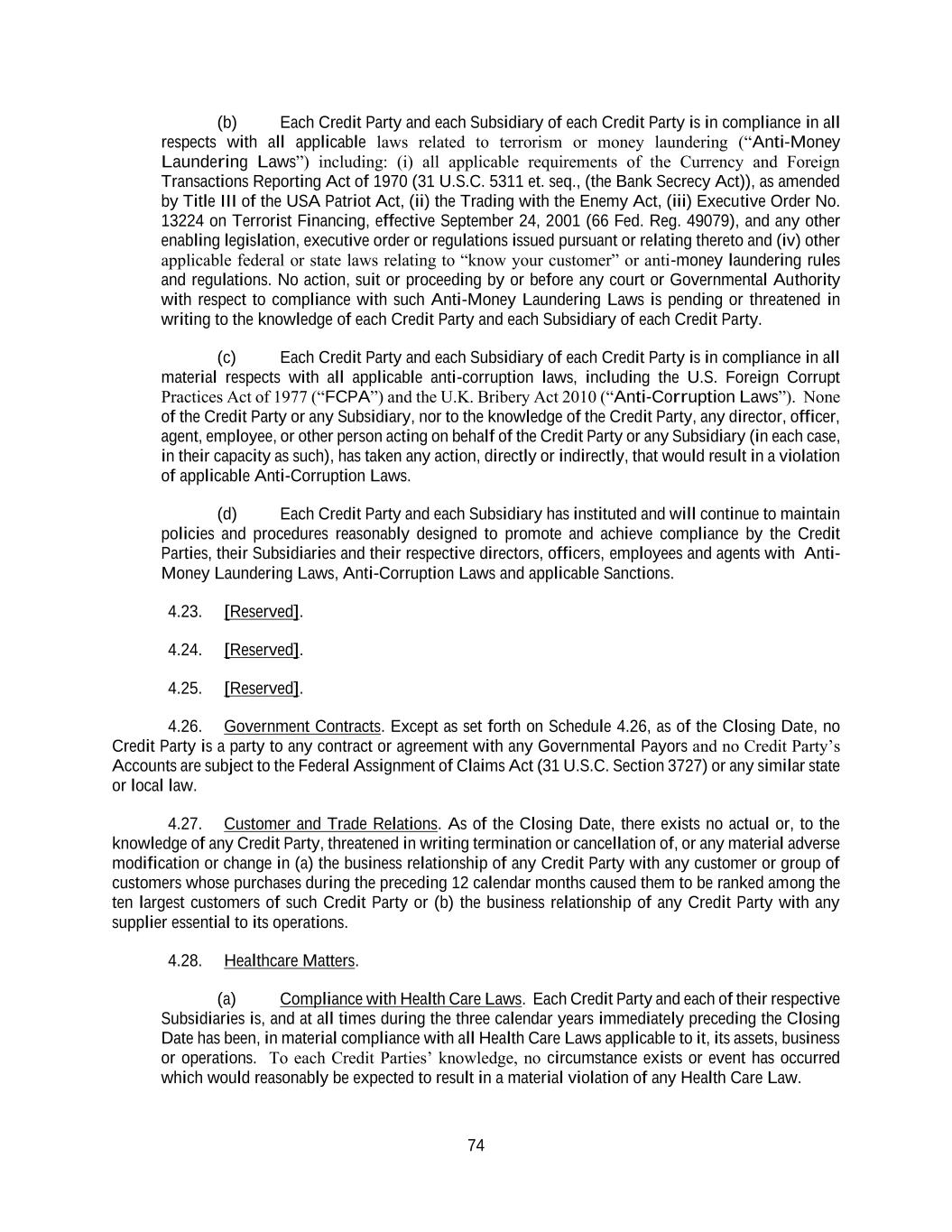 74 (b) Each Credit Party and each Subsidiary of each Credit Party is in compliance in all respects with all applicable laws related to terrorism or money laundering (“Anti-Money Laundering Laws”) including: (i) all applicable requirements of the Currency and Foreign Transactions Reporting Act of 1970 (31 U.S.C. 5311 et. seq., (the Bank Secrecy Act)), as amended by Title III of the USA Patriot Act, (ii) the Trading with the Enemy Act, (iii) Executive Order No. 13224 on Terrorist Financing, effective September 24, 2001 (66 Fed. Reg. 49079), and any other enabling legislation, executive order or regulations issued pursuant or relating thereto and (iv) other applicable federal or state laws relating to “know your customer” or anti-money laundering rules and regulations. No action, suit or proceeding by or before any court or Governmental Authority with respect to compliance with such Anti-Money Laundering Laws is pending or threatened in writing to the knowledge of each Credit Party and each Subsidiary of each Credit Party. (c) Each Credit Party and each Subsidiary of each Credit Party is in compliance in all material respects with all applicable anti-corruption laws, including the U.S. Foreign Corrupt Practices Act of 1977 (“FCPA”) and the U.K. Bribery Act 2010 (“Anti-Corruption Laws”). None of the Credit Party or any Subsidiary, nor to the knowledge of the Credit Party, any director, officer, agent, employee, or other person acting on behalf of the Credit Party or any Subsidiary (in each case, in their capacity as such), has taken any action, directly or indirectly, that would result in a violation of applicable Anti-Corruption Laws. (d) Each Credit Party and each Subsidiary has instituted and will continue to maintain policies and procedures reasonably designed to promote and achieve compliance by the Credit Parties, their Subsidiaries and their respective directors, officers, employees and agents with Anti- Money Laundering Laws, Anti-Corruption Laws and applicable Sanctions. 4.23. [Reserved]. 4.24. [Reserved]. 4.25. [Reserved]. 4.26. Government Contracts. Except as set forth on Schedule 4.26, as of the Closing Date, no Credit Party is a party to any contract or agreement with any Governmental Payors and no Credit Party’s Accounts are subject to the Federal Assignment of Claims Act (31 U.S.C. Section 3727) or any similar state or local law. 4.27. Customer and Trade Relations. As of the Closing Date, there exists no actual or, to the knowledge of any Credit Party, threatened in writing termination or cancellation of, or any material adverse modification or change in (a) the business relationship of any Credit Party with any customer or group of customers whose purchases during the preceding 12 calendar months caused them to be ranked among the ten largest customers of such Credit Party or (b) the business relationship of any Credit Party with any supplier essential to its operations. 4.28. Healthcare Matters. (a) Compliance with Health Care Laws. Each Credit Party and each of their respective Subsidiaries is, and at all times during the three calendar years immediately preceding the Closing Date has been, in material compliance with all Health Care Laws applicable to it, its assets, business or operations. To each Credit Parties’ knowledge, no circumstance exists or event has occurred which would reasonably be expected to result in a material violation of any Health Care Law.
