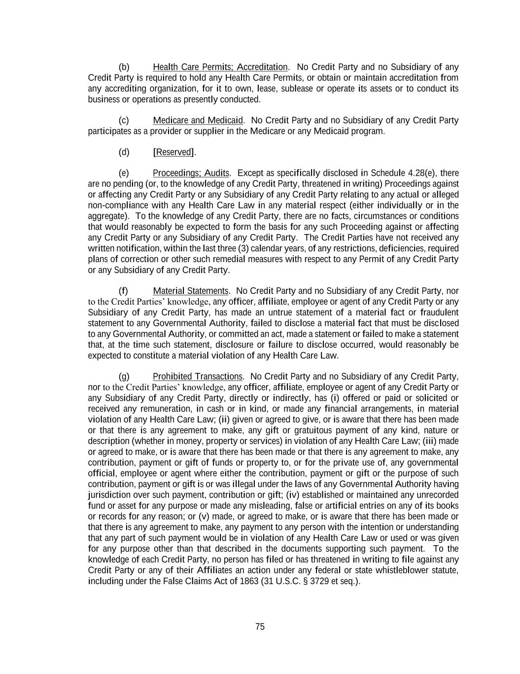75 (b) Health Care Permits; Accreditation. No Credit Party and no Subsidiary of any Credit Party is required to hold any Health Care Permits, or obtain or maintain accreditation from any accrediting organization, for it to own, lease, sublease or operate its assets or to conduct its business or operations as presently conducted. (c) Medicare and Medicaid. No Credit Party and no Subsidiary of any Credit Party participates as a provider or supplier in the Medicare or any Medicaid program. (d) [Reserved]. (e) Proceedings; Audits. Except as specifically disclosed in Schedule 4.28(e), there are no pending (or, to the knowledge of any Credit Party, threatened in writing) Proceedings against or affecting any Credit Party or any Subsidiary of any Credit Party relating to any actual or alleged non-compliance with any Health Care Law in any material respect (either individually or in the aggregate). To the knowledge of any Credit Party, there are no facts, circumstances or conditions that would reasonably be expected to form the basis for any such Proceeding against or affecting any Credit Party or any Subsidiary of any Credit Party. The Credit Parties have not received any written notification, within the last three (3) calendar years, of any restrictions, deficiencies, required plans of correction or other such remedial measures with respect to any Permit of any Credit Party or any Subsidiary of any Credit Party. (f) Material Statements. No Credit Party and no Subsidiary of any Credit Party, nor to the Credit Parties’ knowledge, any officer, affiliate, employee or agent of any Credit Party or any Subsidiary of any Credit Party, has made an untrue statement of a material fact or fraudulent statement to any Governmental Authority, failed to disclose a material fact that must be disclosed to any Governmental Authority, or committed an act, made a statement or failed to make a statement that, at the time such statement, disclosure or failure to disclose occurred, would reasonably be expected to constitute a material violation of any Health Care Law. (g) Prohibited Transactions. No Credit Party and no Subsidiary of any Credit Party, nor to the Credit Parties’ knowledge, any officer, affiliate, employee or agent of any Credit Party or any Subsidiary of any Credit Party, directly or indirectly, has (i) offered or paid or solicited or received any remuneration, in cash or in kind, or made any financial arrangements, in material violation of any Health Care Law; (ii) given or agreed to give, or is aware that there has been made or that there is any agreement to make, any gift or gratuitous payment of any kind, nature or description (whether in money, property or services) in violation of any Health Care Law; (iii) made or agreed to make, or is aware that there has been made or that there is any agreement to make, any contribution, payment or gift of funds or property to, or for the private use of, any governmental official, employee or agent where either the contribution, payment or gift or the purpose of such contribution, payment or gift is or was illegal under the laws of any Governmental Authority having jurisdiction over such payment, contribution or gift; (iv) established or maintained any unrecorded fund or asset for any purpose or made any misleading, false or artificial entries on any of its books or records for any reason; or (v) made, or agreed to make, or is aware that there has been made or that there is any agreement to make, any payment to any person with the intention or understanding that any part of such payment would be in violation of any Health Care Law or used or was given for any purpose other than that described in the documents supporting such payment. To the knowledge of each Credit Party, no person has filed or has threatened in writing to file against any Credit Party or any of their Affiliates an action under any federal or state whistleblower statute, including under the False Claims Act of 1863 (31 U.S.C. § 3729 et seq.).