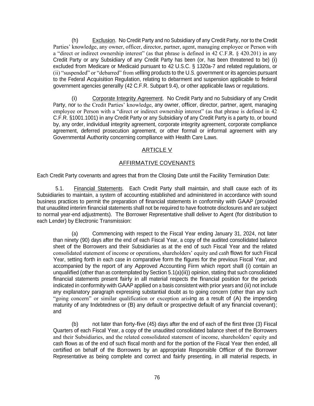 76 (h) Exclusion. No Credit Party and no Subsidiary of any Credit Party, nor to the Credit Parties’ knowledge, any owner, officer, director, partner, agent, managing employee or Person with a “direct or indirect ownership interest” (as that phrase is defined in 42 C.F.R. § 420.201) in any Credit Party or any Subsidiary of any Credit Party has been (or, has been threatened to be) (i) excluded from Medicare or Medicaid pursuant to 42 U.S.C. § 1320a-7 and related regulations, or (ii) “suspended” or “debarred” from selling products to the U.S. government or its agencies pursuant to the Federal Acquisition Regulation, relating to debarment and suspension applicable to federal government agencies generally (42 C.F.R. Subpart 9.4), or other applicable laws or regulations. (i) Corporate Integrity Agreement. No Credit Party and no Subsidiary of any Credit Party, nor to the Credit Parties’ knowledge, any owner, officer, director, partner, agent, managing employee or Person with a “direct or indirect ownership interest” (as that phrase is defined in 42 C.F.R. §1001.1001) in any Credit Party or any Subsidiary of any Credit Party is a party to, or bound by, any order, individual integrity agreement, corporate integrity agreement, corporate compliance agreement, deferred prosecution agreement, or other formal or informal agreement with any Governmental Authority concerning compliance with Health Care Laws. ARTICLE V AFFIRMATIVE COVENANTS Each Credit Party covenants and agrees that from the Closing Date until the Facility Termination Date: 5.1. Financial Statements. Each Credit Party shall maintain, and shall cause each of its Subsidiaries to maintain, a system of accounting established and administered in accordance with sound business practices to permit the preparation of financial statements in conformity with GAAP (provided that unaudited interim financial statements shall not be required to have footnote disclosures and are subject to normal year-end adjustments). The Borrower Representative shall deliver to Agent (for distribution to each Lender) by Electronic Transmission: (a) Commencing with respect to the Fiscal Year ending January 31, 2024, not later than ninety (90) days after the end of each Fiscal Year, a copy of the audited consolidated balance sheet of the Borrowers and their Subsidiaries as at the end of such Fiscal Year and the related consolidated statement of income or operations, shareholders’ equity and cash flows for such Fiscal Year, setting forth in each case in comparative form the figures for the previous Fiscal Year, and accompanied by the report of any Approved Accounting Firm which report shall (i) contain an unqualified (other than as contemplated by Section 5.1(a)(ii)) opinion, stating that such consolidated financial statements present fairly in all material respects the financial position for the periods indicated in conformity with GAAP applied on a basis consistent with prior years and (ii) not include any explanatory paragraph expressing substantial doubt as to going concern (other than any such “going concern” or similar qualification or exception arising as a result of (A) the impending maturity of any Indebtedness or (B) any default or prospective default of any financial covenant); and (b) not later than forty-five (45) days after the end of each of the first three (3) Fiscal Quarters of each Fiscal Year, a copy of the unaudited consolidated balance sheet of the Borrowers and their Subsidiaries, and the related consolidated statement of income, shareholders’ equity and cash flows as of the end of such fiscal month and for the portion of the Fiscal Year then ended, all certified on behalf of the Borrowers by an appropriate Responsible Officer of the Borrower Representative as being complete and correct and fairly presenting, in all material respects, in