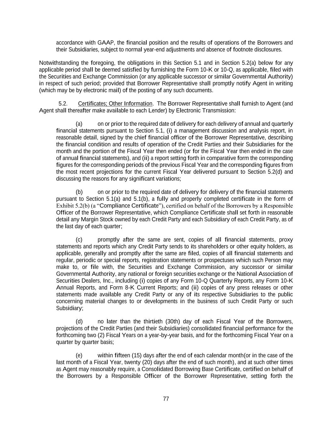 77 accordance with GAAP, the financial position and the results of operations of the Borrowers and their Subsidiaries, subject to normal year-end adjustments and absence of footnote disclosures. Notwithstanding the foregoing, the obligations in this Section 5.1 and in Section 5.2(a) below for any applicable period shall be deemed satisfied by furnishing the Form 10-K or 10-Q, as applicable, filed with the Securities and Exchange Commission (or any applicable successor or similar Governmental Authority) in respect of such period; provided that Borrower Representative shall promptly notify Agent in writing (which may be by electronic mail) of the posting of any such documents. 5.2. Certificates; Other Information. The Borrower Representative shall furnish to Agent (and Agent shall thereafter make available to each Lender) by Electronic Transmission: (a) on or prior to the required date of delivery for each delivery of annual and quarterly financial statements pursuant to Section 5.1, (i) a management discussion and analysis report, in reasonable detail, signed by the chief financial officer of the Borrower Representative, describing the financial condition and results of operation of the Credit Parties and their Subsidiaries for the month and the portion of the Fiscal Year then ended (or for the Fiscal Year then ended in the case of annual financial statements), and (ii) a report setting forth in comparative form the corresponding figures for the corresponding periods of the previous Fiscal Year and the corresponding figures from the most recent projections for the current Fiscal Year delivered pursuant to Section 5.2(d) and discussing the reasons for any significant variations; (b) on or prior to the required date of delivery for delivery of the financial statements pursuant to Section 5.1(a) and 5.1(b), a fully and properly completed certificate in the form of Exhibit 5.2(b) (a “Compliance Certificate”), certified on behalf of the Borrowers by a Responsible Officer of the Borrower Representative, which Compliance Certificate shall set forth in reasonable detail any Margin Stock owned by each Credit Party and each Subsidiary of each Credit Party, as of the last day of each quarter; (c) promptly after the same are sent, copies of all financial statements, proxy statements and reports which any Credit Party sends to its shareholders or other equity holders, as applicable, generally and promptly after the same are filed, copies of all financial statements and regular, periodic or special reports, registration statements or prospectuses which such Person may make to, or file with, the Securities and Exchange Commission, any successor or similar Governmental Authority, any national or foreign securities exchange or the National Association of Securities Dealers, Inc., including (i) copies of any Form 10-Q Quarterly Reports, any Form 10-K Annual Reports, and Form 8-K Current Reports; and (ii) copies of any press releases or other statements made available any Credit Party or any of its respective Subsidiaries to the public concerning material changes to or developments in the business of such Credit Party or such Subsidiary; (d) no later than the thirtieth (30th) day of each Fiscal Year of the Borrowers, projections of the Credit Parties (and their Subsidiaries) consolidated financial performance for the forthcoming two (2) Fiscal Years on a year-by-year basis, and for the forthcoming Fiscal Year on a quarter by quarter basis; (e) within fifteen (15) days after the end of each calendar month(or in the case of the last month of a Fiscal Year, twenty (20) days after the end of such month), and at such other times as Agent may reasonably require, a Consolidated Borrowing Base Certificate, certified on behalf of the Borrowers by a Responsible Officer of the Borrower Representative, setting forth the