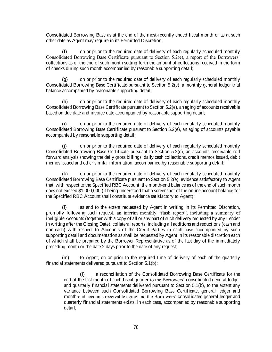78 Consolidated Borrowing Base as at the end of the most-recently ended fiscal month or as at such other date as Agent may require in its Permitted Discretion; (f) on or prior to the required date of delivery of each regularly scheduled monthly Consolidated Borrowing Base Certificate pursuant to Section 5.2(e), a report of the Borrowers’ collections as of the end of such month setting forth the amount of collections received in the form of checks during such month accompanied by reasonable supporting detail; (g) on or prior to the required date of delivery of each regularly scheduled monthly Consolidated Borrowing Base Certificate pursuant to Section 5.2(e), a monthly general ledger trial balance accompanied by reasonable supporting detail; (h) on or prior to the required date of delivery of each regularly scheduled monthly Consolidated Borrowing Base Certificate pursuant to Section 5.2(e), an aging of accounts receivable based on due date and invoice date accompanied by reasonable supporting detail; (i) on or prior to the required date of delivery of each regularly scheduled monthly Consolidated Borrowing Base Certificate pursuant to Section 5.2(e), an aging of accounts payable accompanied by reasonable supporting detail; (j) on or prior to the required date of delivery of each regularly scheduled monthly Consolidated Borrowing Base Certificate pursuant to Section 5.2(e), an accounts receivable roll forward analysis showing the daily gross billings, daily cash collections, credit memos issued, debit memos issued and other similar information, accompanied by reasonable supporting detail; (k) on or prior to the required date of delivery of each regularly scheduled monthly Consolidated Borrowing Base Certificate pursuant to Section 5.2(e), evidence satisfactory to Agent that, with respect to the Specified RBC Account, the month-end balance as of the end of such month does not exceed $1,000,000 (it being understood that a screenshot of the online account balance for the Specified RBC Account shall constitute evidence satisfactory to Agent); (l) as and to the extent requested by Agent in writing in its Permitted Discretion, promptly following such request, an interim monthly “flash report”, including a summary of ineligible Accounts (together with a copy of all or any part of such delivery requested by any Lender in writing after the Closing Date), collateral reports, including all additions and reductions (cash and non-cash) with respect to Accounts of the Credit Parties in each case accompanied by such supporting detail and documentation as shall be requested by Agent in its reasonable discretion each of which shall be prepared by the Borrower Representative as of the last day of the immediately preceding month or the date 2 days prior to the date of any request; (m) to Agent, on or prior to the required time of delivery of each of the quarterly financial statements delivered pursuant to Section 5.1(b); (i) a reconciliation of the Consolidated Borrowing Base Certificate for the end of the last month of such fiscal quarter to the Borrowers’ consolidated general ledger and quarterly financial statements delivered pursuant to Section 5.1(b), to the extent any variance between such Consolidated Borrowing Base Certificate, general ledger and month-end accounts receivable aging and the Borrowers’ consolidated general ledger and quarterly financial statements exists, in each case, accompanied by reasonable supporting detail;