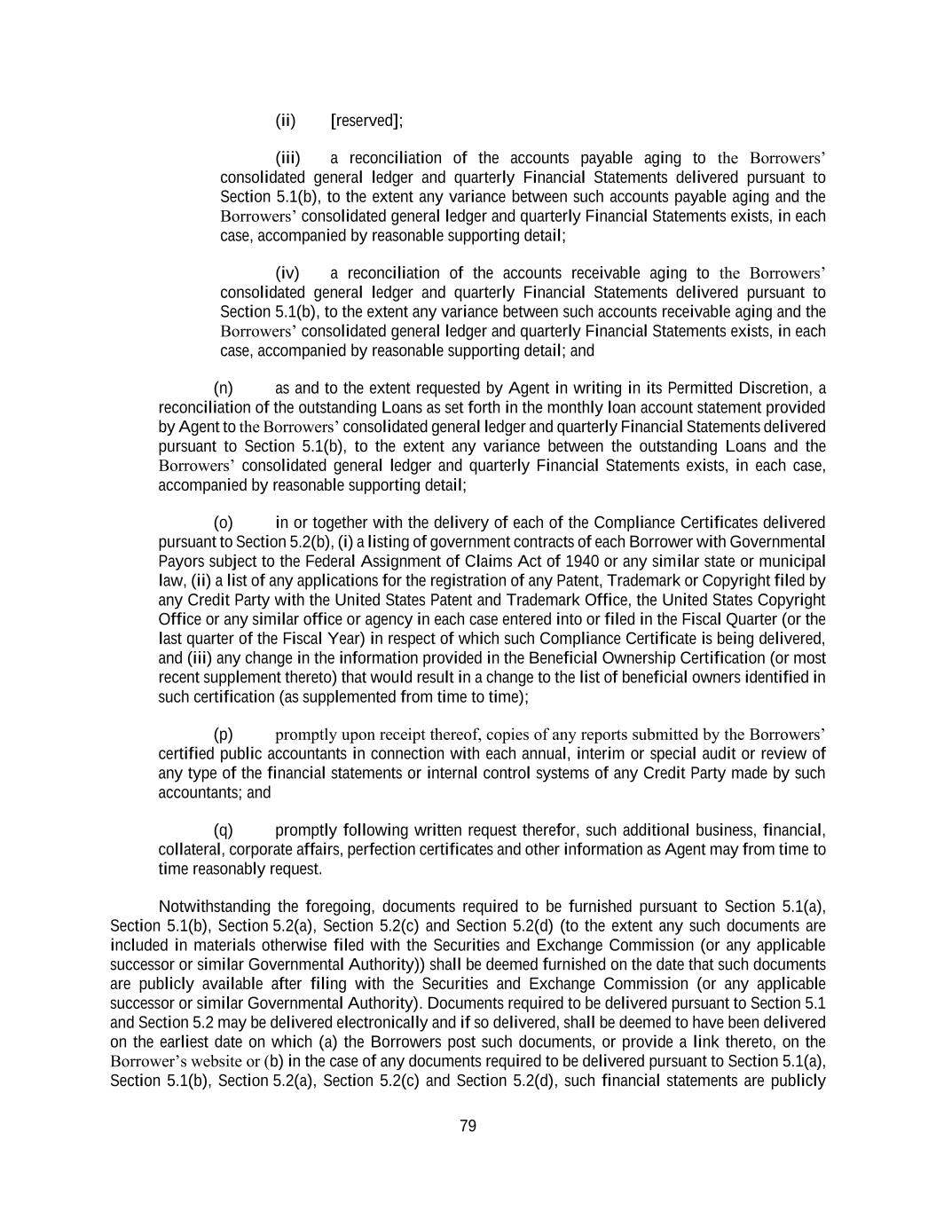 79 (ii) [reserved]; (iii) a reconciliation of the accounts payable aging to the Borrowers’ consolidated general ledger and quarterly Financial Statements delivered pursuant to Section 5.1(b), to the extent any variance between such accounts payable aging and the Borrowers’ consolidated general ledger and quarterly Financial Statements exists, in each case, accompanied by reasonable supporting detail; (iv) a reconciliation of the accounts receivable aging to the Borrowers’ consolidated general ledger and quarterly Financial Statements delivered pursuant to Section 5.1(b), to the extent any variance between such accounts receivable aging and the Borrowers’ consolidated general ledger and quarterly Financial Statements exists, in each case, accompanied by reasonable supporting detail; and (n) as and to the extent requested by Agent in writing in its Permitted Discretion, a reconciliation of the outstanding Loans as set forth in the monthly loan account statement provided by Agent to the Borrowers’ consolidated general ledger and quarterly Financial Statements delivered pursuant to Section 5.1(b), to the extent any variance between the outstanding Loans and the Borrowers’ consolidated general ledger and quarterly Financial Statements exists, in each case, accompanied by reasonable supporting detail; (o) in or together with the delivery of each of the Compliance Certificates delivered pursuant to Section 5.2(b), (i) a listing of government contracts of each Borrower with Governmental Payors subject to the Federal Assignment of Claims Act of 1940 or any similar state or municipal law, (ii) a list of any applications for the registration of any Patent, Trademark or Copyright filed by any Credit Party with the United States Patent and Trademark Office, the United States Copyright Office or any similar office or agency in each case entered into or filed in the Fiscal Quarter (or the last quarter of the Fiscal Year) in respect of which such Compliance Certificate is being delivered, and (iii) any change in the information provided in the Beneficial Ownership Certification (or most recent supplement thereto) that would result in a change to the list of beneficial owners identified in such certification (as supplemented from time to time); (p) promptly upon receipt thereof, copies of any reports submitted by the Borrowers’ certified public accountants in connection with each annual, interim or special audit or review of any type of the financial statements or internal control systems of any Credit Party made by such accountants; and (q) promptly following written request therefor, such additional business, financial, collateral, corporate affairs, perfection certificates and other information as Agent may from time to time reasonably request. Notwithstanding the foregoing, documents required to be furnished pursuant to Section 5.1(a), Section 5.1(b), Section 5.2(a), Section 5.2(c) and Section 5.2(d) (to the extent any such documents are included in materials otherwise filed with the Securities and Exchange Commission (or any applicable successor or similar Governmental Authority)) shall be deemed furnished on the date that such documents are publicly available after filing with the Securities and Exchange Commission (or any applicable successor or similar Governmental Authority). Documents required to be delivered pursuant to Section 5.1 and Section 5.2 may be delivered electronically and if so delivered, shall be deemed to have been delivered on the earliest date on which (a) the Borrowers post such documents, or provide a link thereto, on the Borrower’s website or (b) in the case of any documents required to be delivered pursuant to Section 5.1(a), Section 5.1(b), Section 5.2(a), Section 5.2(c) and Section 5.2(d), such financial statements are publicly