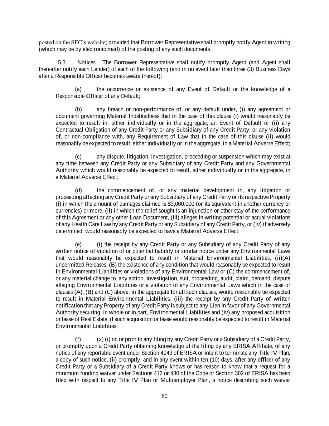 80 posted on the SEC’s website; provided that Borrower Representative shall promptly notify Agent in writing (which may be by electronic mail) of the posting of any such documents. 5.3. Notices. The Borrower Representative shall notify promptly Agent (and Agent shall thereafter notify each Lender) of each of the following (and in no event later than three (3) Business Days after a Responsible Officer becomes aware thereof): (a) the occurrence or existence of any Event of Default or the knowledge of a Responsible Officer of any Default; (b) any breach or non-performance of, or any default under, (i) any agreement or document governing Material Indebtedness that in the case of this clause (i) would reasonably be expected to result in, either individually or in the aggregate, an Event of Default or (ii) any Contractual Obligation of any Credit Party or any Subsidiary of any Credit Party, or any violation of, or non-compliance with, any Requirement of Law that in the case of this clause (ii) would reasonably be expected to result, either individually or in the aggregate, in a Material Adverse Effect; (c) any dispute, litigation, investigation, proceeding or suspension which may exist at any time between any Credit Party or any Subsidiary of any Credit Party and any Governmental Authority which would reasonably be expected to result, either individually or in the aggregate, in a Material Adverse Effect; (d) the commencement of, or any material development in, any litigation or proceeding affecting any Credit Party or any Subsidiary of any Credit Party or its respective Property (i) in which the amount of damages claimed is $3,000,000 (or its equivalent in another currency or currencies) or more, (ii) in which the relief sought is an injunction or other stay of the performance of this Agreement or any other Loan Document, (iii) alleges in writing potential or actual violations of any Health Care Law by any Credit Party or any Subsidiary of any Credit Party, or (iv) if adversely determined, would reasonably be expected to have a Material Adverse Effect; (e) (i) the receipt by any Credit Party or any Subsidiary of any Credit Party of any written notice of violation of or potential liability or similar notice under any Environmental Laws that would reasonably be expected to result in Material Environmental Liabilities, (ii)(A) unpermitted Releases, (B) the existence of any condition that would reasonably be expected to result in Environmental Liabilities or violations of any Environmental Law or (C) the commencement of, or any material change to, any action, investigation, suit, proceeding, audit, claim, demand, dispute alleging Environmental Liabilities or a violation of any Environmental Laws which in the case of clauses (A), (B) and (C) above, in the aggregate for all such clauses, would reasonably be expected to result in Material Environmental Liabilities, (iii) the receipt by any Credit Party of written notification that any Property of any Credit Party is subject to any Lien in favor of any Governmental Authority securing, in whole or in part, Environmental Liabilities and (iv) any proposed acquisition or lease of Real Estate, if such acquisition or lease would reasonably be expected to result in Material Environmental Liabilities; (f) (x) (i) on or prior to any filing by any Credit Party or a Subsidiary of a Credit Party, or promptly upon a Credit Party obtaining knowledge of the filing by any ERISA Affiliate, of any notice of any reportable event under Section 4043 of ERISA or intent to terminate any Title IV Plan, a copy of such notice, (ii) promptly, and in any event within ten (10) days, after any officer of any Credit Party or a Subsidiary of a Credit Party knows or has reason to know that a request for a minimum funding waiver under Sections 412 or 430 of the Code or Section 302 of ERISA has been filed with respect to any Title IV Plan or Multiemployer Plan, a notice describing such waiver