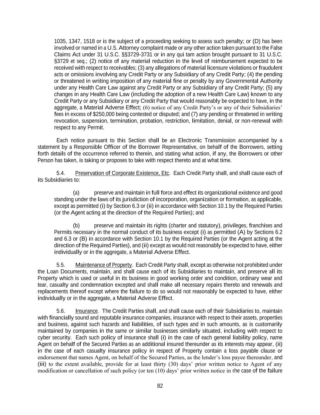 82 1035, 1347, 1518 or is the subject of a proceeding seeking to assess such penalty; or (D) has been involved or named in a U.S. Attorney complaint made or any other action taken pursuant to the False Claims Act under 31 U.S.C. §§3729-3731 or in any qui tam action brought pursuant to 31 U.S.C. §3729 et seq.; (2) notice of any material reduction in the level of reimbursement expected to be received with respect to receivables; (3) any allegations of material licensure violations or fraudulent acts or omissions involving any Credit Party or any Subsidiary of any Credit Party; (4) the pending or threatened in writing imposition of any material fine or penalty by any Governmental Authority under any Health Care Law against any Credit Party or any Subsidiary of any Credit Party; (5) any changes in any Health Care Law (including the adoption of a new Health Care Law) known to any Credit Party or any Subsidiary or any Credit Party that would reasonably be expected to have, in the aggregate, a Material Adverse Effect; (6) notice of any Credit Party’s or any of their Subsidiaries’ fees in excess of $250,000 being contested or disputed; and (7) any pending or threatened in writing revocation, suspension, termination, probation, restriction, limitation, denial, or non-renewal with respect to any Permit. Each notice pursuant to this Section shall be an Electronic Transmission accompanied by a statement by a Responsible Officer of the Borrower Representative, on behalf of the Borrowers, setting forth details of the occurrence referred to therein, and stating what action, if any, the Borrowers or other Person has taken, is taking or proposes to take with respect thereto and at what time. 5.4. Preservation of Corporate Existence, Etc. Each Credit Party shall, and shall cause each of its Subsidiaries to: (a) preserve and maintain in full force and effect its organizational existence and good standing under the laws of its jurisdiction of incorporation, organization or formation, as applicable, except as permitted (i) by Section 6.3 or (ii) in accordance with Section 10.1 by the Required Parties (or the Agent acting at the direction of the Required Parties); and (b) preserve and maintain its rights (charter and statutory), privileges, franchises and Permits necessary in the normal conduct of its business except (i) as permitted (A) by Sections 6.2 and 6.3 or (B) in accordance with Section 10.1 by the Required Parties (or the Agent acting at the direction of the Required Parties), and (ii) except as would not reasonably be expected to have, either individually or in the aggregate, a Material Adverse Effect. 5.5. Maintenance of Property. Each Credit Party shall, except as otherwise not prohibited under the Loan Documents, maintain, and shall cause each of its Subsidiaries to maintain, and preserve all its Property which is used or useful in its business in good working order and condition, ordinary wear and tear, casualty and condemnation excepted and shall make all necessary repairs thereto and renewals and replacements thereof except where the failure to do so would not reasonably be expected to have, either individually or in the aggregate, a Material Adverse Effect. 5.6. Insurance. The Credit Parties shall, and shall cause each of their Subsidiaries to, maintain with financially sound and reputable insurance companies, insurance with respect to their assets, properties and business, against such hazards and liabilities, of such types and in such amounts, as is customarily maintained by companies in the same or similar businesses similarly situated, including with respect to cyber security. Each such policy of insurance shall (i) in the case of each general liability policy, name Agent on behalf of the Secured Parties as an additional insured thereunder as its interests may appear, (ii) in the case of each casualty insurance policy in respect of Property contain a loss payable clause or endorsement that names Agent, on behalf of the Secured Parties, as the lender’s loss payee thereunder, and (iii) to the extent available, provide for at least thirty (30) days’ prior written notice to Agent of any modification or cancellation of such policy (or ten (10) days’ prior written notice in the case of the failure