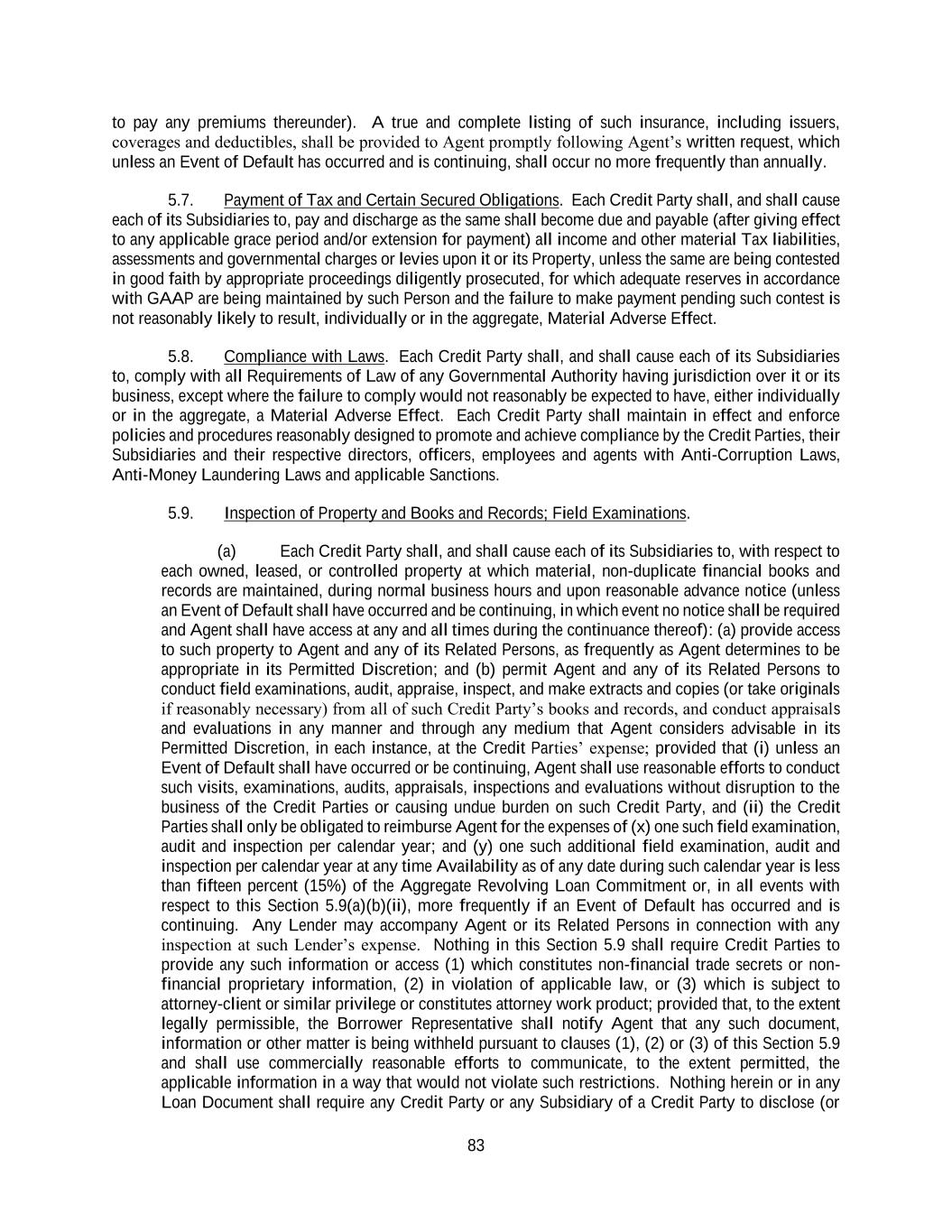 83 to pay any premiums thereunder). A true and complete listing of such insurance, including issuers, coverages and deductibles, shall be provided to Agent promptly following Agent’s written request, which unless an Event of Default has occurred and is continuing, shall occur no more frequently than annually. 5.7. Payment of Tax and Certain Secured Obligations. Each Credit Party shall, and shall cause each of its Subsidiaries to, pay and discharge as the same shall become due and payable (after giving effect to any applicable grace period and/or extension for payment) all income and other material Tax liabilities, assessments and governmental charges or levies upon it or its Property, unless the same are being contested in good faith by appropriate proceedings diligently prosecuted, for which adequate reserves in accordance with GAAP are being maintained by such Person and the failure to make payment pending such contest is not reasonably likely to result, individually or in the aggregate, Material Adverse Effect. 5.8. Compliance with Laws. Each Credit Party shall, and shall cause each of its Subsidiaries to, comply with all Requirements of Law of any Governmental Authority having jurisdiction over it or its business, except where the failure to comply would not reasonably be expected to have, either individually or in the aggregate, a Material Adverse Effect. Each Credit Party shall maintain in effect and enforce policies and procedures reasonably designed to promote and achieve compliance by the Credit Parties, their Subsidiaries and their respective directors, officers, employees and agents with Anti-Corruption Laws, Anti-Money Laundering Laws and applicable Sanctions. 5.9. Inspection of Property and Books and Records; Field Examinations. (a) Each Credit Party shall, and shall cause each of its Subsidiaries to, with respect to each owned, leased, or controlled property at which material, non-duplicate financial books and records are maintained, during normal business hours and upon reasonable advance notice (unless an Event of Default shall have occurred and be continuing, in which event no notice shall be required and Agent shall have access at any and all times during the continuance thereof): (a) provide access to such property to Agent and any of its Related Persons, as frequently as Agent determines to be appropriate in its Permitted Discretion; and (b) permit Agent and any of its Related Persons to conduct field examinations, audit, appraise, inspect, and make extracts and copies (or take originals if reasonably necessary) from all of such Credit Party’s books and records, and conduct appraisals and evaluations in any manner and through any medium that Agent considers advisable in its Permitted Discretion, in each instance, at the Credit Parties’ expense; provided that (i) unless an Event of Default shall have occurred or be continuing, Agent shall use reasonable efforts to conduct such visits, examinations, audits, appraisals, inspections and evaluations without disruption to the business of the Credit Parties or causing undue burden on such Credit Party, and (ii) the Credit Parties shall only be obligated to reimburse Agent for the expenses of (x) one such field examination, audit and inspection per calendar year; and (y) one such additional field examination, audit and inspection per calendar year at any time Availability as of any date during such calendar year is less than fifteen percent (15%) of the Aggregate Revolving Loan Commitment or, in all events with respect to this Section 5.9(a)(b)(ii), more frequently if an Event of Default has occurred and is continuing. Any Lender may accompany Agent or its Related Persons in connection with any inspection at such Lender’s expense. Nothing in this Section 5.9 shall require Credit Parties to provide any such information or access (1) which constitutes non-financial trade secrets or non- financial proprietary information, (2) in violation of applicable law, or (3) which is subject to attorney-client or similar privilege or constitutes attorney work product; provided that, to the extent legally permissible, the Borrower Representative shall notify Agent that any such document, information or other matter is being withheld pursuant to clauses (1), (2) or (3) of this Section 5.9 and shall use commercially reasonable efforts to communicate, to the extent permitted, the applicable information in a way that would not violate such restrictions. Nothing herein or in any Loan Document shall require any Credit Party or any Subsidiary of a Credit Party to disclose (or
