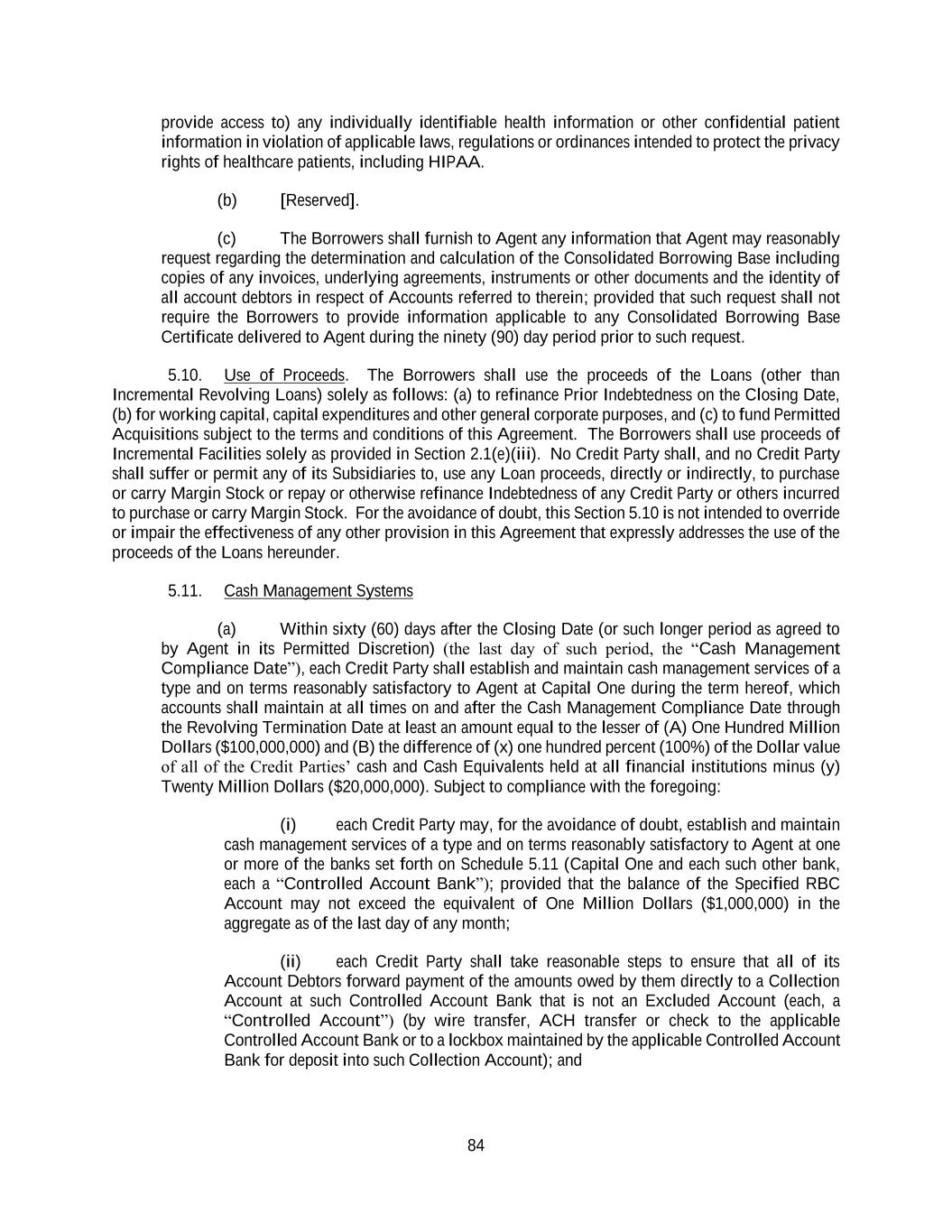 84 provide access to) any individually identifiable health information or other confidential patient information in violation of applicable laws, regulations or ordinances intended to protect the privacy rights of healthcare patients, including HIPAA. (b) [Reserved]. (c) The Borrowers shall furnish to Agent any information that Agent may reasonably request regarding the determination and calculation of the Consolidated Borrowing Base including copies of any invoices, underlying agreements, instruments or other documents and the identity of all account debtors in respect of Accounts referred to therein; provided that such request shall not require the Borrowers to provide information applicable to any Consolidated Borrowing Base Certificate delivered to Agent during the ninety (90) day period prior to such request. 5.10. Use of Proceeds. The Borrowers shall use the proceeds of the Loans (other than Incremental Revolving Loans) solely as follows: (a) to refinance Prior Indebtedness on the Closing Date, (b) for working capital, capital expenditures and other general corporate purposes, and (c) to fund Permitted Acquisitions subject to the terms and conditions of this Agreement. The Borrowers shall use proceeds of Incremental Facilities solely as provided in Section 2.1(e)(iii). No Credit Party shall, and no Credit Party shall suffer or permit any of its Subsidiaries to, use any Loan proceeds, directly or indirectly, to purchase or carry Margin Stock or repay or otherwise refinance Indebtedness of any Credit Party or others incurred to purchase or carry Margin Stock. For the avoidance of doubt, this Section 5.10 is not intended to override or impair the effectiveness of any other provision in this Agreement that expressly addresses the use of the proceeds of the Loans hereunder. 5.11. Cash Management Systems (a) Within sixty (60) days after the Closing Date (or such longer period as agreed to by Agent in its Permitted Discretion) (the last day of such period, the “Cash Management Compliance Date”), each Credit Party shall establish and maintain cash management services of a type and on terms reasonably satisfactory to Agent at Capital One during the term hereof, which accounts shall maintain at all times on and after the Cash Management Compliance Date through the Revolving Termination Date at least an amount equal to the lesser of (A) One Hundred Million Dollars ($100,000,000) and (B) the difference of (x) one hundred percent (100%) of the Dollar value of all of the Credit Parties’ cash and Cash Equivalents held at all financial institutions minus (y) Twenty Million Dollars ($20,000,000). Subject to compliance with the foregoing: (i) each Credit Party may, for the avoidance of doubt, establish and maintain cash management services of a type and on terms reasonably satisfactory to Agent at one or more of the banks set forth on Schedule 5.11 (Capital One and each such other bank, each a “Controlled Account Bank”); provided that the balance of the Specified RBC Account may not exceed the equivalent of One Million Dollars ($1,000,000) in the aggregate as of the last day of any month; (ii) each Credit Party shall take reasonable steps to ensure that all of its Account Debtors forward payment of the amounts owed by them directly to a Collection Account at such Controlled Account Bank that is not an Excluded Account (each, a “Controlled Account”) (by wire transfer, ACH transfer or check to the applicable Controlled Account Bank or to a lockbox maintained by the applicable Controlled Account Bank for deposit into such Collection Account); and