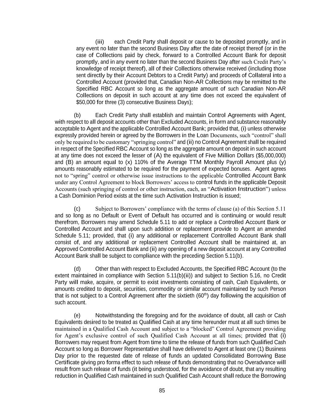 85 (iii) each Credit Party shall deposit or cause to be deposited promptly, and in any event no later than the second Business Day after the date of receipt thereof (or in the case of Collections paid by check, forward to a Controlled Account Bank for deposit promptly, and in any event no later than the second Business Day after such Credit Party’s knowledge of receipt thereof), all of their Collections otherwise received (including those sent directly by their Account Debtors to a Credit Party) and proceeds of Collateral into a Controlled Account (provided that, Canadian Non-AR Collections may be remitted to the Specified RBC Account so long as the aggregate amount of such Canadian Non-AR Collections on deposit in such account at any time does not exceed the equivalent of $50,000 for three (3) consecutive Business Days); (b) Each Credit Party shall establish and maintain Control Agreements with Agent, with respect to all deposit accounts other than Excluded Accounts, in form and substance reasonably acceptable to Agent and the applicable Controlled Account Bank; provided that, (i) unless otherwise expressly provided herein or agreed by the Borrowers in the Loan Documents, such “control” shall only be required to be customary “springing control” and (ii) no Control Agreement shall be required in respect of the Specified RBC Account so long as the aggregate amount on deposit in such account at any time does not exceed the lesser of (A) the equivalent of Five Million Dollars ($5,000,000) and (B) an amount equal to (x) 110% of the Average TTM Monthly Payroll Amount plus (y) amounts reasonably estimated to be required for the payment of expected bonuses. Agent agrees not to “spring” control or otherwise issue instructions to the applicable Controlled Account Bank under any Control Agreement to block Borrowers’ access to control funds in the applicable Deposit Accounts (such springing of control or other instruction, each, an “Activation Instruction”) unless a Cash Dominion Period exists at the time such Activation Instruction is issued; (c) Subject to Borrowers’ compliance with the terms of clause (a) of this Section 5.11 and so long as no Default or Event of Default has occurred and is continuing or would result therefrom, Borrowers may amend Schedule 5.11 to add or replace a Controlled Account Bank or Controlled Account and shall upon such addition or replacement provide to Agent an amended Schedule 5.11; provided, that (i) any additional or replacement Controlled Account Bank shall consist of, and any additional or replacement Controlled Account shall be maintained at, an Approved Controlled Account Bank and (ii) any opening of a new deposit account at any Controlled Account Bank shall be subject to compliance with the preceding Section 5.11(b). (d) Other than with respect to Excluded Accounts, the Specified RBC Account (to the extent maintained in compliance with Section 5.11(b)(ii)) and subject to Section 5.16, no Credit Party will make, acquire, or permit to exist investments consisting of cash, Cash Equivalents, or amounts credited to deposit, securities, commodity or similar account maintained by such Person that is not subject to a Control Agreement after the sixtieth (60th) day following the acquisition of such account. (e) Notwithstanding the foregoing and for the avoidance of doubt, all cash or Cash Equivalents desired to be treated as Qualified Cash at any time hereunder must at all such times be maintained in a Qualified Cash Account and subject to a “blocked” Control Agreement providing for Agent’s exclusive control of such Qualified Cash Account at all times; provided that (i) Borrowers may request from Agent from time to time the release of funds from such Qualified Cash Account so long as Borrower Representative shall have delivered to Agent at least one (1) Business Day prior to the requested date of release of funds an updated Consolidated Borrowing Base Certificate giving pro forma effect to such release of funds demonstrating that no Overadvance will result from such release of funds (it being understood, for the avoidance of doubt, that any resulting reduction in Qualified Cash maintained in such Qualified Cash Account shall reduce the Borrowing