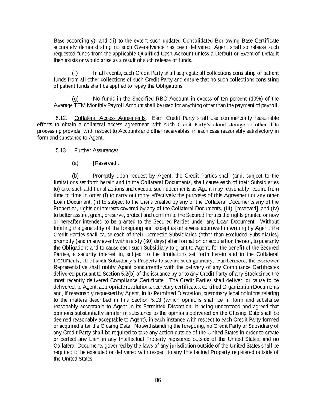 86 Base accordingly), and (ii) to the extent such updated Consolidated Borrowing Base Certificate accurately demonstrating no such Overadvance has been delivered, Agent shall so release such requested funds from the applicable Qualified Cash Account unless a Default or Event of Default then exists or would arise as a result of such release of funds. (f) In all events, each Credit Party shall segregate all collections consisting of patient funds from all other collections of such Credit Party and ensure that no such collections consisting of patient funds shall be applied to repay the Obligations. (g) No funds in the Specified RBC Account in excess of ten percent (10%) of the Average TTM Monthly Payroll Amount shall be used for anything other than the payment of payroll. 5.12. Collateral Access Agreements. Each Credit Party shall use commercially reasonable efforts to obtain a collateral access agreement with such Credit Party’s cloud storage or other data processing provider with respect to Accounts and other receivables, in each case reasonably satisfactory in form and substance to Agent. 5.13. Further Assurances. (a) [Reserved]. (b) Promptly upon request by Agent, the Credit Parties shall (and, subject to the limitations set forth herein and in the Collateral Documents, shall cause each of their Subsidiaries to) take such additional actions and execute such documents as Agent may reasonably require from time to time in order (i) to carry out more effectively the purposes of this Agreement or any other Loan Document, (ii) to subject to the Liens created by any of the Collateral Documents any of the Properties, rights or interests covered by any of the Collateral Documents, (iii) [reserved], and (iv) to better assure, grant, preserve, protect and confirm to the Secured Parties the rights granted or now or hereafter intended to be granted to the Secured Parties under any Loan Document. Without limiting the generality of the foregoing and except as otherwise approved in writing by Agent, the Credit Parties shall cause each of their Domestic Subsidiaries (other than Excluded Subsidiaries) promptly (and in any event within sixty (60) days) after formation or acquisition thereof, to guaranty the Obligations and to cause each such Subsidiary to grant to Agent, for the benefit of the Secured Parties, a security interest in, subject to the limitations set forth herein and in the Collateral Documents, all of such Subsidiary’s Property to secure such guaranty. Furthermore, the Borrower Representative shall notify Agent concurrently with the delivery of any Compliance Certificates delivered pursuant to Section 5.2(b) of the issuance by or to any Credit Party of any Stock since the most recently delivered Compliance Certificate. The Credit Parties shall deliver, or cause to be delivered, to Agent, appropriate resolutions, secretary certificates, certified Organization Documents and, if reasonably requested by Agent, in its Permitted Discretion, customary legal opinions relating to the matters described in this Section 5.13 (which opinions shall be in form and substance reasonably acceptable to Agent in its Permitted Discretion, it being understood and agreed that opinions substantially similar in substance to the opinions delivered on the Closing Date shall be deemed reasonably acceptable to Agent), in each instance with respect to each Credit Party formed or acquired after the Closing Date. Notwithstanding the foregoing, no Credit Party or Subsidiary of any Credit Party shall be required to take any action outside of the United States in order to create or perfect any Lien in any Intellectual Property registered outside of the United States, and no Collateral Documents governed by the laws of any jurisdiction outside of the United States shall be required to be executed or delivered with respect to any Intellectual Property registered outside of the United States.