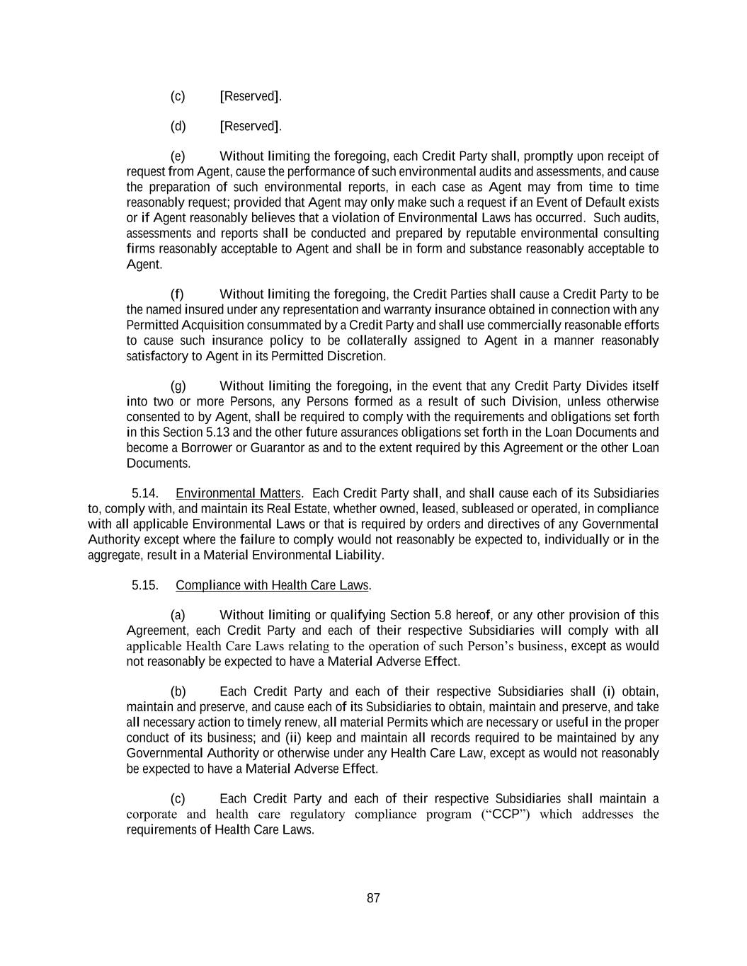 87 (c) [Reserved]. (d) [Reserved]. (e) Without limiting the foregoing, each Credit Party shall, promptly upon receipt of request from Agent, cause the performance of such environmental audits and assessments, and cause the preparation of such environmental reports, in each case as Agent may from time to time reasonably request; provided that Agent may only make such a request if an Event of Default exists or if Agent reasonably believes that a violation of Environmental Laws has occurred. Such audits, assessments and reports shall be conducted and prepared by reputable environmental consulting firms reasonably acceptable to Agent and shall be in form and substance reasonably acceptable to Agent. (f) Without limiting the foregoing, the Credit Parties shall cause a Credit Party to be the named insured under any representation and warranty insurance obtained in connection with any Permitted Acquisition consummated by a Credit Party and shall use commercially reasonable efforts to cause such insurance policy to be collaterally assigned to Agent in a manner reasonably satisfactory to Agent in its Permitted Discretion. (g) Without limiting the foregoing, in the event that any Credit Party Divides itself into two or more Persons, any Persons formed as a result of such Division, unless otherwise consented to by Agent, shall be required to comply with the requirements and obligations set forth in this Section 5.13 and the other future assurances obligations set forth in the Loan Documents and become a Borrower or Guarantor as and to the extent required by this Agreement or the other Loan Documents. 5.14. Environmental Matters. Each Credit Party shall, and shall cause each of its Subsidiaries to, comply with, and maintain its Real Estate, whether owned, leased, subleased or operated, in compliance with all applicable Environmental Laws or that is required by orders and directives of any Governmental Authority except where the failure to comply would not reasonably be expected to, individually or in the aggregate, result in a Material Environmental Liability. 5.15. Compliance with Health Care Laws. (a) Without limiting or qualifying Section 5.8 hereof, or any other provision of this Agreement, each Credit Party and each of their respective Subsidiaries will comply with all applicable Health Care Laws relating to the operation of such Person’s business, except as would not reasonably be expected to have a Material Adverse Effect. (b) Each Credit Party and each of their respective Subsidiaries shall (i) obtain, maintain and preserve, and cause each of its Subsidiaries to obtain, maintain and preserve, and take all necessary action to timely renew, all material Permits which are necessary or useful in the proper conduct of its business; and (ii) keep and maintain all records required to be maintained by any Governmental Authority or otherwise under any Health Care Law, except as would not reasonably be expected to have a Material Adverse Effect. (c) Each Credit Party and each of their respective Subsidiaries shall maintain a corporate and health care regulatory compliance program (“CCP”) which addresses the requirements of Health Care Laws.