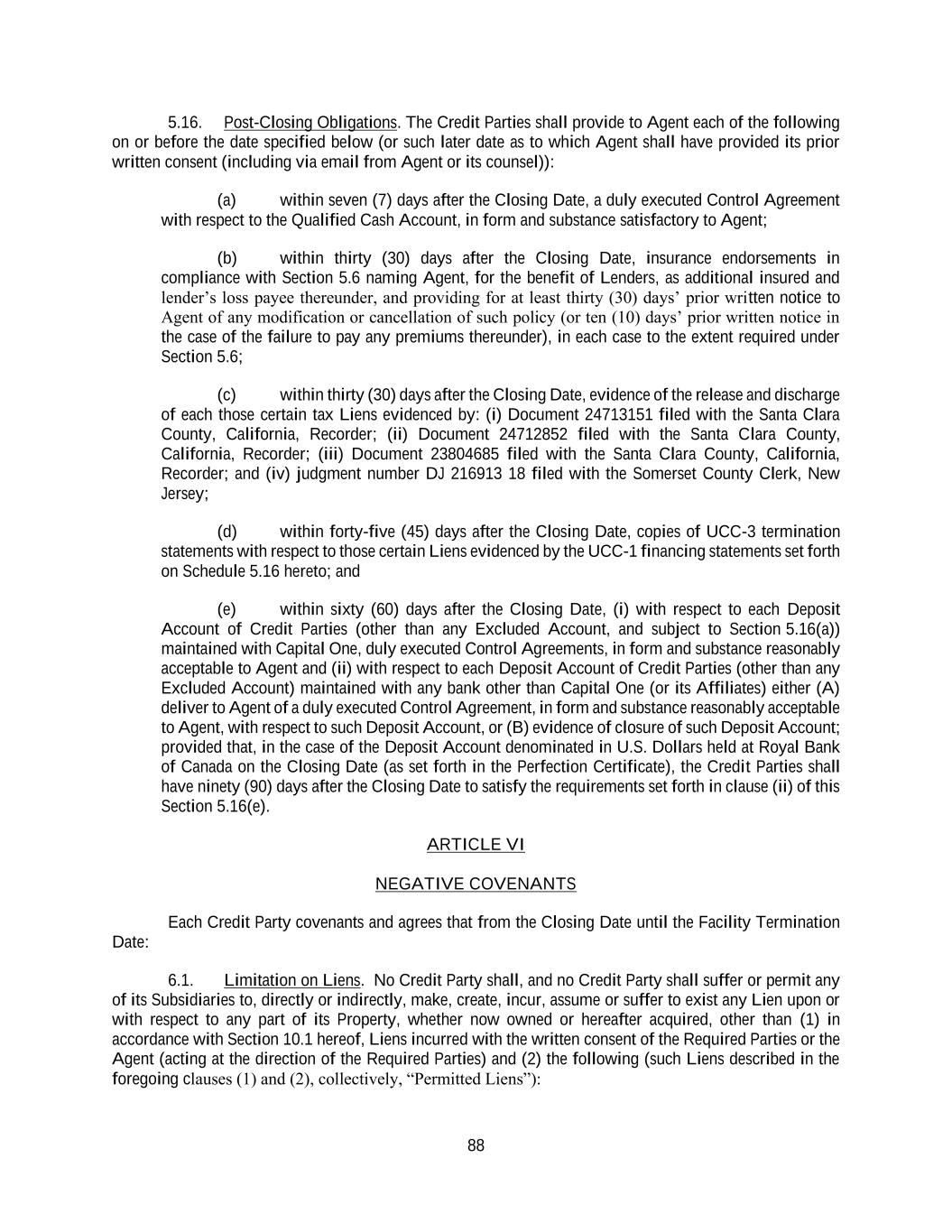 88 5.16. Post-Closing Obligations. The Credit Parties shall provide to Agent each of the following on or before the date specified below (or such later date as to which Agent shall have provided its prior written consent (including via email from Agent or its counsel)): (a) within seven (7) days after the Closing Date, a duly executed Control Agreement with respect to the Qualified Cash Account, in form and substance satisfactory to Agent; (b) within thirty (30) days after the Closing Date, insurance endorsements in compliance with Section 5.6 naming Agent, for the benefit of Lenders, as additional insured and lender’s loss payee thereunder, and providing for at least thirty (30) days’ prior written notice to Agent of any modification or cancellation of such policy (or ten (10) days’ prior written notice in the case of the failure to pay any premiums thereunder), in each case to the extent required under Section 5.6; (c) within thirty (30) days after the Closing Date, evidence of the release and discharge of each those certain tax Liens evidenced by: (i) Document 24713151 filed with the Santa Clara County, California, Recorder; (ii) Document 24712852 filed with the Santa Clara County, California, Recorder; (iii) Document 23804685 filed with the Santa Clara County, California, Recorder; and (iv) judgment number DJ 216913 18 filed with the Somerset County Clerk, New Jersey; (d) within forty-five (45) days after the Closing Date, copies of UCC-3 termination statements with respect to those certain Liens evidenced by the UCC-1 financing statements set forth on Schedule 5.16 hereto; and (e) within sixty (60) days after the Closing Date, (i) with respect to each Deposit Account of Credit Parties (other than any Excluded Account, and subject to Section 5.16(a)) maintained with Capital One, duly executed Control Agreements, in form and substance reasonably acceptable to Agent and (ii) with respect to each Deposit Account of Credit Parties (other than any Excluded Account) maintained with any bank other than Capital One (or its Affiliates) either (A) deliver to Agent of a duly executed Control Agreement, in form and substance reasonably acceptable to Agent, with respect to such Deposit Account, or (B) evidence of closure of such Deposit Account; provided that, in the case of the Deposit Account denominated in U.S. Dollars held at Royal Bank of Canada on the Closing Date (as set forth in the Perfection Certificate), the Credit Parties shall have ninety (90) days after the Closing Date to satisfy the requirements set forth in clause (ii) of this Section 5.16(e). ARTICLE VI NEGATIVE COVENANTS Each Credit Party covenants and agrees that from the Closing Date until the Facility Termination Date: 6.1. Limitation on Liens. No Credit Party shall, and no Credit Party shall suffer or permit any of its Subsidiaries to, directly or indirectly, make, create, incur, assume or suffer to exist any Lien upon or with respect to any part of its Property, whether now owned or hereafter acquired, other than (1) in accordance with Section 10.1 hereof, Liens incurred with the written consent of the Required Parties or the Agent (acting at the direction of the Required Parties) and (2) the following (such Liens described in the foregoing clauses (1) and (2), collectively, “Permitted Liens”):