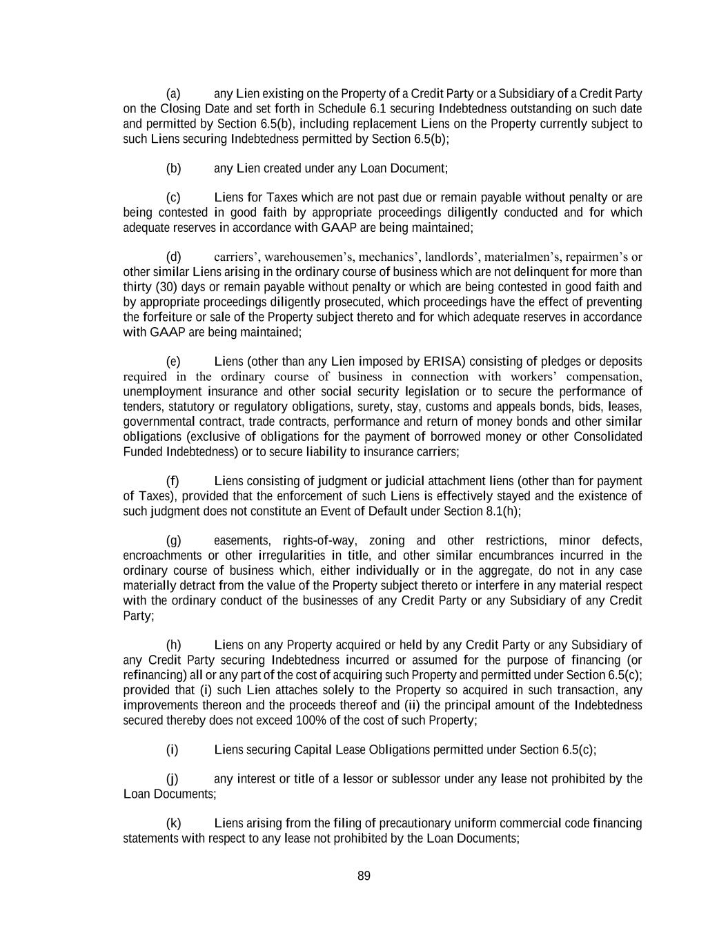 89 (a) any Lien existing on the Property of a Credit Party or a Subsidiary of a Credit Party on the Closing Date and set forth in Schedule 6.1 securing Indebtedness outstanding on such date and permitted by Section 6.5(b), including replacement Liens on the Property currently subject to such Liens securing Indebtedness permitted by Section 6.5(b); (b) any Lien created under any Loan Document; (c) Liens for Taxes which are not past due or remain payable without penalty or are being contested in good faith by appropriate proceedings diligently conducted and for which adequate reserves in accordance with GAAP are being maintained; (d) carriers’, warehousemen’s, mechanics’, landlords’, materialmen’s, repairmen’s or other similar Liens arising in the ordinary course of business which are not delinquent for more than thirty (30) days or remain payable without penalty or which are being contested in good faith and by appropriate proceedings diligently prosecuted, which proceedings have the effect of preventing the forfeiture or sale of the Property subject thereto and for which adequate reserves in accordance with GAAP are being maintained; (e) Liens (other than any Lien imposed by ERISA) consisting of pledges or deposits required in the ordinary course of business in connection with workers’ compensation, unemployment insurance and other social security legislation or to secure the performance of tenders, statutory or regulatory obligations, surety, stay, customs and appeals bonds, bids, leases, governmental contract, trade contracts, performance and return of money bonds and other similar obligations (exclusive of obligations for the payment of borrowed money or other Consolidated Funded Indebtedness) or to secure liability to insurance carriers; (f) Liens consisting of judgment or judicial attachment liens (other than for payment of Taxes), provided that the enforcement of such Liens is effectively stayed and the existence of such judgment does not constitute an Event of Default under Section 8.1(h); (g) easements, rights-of-way, zoning and other restrictions, minor defects, encroachments or other irregularities in title, and other similar encumbrances incurred in the ordinary course of business which, either individually or in the aggregate, do not in any case materially detract from the value of the Property subject thereto or interfere in any material respect with the ordinary conduct of the businesses of any Credit Party or any Subsidiary of any Credit Party; (h) Liens on any Property acquired or held by any Credit Party or any Subsidiary of any Credit Party securing Indebtedness incurred or assumed for the purpose of financing (or refinancing) all or any part of the cost of acquiring such Property and permitted under Section 6.5(c); provided that (i) such Lien attaches solely to the Property so acquired in such transaction, any improvements thereon and the proceeds thereof and (ii) the principal amount of the Indebtedness secured thereby does not exceed 100% of the cost of such Property; (i) Liens securing Capital Lease Obligations permitted under Section 6.5(c); (j) any interest or title of a lessor or sublessor under any lease not prohibited by the Loan Documents; (k) Liens arising from the filing of precautionary uniform commercial code financing statements with respect to any lease not prohibited by the Loan Documents;