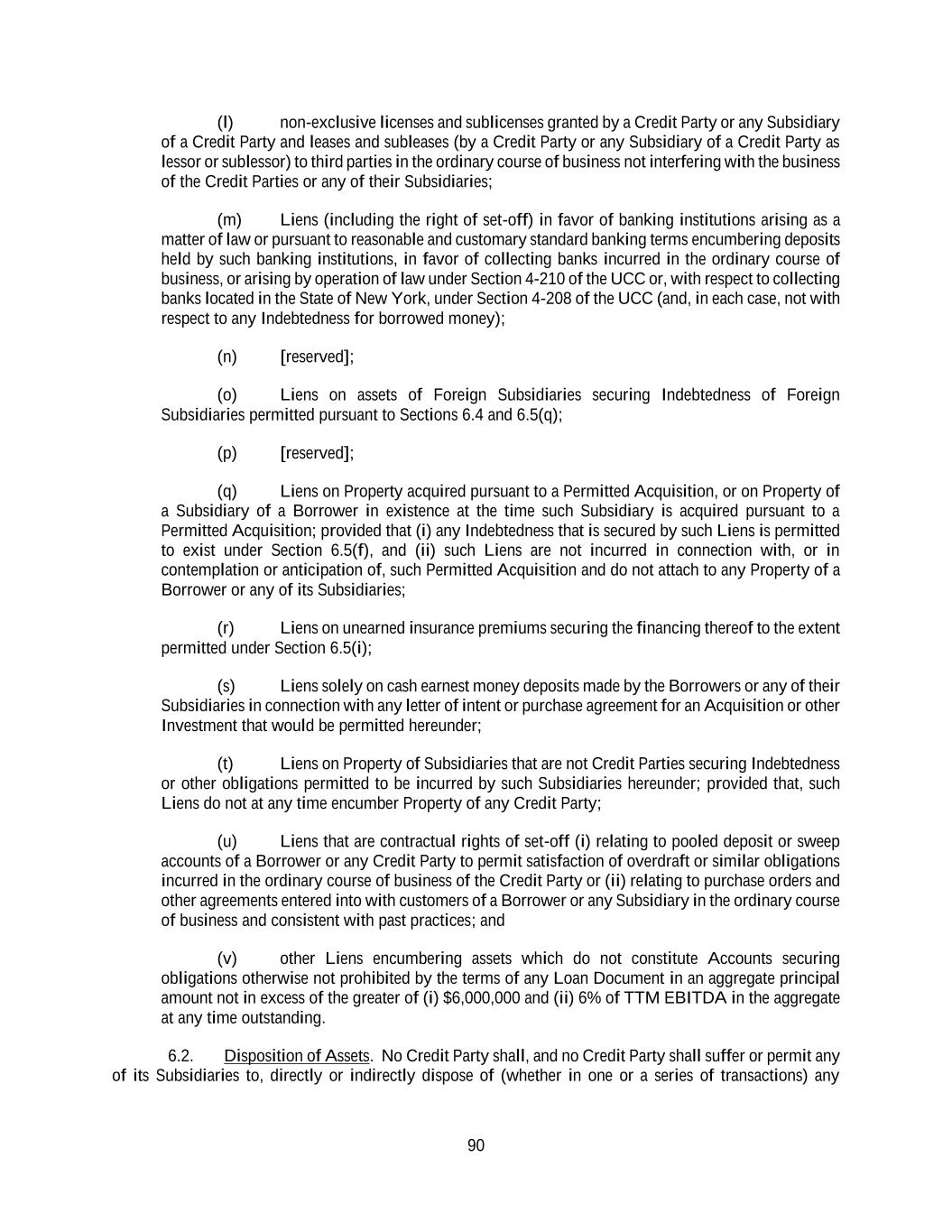 90 (l) non-exclusive licenses and sublicenses granted by a Credit Party or any Subsidiary of a Credit Party and leases and subleases (by a Credit Party or any Subsidiary of a Credit Party as lessor or sublessor) to third parties in the ordinary course of business not interfering with the business of the Credit Parties or any of their Subsidiaries; (m) Liens (including the right of set-off) in favor of banking institutions arising as a matter of law or pursuant to reasonable and customary standard banking terms encumbering deposits held by such banking institutions, in favor of collecting banks incurred in the ordinary course of business, or arising by operation of law under Section 4-210 of the UCC or, with respect to collecting banks located in the State of New York, under Section 4-208 of the UCC (and, in each case, not with respect to any Indebtedness for borrowed money); (n) [reserved]; (o) Liens on assets of Foreign Subsidiaries securing Indebtedness of Foreign Subsidiaries permitted pursuant to Sections 6.4 and 6.5(q); (p) [reserved]; (q) Liens on Property acquired pursuant to a Permitted Acquisition, or on Property of a Subsidiary of a Borrower in existence at the time such Subsidiary is acquired pursuant to a Permitted Acquisition; provided that (i) any Indebtedness that is secured by such Liens is permitted to exist under Section 6.5(f), and (ii) such Liens are not incurred in connection with, or in contemplation or anticipation of, such Permitted Acquisition and do not attach to any Property of a Borrower or any of its Subsidiaries; (r) Liens on unearned insurance premiums securing the financing thereof to the extent permitted under Section 6.5(i); (s) Liens solely on cash earnest money deposits made by the Borrowers or any of their Subsidiaries in connection with any letter of intent or purchase agreement for an Acquisition or other Investment that would be permitted hereunder; (t) Liens on Property of Subsidiaries that are not Credit Parties securing Indebtedness or other obligations permitted to be incurred by such Subsidiaries hereunder; provided that, such Liens do not at any time encumber Property of any Credit Party; (u) Liens that are contractual rights of set-off (i) relating to pooled deposit or sweep accounts of a Borrower or any Credit Party to permit satisfaction of overdraft or similar obligations incurred in the ordinary course of business of the Credit Party or (ii) relating to purchase orders and other agreements entered into with customers of a Borrower or any Subsidiary in the ordinary course of business and consistent with past practices; and (v) other Liens encumbering assets which do not constitute Accounts securing obligations otherwise not prohibited by the terms of any Loan Document in an aggregate principal amount not in excess of the greater of (i) $6,000,000 and (ii) 6% of TTM EBITDA in the aggregate at any time outstanding. 6.2. Disposition of Assets. No Credit Party shall, and no Credit Party shall suffer or permit any of its Subsidiaries to, directly or indirectly dispose of (whether in one or a series of transactions) any
