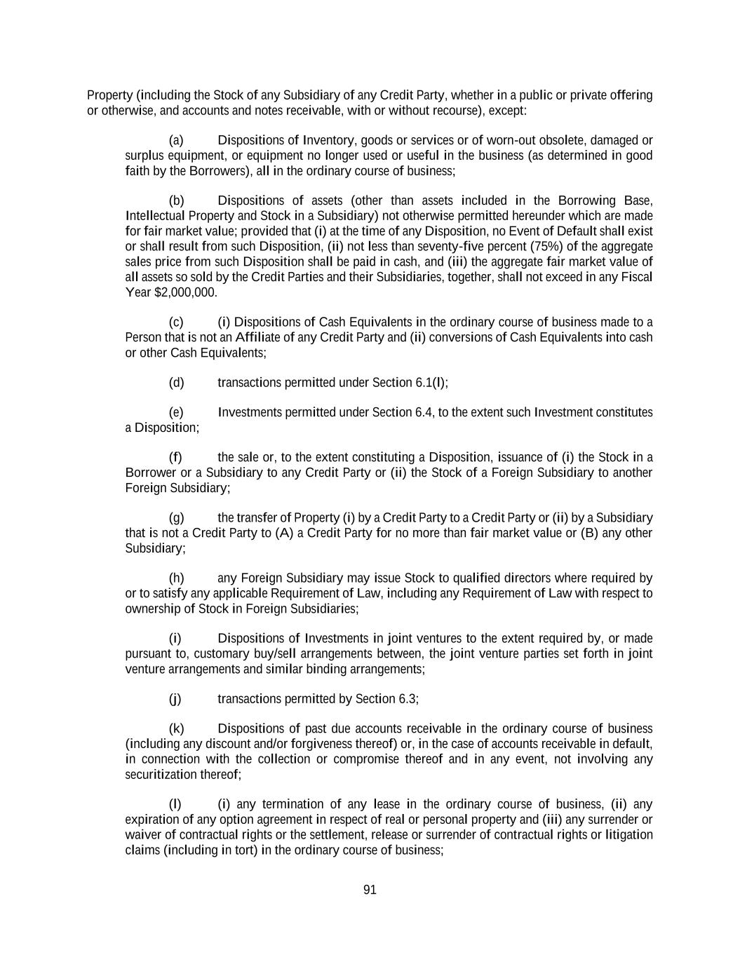 91 Property (including the Stock of any Subsidiary of any Credit Party, whether in a public or private offering or otherwise, and accounts and notes receivable, with or without recourse), except: (a) Dispositions of Inventory, goods or services or of worn-out obsolete, damaged or surplus equipment, or equipment no longer used or useful in the business (as determined in good faith by the Borrowers), all in the ordinary course of business; (b) Dispositions of assets (other than assets included in the Borrowing Base, Intellectual Property and Stock in a Subsidiary) not otherwise permitted hereunder which are made for fair market value; provided that (i) at the time of any Disposition, no Event of Default shall exist or shall result from such Disposition, (ii) not less than seventy-five percent (75%) of the aggregate sales price from such Disposition shall be paid in cash, and (iii) the aggregate fair market value of all assets so sold by the Credit Parties and their Subsidiaries, together, shall not exceed in any Fiscal Year $2,000,000. (c) (i) Dispositions of Cash Equivalents in the ordinary course of business made to a Person that is not an Affiliate of any Credit Party and (ii) conversions of Cash Equivalents into cash or other Cash Equivalents; (d) transactions permitted under Section 6.1(l); (e) Investments permitted under Section 6.4, to the extent such Investment constitutes a Disposition; (f) the sale or, to the extent constituting a Disposition, issuance of (i) the Stock in a Borrower or a Subsidiary to any Credit Party or (ii) the Stock of a Foreign Subsidiary to another Foreign Subsidiary; (g) the transfer of Property (i) by a Credit Party to a Credit Party or (ii) by a Subsidiary that is not a Credit Party to (A) a Credit Party for no more than fair market value or (B) any other Subsidiary; (h) any Foreign Subsidiary may issue Stock to qualified directors where required by or to satisfy any applicable Requirement of Law, including any Requirement of Law with respect to ownership of Stock in Foreign Subsidiaries; (i) Dispositions of Investments in joint ventures to the extent required by, or made pursuant to, customary buy/sell arrangements between, the joint venture parties set forth in joint venture arrangements and similar binding arrangements; (j) transactions permitted by Section 6.3; (k) Dispositions of past due accounts receivable in the ordinary course of business (including any discount and/or forgiveness thereof) or, in the case of accounts receivable in default, in connection with the collection or compromise thereof and in any event, not involving any securitization thereof; (l) (i) any termination of any lease in the ordinary course of business, (ii) any expiration of any option agreement in respect of real or personal property and (iii) any surrender or waiver of contractual rights or the settlement, release or surrender of contractual rights or litigation claims (including in tort) in the ordinary course of business;