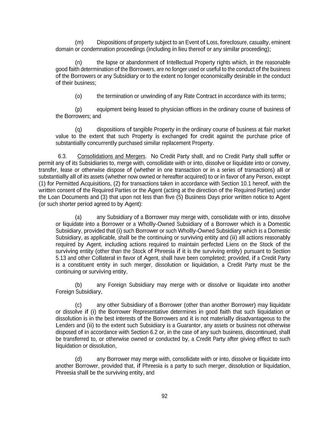 92 (m) Dispositions of property subject to an Event of Loss, foreclosure, casualty, eminent domain or condemnation proceedings (including in lieu thereof or any similar proceeding); (n) the lapse or abandonment of Intellectual Property rights which, in the reasonable good faith determination of the Borrowers, are no longer used or useful to the conduct of the business of the Borrowers or any Subsidiary or to the extent no longer economically desirable in the conduct of their business; (o) the termination or unwinding of any Rate Contract in accordance with its terms; (p) equipment being leased to physician offices in the ordinary course of business of the Borrowers; and (q) dispositions of tangible Property in the ordinary course of business at fair market value to the extent that such Property is exchanged for credit against the purchase price of substantially concurrently purchased similar replacement Property. 6.3. Consolidations and Mergers. No Credit Party shall, and no Credit Party shall suffer or permit any of its Subsidiaries to, merge with, consolidate with or into, dissolve or liquidate into or convey, transfer, lease or otherwise dispose of (whether in one transaction or in a series of transactions) all or substantially all of its assets (whether now owned or hereafter acquired) to or in favor of any Person, except (1) for Permitted Acquisitions, (2) for transactions taken in accordance with Section 10.1 hereof, with the written consent of the Required Parties or the Agent (acting at the direction of the Required Parties) under the Loan Documents and (3) that upon not less than five (5) Business Days prior written notice to Agent (or such shorter period agreed to by Agent): (a) any Subsidiary of a Borrower may merge with, consolidate with or into, dissolve or liquidate into a Borrower or a Wholly-Owned Subsidiary of a Borrower which is a Domestic Subsidiary, provided that (i) such Borrower or such Wholly-Owned Subsidiary which is a Domestic Subsidiary, as applicable, shall be the continuing or surviving entity and (ii) all actions reasonably required by Agent, including actions required to maintain perfected Liens on the Stock of the surviving entity (other than the Stock of Phreesia if it is the surviving entity) pursuant to Section 5.13 and other Collateral in favor of Agent, shall have been completed; provided, if a Credit Party is a constituent entity in such merger, dissolution or liquidation, a Credit Party must be the continuing or surviving entity, (b) any Foreign Subsidiary may merge with or dissolve or liquidate into another Foreign Subsidiary, (c) any other Subsidiary of a Borrower (other than another Borrower) may liquidate or dissolve if (i) the Borrower Representative determines in good faith that such liquidation or dissolution is in the best interests of the Borrowers and it is not materially disadvantageous to the Lenders and (ii) to the extent such Subsidiary is a Guarantor, any assets or business not otherwise disposed of in accordance with Section 6.2 or, in the case of any such business, discontinued, shall be transferred to, or otherwise owned or conducted by, a Credit Party after giving effect to such liquidation or dissolution, (d) any Borrower may merge with, consolidate with or into, dissolve or liquidate into another Borrower, provided that, if Phreesia is a party to such merger, dissolution or liquidation, Phreesia shall be the surviving entity, and