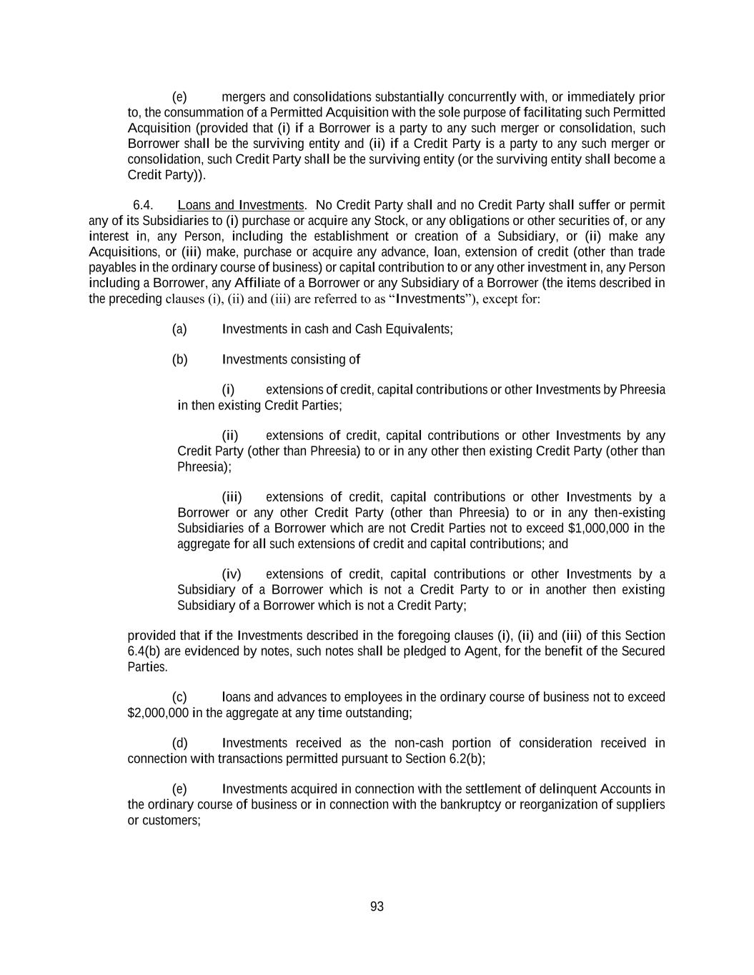 93 (e) mergers and consolidations substantially concurrently with, or immediately prior to, the consummation of a Permitted Acquisition with the sole purpose of facilitating such Permitted Acquisition (provided that (i) if a Borrower is a party to any such merger or consolidation, such Borrower shall be the surviving entity and (ii) if a Credit Party is a party to any such merger or consolidation, such Credit Party shall be the surviving entity (or the surviving entity shall become a Credit Party)). 6.4. Loans and Investments. No Credit Party shall and no Credit Party shall suffer or permit any of its Subsidiaries to (i) purchase or acquire any Stock, or any obligations or other securities of, or any interest in, any Person, including the establishment or creation of a Subsidiary, or (ii) make any Acquisitions, or (iii) make, purchase or acquire any advance, loan, extension of credit (other than trade payables in the ordinary course of business) or capital contribution to or any other investment in, any Person including a Borrower, any Affiliate of a Borrower or any Subsidiary of a Borrower (the items described in the preceding clauses (i), (ii) and (iii) are referred to as “Investments”), except for: (a) Investments in cash and Cash Equivalents; (b) Investments consisting of (i) extensions of credit, capital contributions or other Investments by Phreesia in then existing Credit Parties; (ii) extensions of credit, capital contributions or other Investments by any Credit Party (other than Phreesia) to or in any other then existing Credit Party (other than Phreesia); (iii) extensions of credit, capital contributions or other Investments by a Borrower or any other Credit Party (other than Phreesia) to or in any then-existing Subsidiaries of a Borrower which are not Credit Parties not to exceed $1,000,000 in the aggregate for all such extensions of credit and capital contributions; and (iv) extensions of credit, capital contributions or other Investments by a Subsidiary of a Borrower which is not a Credit Party to or in another then existing Subsidiary of a Borrower which is not a Credit Party; provided that if the Investments described in the foregoing clauses (i), (ii) and (iii) of this Section 6.4(b) are evidenced by notes, such notes shall be pledged to Agent, for the benefit of the Secured Parties. (c) loans and advances to employees in the ordinary course of business not to exceed $2,000,000 in the aggregate at any time outstanding; (d) Investments received as the non-cash portion of consideration received in connection with transactions permitted pursuant to Section 6.2(b); (e) Investments acquired in connection with the settlement of delinquent Accounts in the ordinary course of business or in connection with the bankruptcy or reorganization of suppliers or customers;