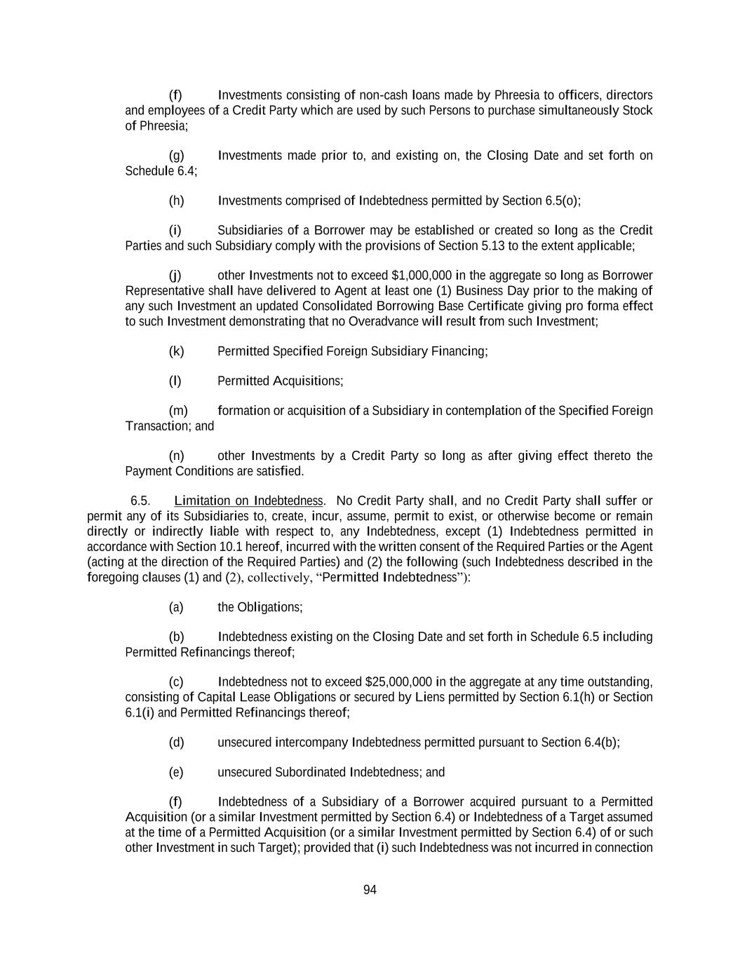 94 (f) Investments consisting of non-cash loans made by Phreesia to officers, directors and employees of a Credit Party which are used by such Persons to purchase simultaneously Stock of Phreesia; (g) Investments made prior to, and existing on, the Closing Date and set forth on Schedule 6.4; (h) Investments comprised of Indebtedness permitted by Section 6.5(o); (i) Subsidiaries of a Borrower may be established or created so long as the Credit Parties and such Subsidiary comply with the provisions of Section 5.13 to the extent applicable; (j) other Investments not to exceed $1,000,000 in the aggregate so long as Borrower Representative shall have delivered to Agent at least one (1) Business Day prior to the making of any such Investment an updated Consolidated Borrowing Base Certificate giving pro forma effect to such Investment demonstrating that no Overadvance will result from such Investment; (k) Permitted Specified Foreign Subsidiary Financing; (l) Permitted Acquisitions; (m) formation or acquisition of a Subsidiary in contemplation of the Specified Foreign Transaction; and (n) other Investments by a Credit Party so long as after giving effect thereto the Payment Conditions are satisfied. 6.5. Limitation on Indebtedness. No Credit Party shall, and no Credit Party shall suffer or permit any of its Subsidiaries to, create, incur, assume, permit to exist, or otherwise become or remain directly or indirectly liable with respect to, any Indebtedness, except (1) Indebtedness permitted in accordance with Section 10.1 hereof, incurred with the written consent of the Required Parties or the Agent (acting at the direction of the Required Parties) and (2) the following (such Indebtedness described in the foregoing clauses (1) and (2), collectively, “Permitted Indebtedness”): (a) the Obligations; (b) Indebtedness existing on the Closing Date and set forth in Schedule 6.5 including Permitted Refinancings thereof; (c) Indebtedness not to exceed $25,000,000 in the aggregate at any time outstanding, consisting of Capital Lease Obligations or secured by Liens permitted by Section 6.1(h) or Section 6.1(i) and Permitted Refinancings thereof; (d) unsecured intercompany Indebtedness permitted pursuant to Section 6.4(b); (e) unsecured Subordinated Indebtedness; and (f) Indebtedness of a Subsidiary of a Borrower acquired pursuant to a Permitted Acquisition (or a similar Investment permitted by Section 6.4) or Indebtedness of a Target assumed at the time of a Permitted Acquisition (or a similar Investment permitted by Section 6.4) of or such other Investment in such Target); provided that (i) such Indebtedness was not incurred in connection