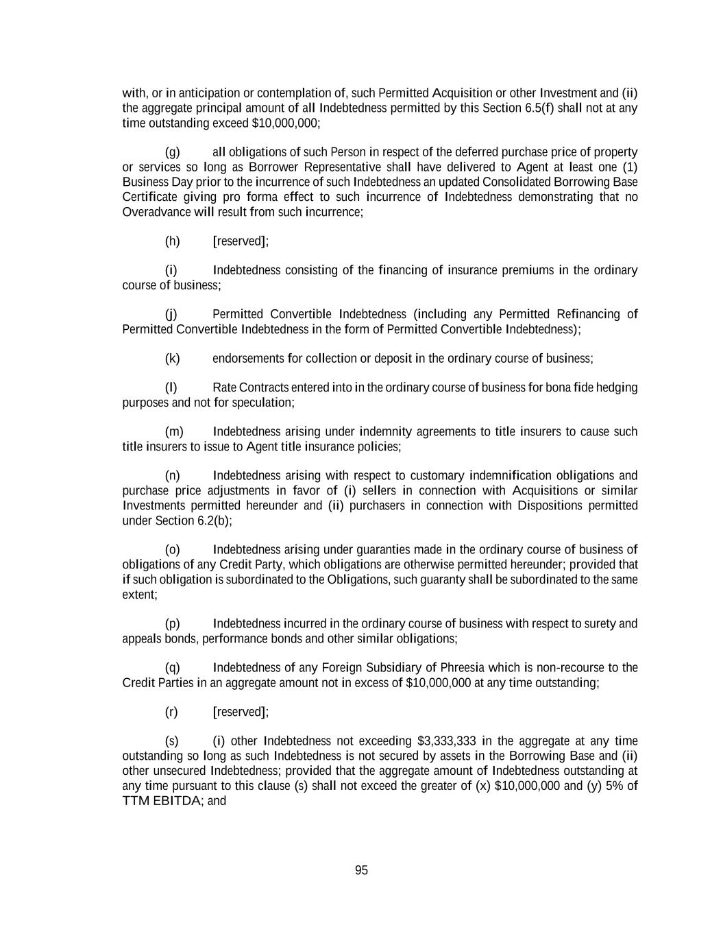 95 with, or in anticipation or contemplation of, such Permitted Acquisition or other Investment and (ii) the aggregate principal amount of all Indebtedness permitted by this Section 6.5(f) shall not at any time outstanding exceed $10,000,000; (g) all obligations of such Person in respect of the deferred purchase price of property or services so long as Borrower Representative shall have delivered to Agent at least one (1) Business Day prior to the incurrence of such Indebtedness an updated Consolidated Borrowing Base Certificate giving pro forma effect to such incurrence of Indebtedness demonstrating that no Overadvance will result from such incurrence; (h) [reserved]; (i) Indebtedness consisting of the financing of insurance premiums in the ordinary course of business; (j) Permitted Convertible Indebtedness (including any Permitted Refinancing of Permitted Convertible Indebtedness in the form of Permitted Convertible Indebtedness); (k) endorsements for collection or deposit in the ordinary course of business; (l) Rate Contracts entered into in the ordinary course of business for bona fide hedging purposes and not for speculation; (m) Indebtedness arising under indemnity agreements to title insurers to cause such title insurers to issue to Agent title insurance policies; (n) Indebtedness arising with respect to customary indemnification obligations and purchase price adjustments in favor of (i) sellers in connection with Acquisitions or similar Investments permitted hereunder and (ii) purchasers in connection with Dispositions permitted under Section 6.2(b); (o) Indebtedness arising under guaranties made in the ordinary course of business of obligations of any Credit Party, which obligations are otherwise permitted hereunder; provided that if such obligation is subordinated to the Obligations, such guaranty shall be subordinated to the same extent; (p) Indebtedness incurred in the ordinary course of business with respect to surety and appeals bonds, performance bonds and other similar obligations; (q) Indebtedness of any Foreign Subsidiary of Phreesia which is non-recourse to the Credit Parties in an aggregate amount not in excess of $10,000,000 at any time outstanding; (r) [reserved]; (s) (i) other Indebtedness not exceeding $3,333,333 in the aggregate at any time outstanding so long as such Indebtedness is not secured by assets in the Borrowing Base and (ii) other unsecured Indebtedness; provided that the aggregate amount of Indebtedness outstanding at any time pursuant to this clause (s) shall not exceed the greater of (x) $10,000,000 and (y) 5% of TTM EBITDA; and