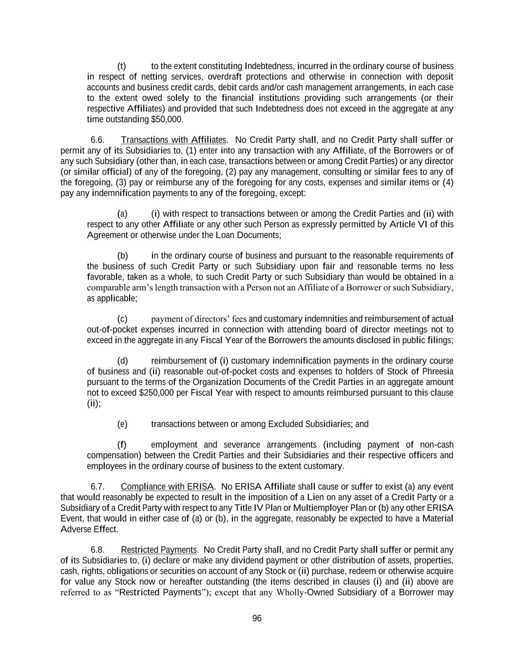 96 (t) to the extent constituting Indebtedness, incurred in the ordinary course of business in respect of netting services, overdraft protections and otherwise in connection with deposit accounts and business credit cards, debit cards and/or cash management arrangements, in each case to the extent owed solely to the financial institutions providing such arrangements (or their respective Affiliates) and provided that such Indebtedness does not exceed in the aggregate at any time outstanding $50,000. 6.6. Transactions with Affiliates. No Credit Party shall, and no Credit Party shall suffer or permit any of its Subsidiaries to, (1) enter into any transaction with any Affiliate, of the Borrowers or of any such Subsidiary (other than, in each case, transactions between or among Credit Parties) or any director (or similar official) of any of the foregoing, (2) pay any management, consulting or similar fees to any of the foregoing, (3) pay or reimburse any of the foregoing for any costs, expenses and similar items or (4) pay any indemnification payments to any of the foregoing, except: (a) (i) with respect to transactions between or among the Credit Parties and (ii) with respect to any other Affiliate or any other such Person as expressly permitted by Article VI of this Agreement or otherwise under the Loan Documents; (b) in the ordinary course of business and pursuant to the reasonable requirements of the business of such Credit Party or such Subsidiary upon fair and reasonable terms no less favorable, taken as a whole, to such Credit Party or such Subsidiary than would be obtained in a comparable arm’s length transaction with a Person not an Affiliate of a Borrower or such Subsidiary, as applicable; (c) payment of directors’ fees and customary indemnities and reimbursement of actual out-of-pocket expenses incurred in connection with attending board of director meetings not to exceed in the aggregate in any Fiscal Year of the Borrowers the amounts disclosed in public filings; (d) reimbursement of (i) customary indemnification payments in the ordinary course of business and (ii) reasonable out-of-pocket costs and expenses to holders of Stock of Phreesia pursuant to the terms of the Organization Documents of the Credit Parties in an aggregate amount not to exceed $250,000 per Fiscal Year with respect to amounts reimbursed pursuant to this clause (ii); (e) transactions between or among Excluded Subsidiaries; and (f) employment and severance arrangements (including payment of non-cash compensation) between the Credit Parties and their Subsidiaries and their respective officers and employees in the ordinary course of business to the extent customary. 6.7. Compliance with ERISA. No ERISA Affiliate shall cause or suffer to exist (a) any event that would reasonably be expected to result in the imposition of a Lien on any asset of a Credit Party or a Subsidiary of a Credit Party with respect to any Title IV Plan or Multiemployer Plan or (b) any other ERISA Event, that would in either case of (a) or (b), in the aggregate, reasonably be expected to have a Material Adverse Effect. 6.8. Restricted Payments. No Credit Party shall, and no Credit Party shall suffer or permit any of its Subsidiaries to, (i) declare or make any dividend payment or other distribution of assets, properties, cash, rights, obligations or securities on account of any Stock or (ii) purchase, redeem or otherwise acquire for value any Stock now or hereafter outstanding (the items described in clauses (i) and (ii) above are referred to as “Restricted Payments”); except that any Wholly-Owned Subsidiary of a Borrower may