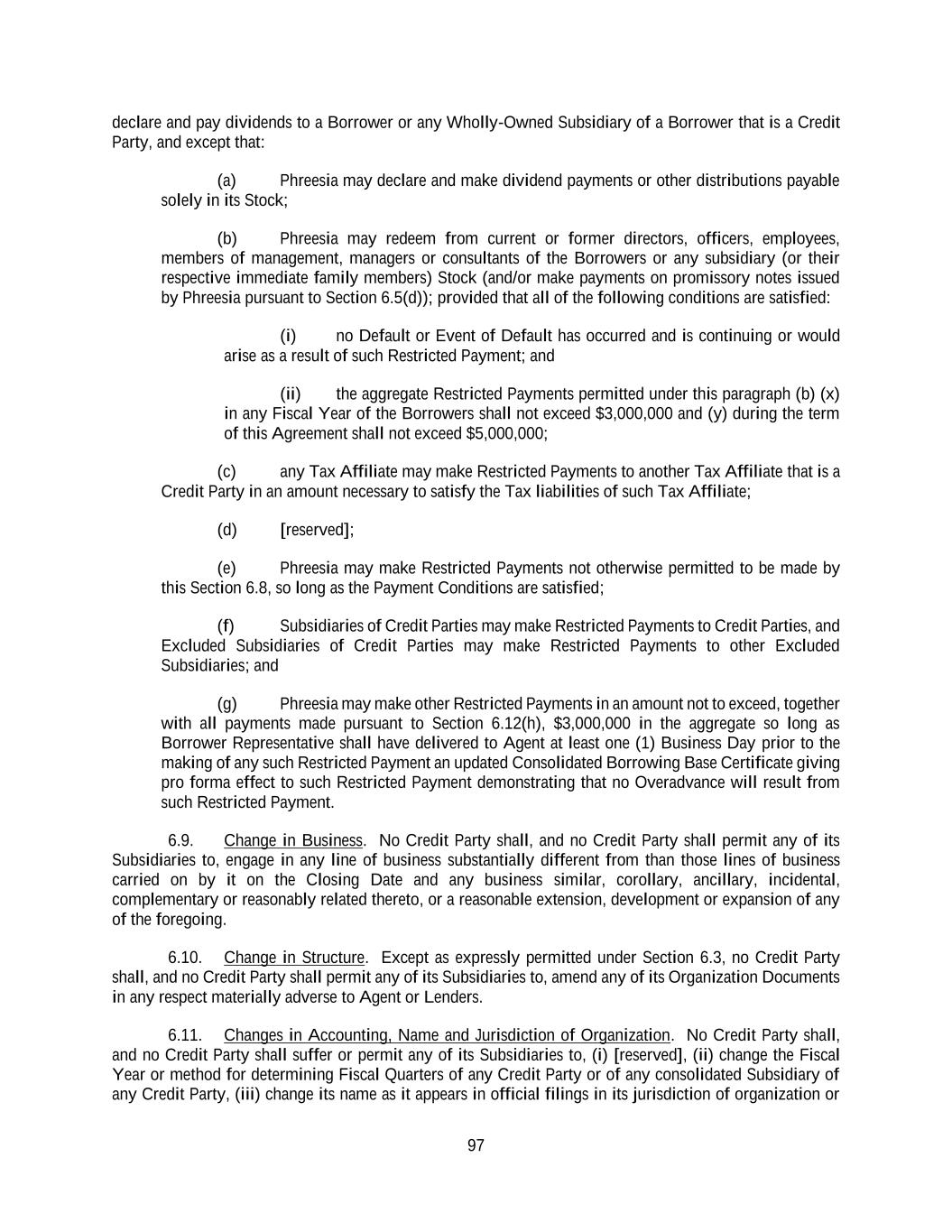 97 declare and pay dividends to a Borrower or any Wholly-Owned Subsidiary of a Borrower that is a Credit Party, and except that: (a) Phreesia may declare and make dividend payments or other distributions payable solely in its Stock; (b) Phreesia may redeem from current or former directors, officers, employees, members of management, managers or consultants of the Borrowers or any subsidiary (or their respective immediate family members) Stock (and/or make payments on promissory notes issued by Phreesia pursuant to Section 6.5(d)); provided that all of the following conditions are satisfied: (i) no Default or Event of Default has occurred and is continuing or would arise as a result of such Restricted Payment; and (ii) the aggregate Restricted Payments permitted under this paragraph (b) (x) in any Fiscal Year of the Borrowers shall not exceed $3,000,000 and (y) during the term of this Agreement shall not exceed $5,000,000; (c) any Tax Affiliate may make Restricted Payments to another Tax Affiliate that is a Credit Party in an amount necessary to satisfy the Tax liabilities of such Tax Affiliate; (d) [reserved]; (e) Phreesia may make Restricted Payments not otherwise permitted to be made by this Section 6.8, so long as the Payment Conditions are satisfied; (f) Subsidiaries of Credit Parties may make Restricted Payments to Credit Parties, and Excluded Subsidiaries of Credit Parties may make Restricted Payments to other Excluded Subsidiaries; and (g) Phreesia may make other Restricted Payments in an amount not to exceed, together with all payments made pursuant to Section 6.12(h), $3,000,000 in the aggregate so long as Borrower Representative shall have delivered to Agent at least one (1) Business Day prior to the making of any such Restricted Payment an updated Consolidated Borrowing Base Certificate giving pro forma effect to such Restricted Payment demonstrating that no Overadvance will result from such Restricted Payment. 6.9. Change in Business. No Credit Party shall, and no Credit Party shall permit any of its Subsidiaries to, engage in any line of business substantially different from than those lines of business carried on by it on the Closing Date and any business similar, corollary, ancillary, incidental, complementary or reasonably related thereto, or a reasonable extension, development or expansion of any of the foregoing. 6.10. Change in Structure. Except as expressly permitted under Section 6.3, no Credit Party shall, and no Credit Party shall permit any of its Subsidiaries to, amend any of its Organization Documents in any respect materially adverse to Agent or Lenders. 6.11. Changes in Accounting, Name and Jurisdiction of Organization. No Credit Party shall, and no Credit Party shall suffer or permit any of its Subsidiaries to, (i) [reserved], (ii) change the Fiscal Year or method for determining Fiscal Quarters of any Credit Party or of any consolidated Subsidiary of any Credit Party, (iii) change its name as it appears in official filings in its jurisdiction of organization or