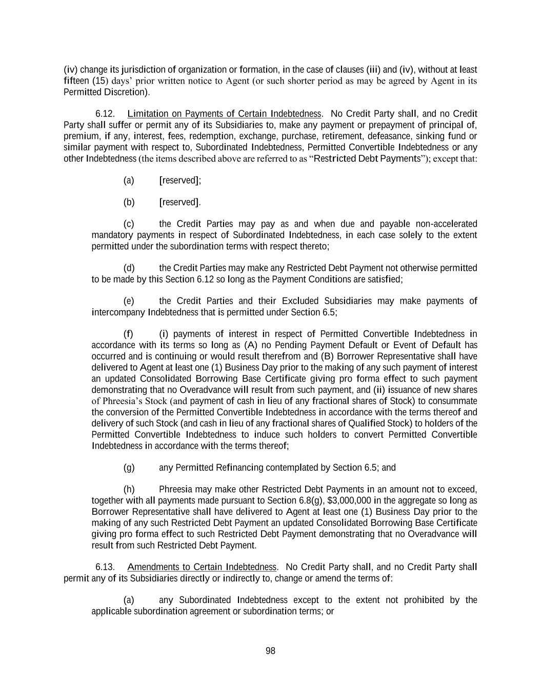 98 (iv) change its jurisdiction of organization or formation, in the case of clauses (iii) and (iv), without at least fifteen (15) days’ prior written notice to Agent (or such shorter period as may be agreed by Agent in its Permitted Discretion). 6.12. Limitation on Payments of Certain Indebtedness. No Credit Party shall, and no Credit Party shall suffer or permit any of its Subsidiaries to, make any payment or prepayment of principal of, premium, if any, interest, fees, redemption, exchange, purchase, retirement, defeasance, sinking fund or similar payment with respect to, Subordinated Indebtedness, Permitted Convertible Indebtedness or any other Indebtedness (the items described above are referred to as “Restricted Debt Payments”); except that: (a) [reserved]; (b) [reserved]. (c) the Credit Parties may pay as and when due and payable non-accelerated mandatory payments in respect of Subordinated Indebtedness, in each case solely to the extent permitted under the subordination terms with respect thereto; (d) the Credit Parties may make any Restricted Debt Payment not otherwise permitted to be made by this Section 6.12 so long as the Payment Conditions are satisfied; (e) the Credit Parties and their Excluded Subsidiaries may make payments of intercompany Indebtedness that is permitted under Section 6.5; (f) (i) payments of interest in respect of Permitted Convertible Indebtedness in accordance with its terms so long as (A) no Pending Payment Default or Event of Default has occurred and is continuing or would result therefrom and (B) Borrower Representative shall have delivered to Agent at least one (1) Business Day prior to the making of any such payment of interest an updated Consolidated Borrowing Base Certificate giving pro forma effect to such payment demonstrating that no Overadvance will result from such payment, and (ii) issuance of new shares of Phreesia’s Stock (and payment of cash in lieu of any fractional shares of Stock) to consummate the conversion of the Permitted Convertible Indebtedness in accordance with the terms thereof and delivery of such Stock (and cash in lieu of any fractional shares of Qualified Stock) to holders of the Permitted Convertible Indebtedness to induce such holders to convert Permitted Convertible Indebtedness in accordance with the terms thereof; (g) any Permitted Refinancing contemplated by Section 6.5; and (h) Phreesia may make other Restricted Debt Payments in an amount not to exceed, together with all payments made pursuant to Section 6.8(g), $3,000,000 in the aggregate so long as Borrower Representative shall have delivered to Agent at least one (1) Business Day prior to the making of any such Restricted Debt Payment an updated Consolidated Borrowing Base Certificate giving pro forma effect to such Restricted Debt Payment demonstrating that no Overadvance will result from such Restricted Debt Payment. 6.13. Amendments to Certain Indebtedness. No Credit Party shall, and no Credit Party shall permit any of its Subsidiaries directly or indirectly to, change or amend the terms of: (a) any Subordinated Indebtedness except to the extent not prohibited by the applicable subordination agreement or subordination terms; or