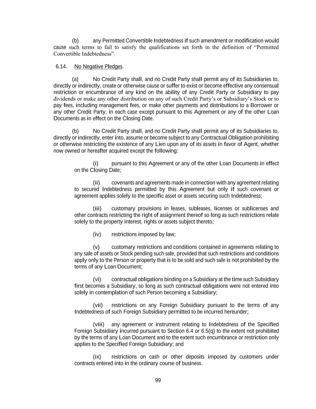 99 (b) any Permitted Convertible Indebtedness if such amendment or modification would cause such terms to fail to satisfy the qualifications set forth in the definition of “Permitted Convertible Indebtedness”. 6.14. No Negative Pledges. (a) No Credit Party shall, and no Credit Party shall permit any of its Subsidiaries to, directly or indirectly, create or otherwise cause or suffer to exist or become effective any consensual restriction or encumbrance of any kind on the ability of any Credit Party or Subsidiary to pay dividends or make any other distribution on any of such Credit Party’s or Subsidiary’s Stock or to pay fees, including management fees, or make other payments and distributions to a Borrower or any other Credit Party, in each case except pursuant to this Agreement or any of the other Loan Documents as in effect on the Closing Date. (b) No Credit Party shall, and no Credit Party shall permit any of its Subsidiaries to, directly or indirectly, enter into, assume or become subject to any Contractual Obligation prohibiting or otherwise restricting the existence of any Lien upon any of its assets in favor of Agent, whether now owned or hereafter acquired except the following: (i) pursuant to this Agreement or any of the other Loan Documents in effect on the Closing Date; (ii) covenants and agreements made in connection with any agreement relating to secured Indebtedness permitted by this Agreement but only if such covenant or agreement applies solely to the specific asset or assets securing such Indebtedness; (iii) customary provisions in leases, subleases, licenses or sublicenses and other contracts restricting the right of assignment thereof so long as such restrictions relate solely to the property interest, rights or assets subject thereto; (iv) restrictions imposed by law; (v) customary restrictions and conditions contained in agreements relating to any sale of assets or Stock pending such sale, provided that such restrictions and conditions apply only to the Person or property that is to be sold and such sale is not prohibited by the terms of any Loan Document; (vi) contractual obligations binding on a Subsidiary at the time such Subsidiary first becomes a Subsidiary, so long as such contractual obligations were not entered into solely in contemplation of such Person becoming a Subsidiary; (vii) restrictions on any Foreign Subsidiary pursuant to the terms of any Indebtedness of such Foreign Subsidiary permitted to be incurred hereunder; (viii) any agreement or instrument relating to Indebtedness of the Specified Foreign Subsidiary incurred pursuant to Section 6.4 or 6.5(q) to the extent not prohibited by the terms of any Loan Document and to the extent such encumbrance or restriction only applies to the Specified Foreign Subsidiary; and (ix) restrictions on cash or other deposits imposed by customers under contracts entered into in the ordinary course of business.