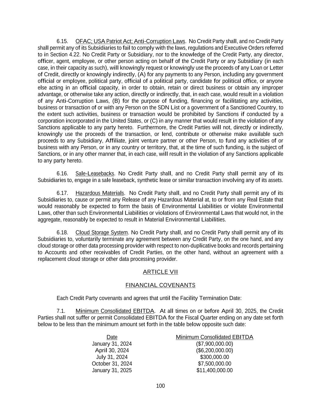 100 6.15. OFAC; USA Patriot Act; Anti-Corruption Laws. No Credit Party shall, and no Credit Party shall permit any of its Subsidiaries to fail to comply with the laws, regulations and Executive Orders referred to in Section 4.22. No Credit Party or Subsidiary, nor to the knowledge of the Credit Party, any director, officer, agent, employee, or other person acting on behalf of the Credit Party or any Subsidiary (in each case, in their capacity as such), will knowingly request or knowingly use the proceeds of any Loan or Letter of Credit, directly or knowingly indirectly, (A) for any payments to any Person, including any government official or employee, political party, official of a political party, candidate for political office, or anyone else acting in an official capacity, in order to obtain, retain or direct business or obtain any improper advantage, or otherwise take any action, directly or indirectly, that, in each case, would result in a violation of any Anti-Corruption Laws, (B) for the purpose of funding, financing or facilitating any activities, business or transaction of or with any Person on the SDN List or a government of a Sanctioned Country, to the extent such activities, business or transaction would be prohibited by Sanctions if conducted by a corporation incorporated in the United States, or (C) in any manner that would result in the violation of any Sanctions applicable to any party hereto. Furthermore, the Credit Parties will not, directly or indirectly, knowingly use the proceeds of the transaction, or lend, contribute or otherwise make available such proceeds to any Subsidiary, Affiliate, joint venture partner or other Person, to fund any activities of or business with any Person, or in any country or territory, that, at the time of such funding, is the subject of Sanctions, or in any other manner that, in each case, will result in the violation of any Sanctions applicable to any party hereto. 6.16. Sale-Leasebacks. No Credit Party shall, and no Credit Party shall permit any of its Subsidiaries to, engage in a sale leaseback, synthetic lease or similar transaction involving any of its assets. 6.17. Hazardous Materials. No Credit Party shall, and no Credit Party shall permit any of its Subsidiaries to, cause or permit any Release of any Hazardous Material at, to or from any Real Estate that would reasonably be expected to form the basis of Environmental Liabilities or violate Environmental Laws, other than such Environmental Liabilities or violations of Environmental Laws that would not, in the aggregate, reasonably be expected to result in Material Environmental Liabilities. 6.18. Cloud Storage System. No Credit Party shall, and no Credit Party shall permit any of its Subsidiaries to, voluntarily terminate any agreement between any Credit Party, on the one hand, and any cloud storage or other data processing provider with respect to non-duplicative books and records pertaining to Accounts and other receivables of Credit Parties, on the other hand, without an agreement with a replacement cloud storage or other data processing provider. ARTICLE VII FINANCIAL COVENANTS Each Credit Party covenants and agrees that until the Facility Termination Date: 7.1. Minimum Consolidated EBITDA. At all times on or before April 30, 2025, the Credit Parties shall not suffer or permit Consolidated EBITDA for the Fiscal Quarter ending on any date set forth below to be less than the minimum amount set forth in the table below opposite such date: Date Minimum Consolidated EBITDA January 31, 2024 ($7,900,000.00) April 30, 2024 ($6,200,000.00) July 31, 2024 $300,000.00 October 31, 2024 $7,500,000.00 January 31, 2025 $11,400,000.00