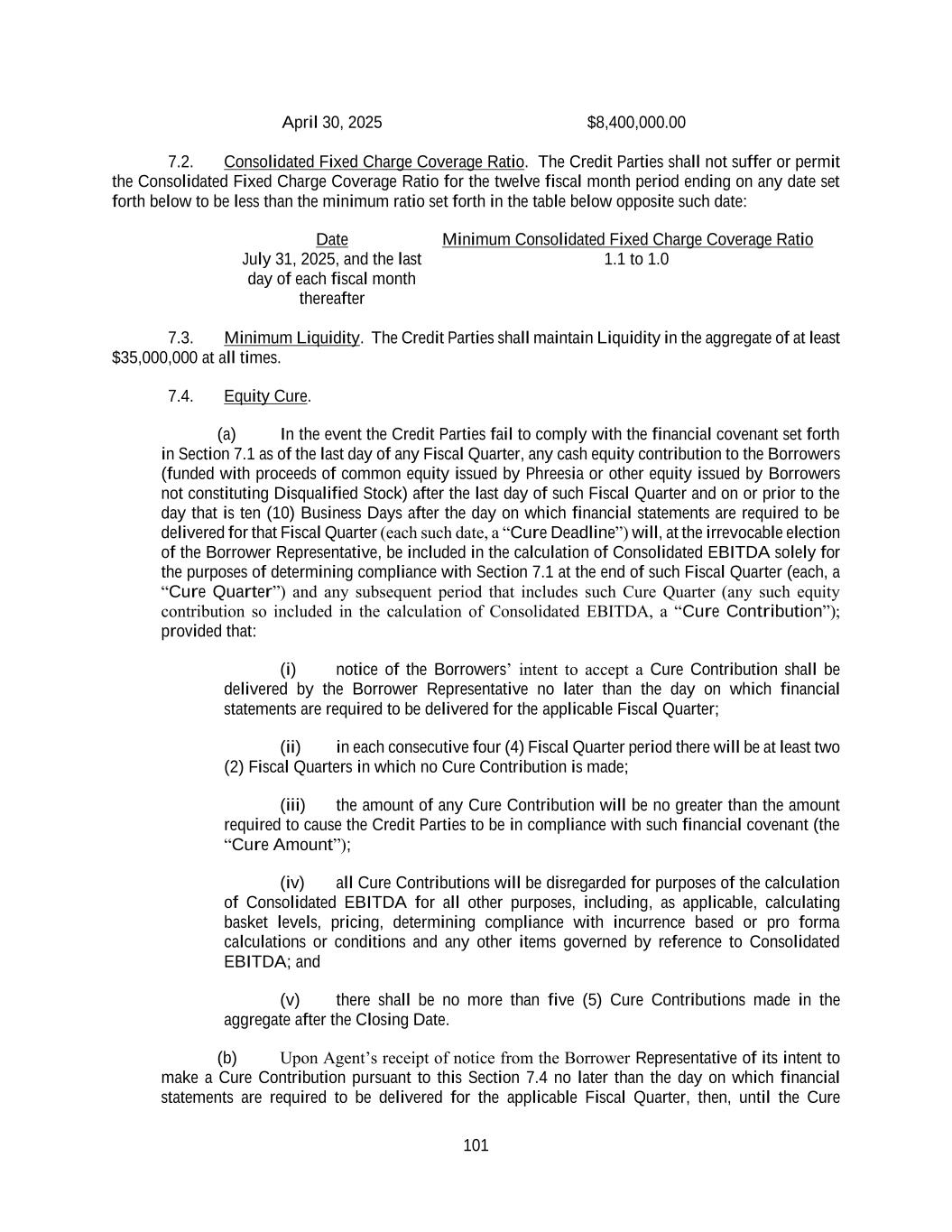 101 April 30, 2025 $8,400,000.00 7.2. Consolidated Fixed Charge Coverage Ratio. The Credit Parties shall not suffer or permit the Consolidated Fixed Charge Coverage Ratio for the twelve fiscal month period ending on any date set forth below to be less than the minimum ratio set forth in the table below opposite such date: Date Minimum Consolidated Fixed Charge Coverage Ratio July 31, 2025, and the last day of each fiscal month thereafter 1.1 to 1.0 7.3. Minimum Liquidity. The Credit Parties shall maintain Liquidity in the aggregate of at least $35,000,000 at all times. 7.4. Equity Cure. (a) In the event the Credit Parties fail to comply with the financial covenant set forth in Section 7.1 as of the last day of any Fiscal Quarter, any cash equity contribution to the Borrowers (funded with proceeds of common equity issued by Phreesia or other equity issued by Borrowers not constituting Disqualified Stock) after the last day of such Fiscal Quarter and on or prior to the day that is ten (10) Business Days after the day on which financial statements are required to be delivered for that Fiscal Quarter (each such date, a “Cure Deadline”) will, at the irrevocable election of the Borrower Representative, be included in the calculation of Consolidated EBITDA solely for the purposes of determining compliance with Section 7.1 at the end of such Fiscal Quarter (each, a “Cure Quarter”) and any subsequent period that includes such Cure Quarter (any such equity contribution so included in the calculation of Consolidated EBITDA, a “Cure Contribution”); provided that: (i) notice of the Borrowers’ intent to accept a Cure Contribution shall be delivered by the Borrower Representative no later than the day on which financial statements are required to be delivered for the applicable Fiscal Quarter; (ii) in each consecutive four (4) Fiscal Quarter period there will be at least two (2) Fiscal Quarters in which no Cure Contribution is made; (iii) the amount of any Cure Contribution will be no greater than the amount required to cause the Credit Parties to be in compliance with such financial covenant (the “Cure Amount”); (iv) all Cure Contributions will be disregarded for purposes of the calculation of Consolidated EBITDA for all other purposes, including, as applicable, calculating basket levels, pricing, determining compliance with incurrence based or pro forma calculations or conditions and any other items governed by reference to Consolidated EBITDA; and (v) there shall be no more than five (5) Cure Contributions made in the aggregate after the Closing Date. (b) Upon Agent’s receipt of notice from the Borrower Representative of its intent to make a Cure Contribution pursuant to this Section 7.4 no later than the day on which financial statements are required to be delivered for the applicable Fiscal Quarter, then, until the Cure