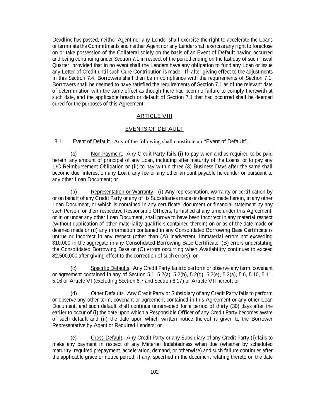 102 Deadline has passed, neither Agent nor any Lender shall exercise the right to accelerate the Loans or terminate the Commitments and neither Agent nor any Lender shall exercise any right to foreclose on or take possession of the Collateral solely on the basis of an Event of Default having occurred and being continuing under Section 7.1 in respect of the period ending on the last day of such Fiscal Quarter; provided that in no event shall the Lenders have any obligation to fund any Loan or issue any Letter of Credit until such Cure Contribution is made. If, after giving effect to the adjustments in this Section 7.4, Borrowers shall then be in compliance with the requirements of Section 7.1, Borrowers shall be deemed to have satisfied the requirements of Section 7.1 as of the relevant date of determination with the same effect as though there had been no failure to comply therewith at such date, and the applicable breach or default of Section 7.1 that had occurred shall be deemed cured for the purposes of this Agreement. ARTICLE VIII EVENTS OF DEFAULT 8.1. Event of Default. Any of the following shall constitute an “Event of Default”: (a) Non-Payment. Any Credit Party fails (i) to pay when and as required to be paid herein, any amount of principal of any Loan, including after maturity of the Loans, or to pay any L/C Reimbursement Obligation or (ii) to pay within three (3) Business Days after the same shall become due, interest on any Loan, any fee or any other amount payable hereunder or pursuant to any other Loan Document; or (b) Representation or Warranty. (i) Any representation, warranty or certification by or on behalf of any Credit Party or any of its Subsidiaries made or deemed made herein, in any other Loan Document, or which is contained in any certificate, document or financial statement by any such Person, or their respective Responsible Officers, furnished at any time under this Agreement, or in or under any other Loan Document, shall prove to have been incorrect in any material respect (without duplication of other materiality qualifiers contained therein) on or as of the date made or deemed made or (ii) any information contained in any Consolidated Borrowing Base Certificate is untrue or incorrect in any respect (other than (A) inadvertent, immaterial errors not exceeding $10,000 in the aggregate in any Consolidated Borrowing Base Certificate, (B) errors understating the Consolidated Borrowing Base or (C) errors occurring when Availability continues to exceed $2,500,000 after giving effect to the correction of such errors); or (c) Specific Defaults. Any Credit Party fails to perform or observe any term, covenant or agreement contained in any of Section 5.1, 5.2(a), 5.2(b), 5.2(d), 5.2(e), 5.3(a), 5.6, 5.10, 5.11, 5.16 or Article VI (excluding Section 6.7 and Section 6.17) or Article VII hereof; or (d) Other Defaults. Any Credit Party or Subsidiary of any Credit Party fails to perform or observe any other term, covenant or agreement contained in this Agreement or any other Loan Document, and such default shall continue unremedied for a period of thirty (30) days after the earlier to occur of (i) the date upon which a Responsible Officer of any Credit Party becomes aware of such default and (ii) the date upon which written notice thereof is given to the Borrower Representative by Agent or Required Lenders; or (e) Cross-Default. Any Credit Party or any Subsidiary of any Credit Party (i) fails to make any payment in respect of any Material Indebtedness when due (whether by scheduled maturity, required prepayment, acceleration, demand, or otherwise) and such failure continues after the applicable grace or notice period, if any, specified in the document relating thereto on the date