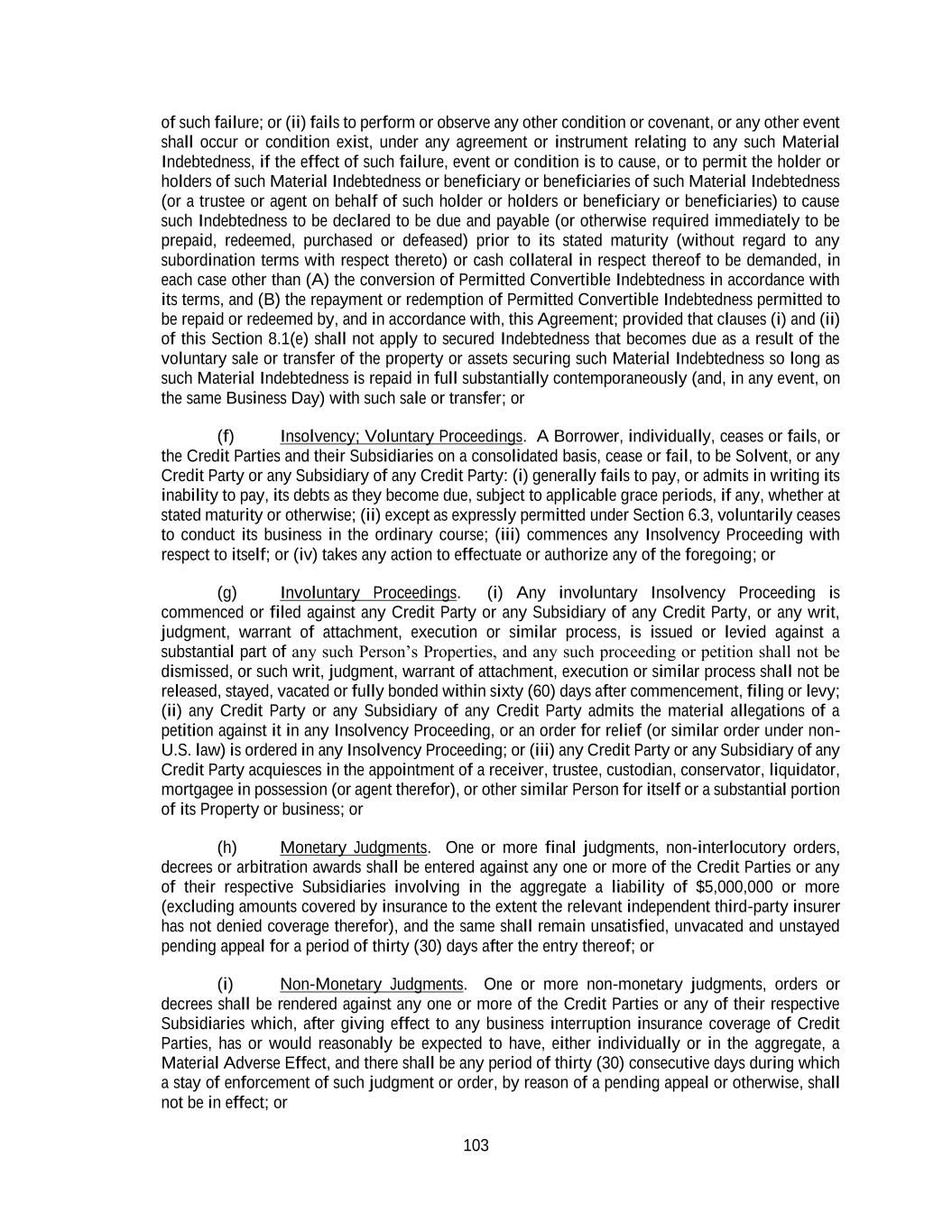 103 of such failure; or (ii) fails to perform or observe any other condition or covenant, or any other event shall occur or condition exist, under any agreement or instrument relating to any such Material Indebtedness, if the effect of such failure, event or condition is to cause, or to permit the holder or holders of such Material Indebtedness or beneficiary or beneficiaries of such Material Indebtedness (or a trustee or agent on behalf of such holder or holders or beneficiary or beneficiaries) to cause such Indebtedness to be declared to be due and payable (or otherwise required immediately to be prepaid, redeemed, purchased or defeased) prior to its stated maturity (without regard to any subordination terms with respect thereto) or cash collateral in respect thereof to be demanded, in each case other than (A) the conversion of Permitted Convertible Indebtedness in accordance with its terms, and (B) the repayment or redemption of Permitted Convertible Indebtedness permitted to be repaid or redeemed by, and in accordance with, this Agreement; provided that clauses (i) and (ii) of this Section 8.1(e) shall not apply to secured Indebtedness that becomes due as a result of the voluntary sale or transfer of the property or assets securing such Material Indebtedness so long as such Material Indebtedness is repaid in full substantially contemporaneously (and, in any event, on the same Business Day) with such sale or transfer; or (f) Insolvency; Voluntary Proceedings. A Borrower, individually, ceases or fails, or the Credit Parties and their Subsidiaries on a consolidated basis, cease or fail, to be Solvent, or any Credit Party or any Subsidiary of any Credit Party: (i) generally fails to pay, or admits in writing its inability to pay, its debts as they become due, subject to applicable grace periods, if any, whether at stated maturity or otherwise; (ii) except as expressly permitted under Section 6.3, voluntarily ceases to conduct its business in the ordinary course; (iii) commences any Insolvency Proceeding with respect to itself; or (iv) takes any action to effectuate or authorize any of the foregoing; or (g) Involuntary Proceedings. (i) Any involuntary Insolvency Proceeding is commenced or filed against any Credit Party or any Subsidiary of any Credit Party, or any writ, judgment, warrant of attachment, execution or similar process, is issued or levied against a substantial part of any such Person’s Properties, and any such proceeding or petition shall not be dismissed, or such writ, judgment, warrant of attachment, execution or similar process shall not be released, stayed, vacated or fully bonded within sixty (60) days after commencement, filing or levy; (ii) any Credit Party or any Subsidiary of any Credit Party admits the material allegations of a petition against it in any Insolvency Proceeding, or an order for relief (or similar order under non- U.S. law) is ordered in any Insolvency Proceeding; or (iii) any Credit Party or any Subsidiary of any Credit Party acquiesces in the appointment of a receiver, trustee, custodian, conservator, liquidator, mortgagee in possession (or agent therefor), or other similar Person for itself or a substantial portion of its Property or business; or (h) Monetary Judgments. One or more final judgments, non-interlocutory orders, decrees or arbitration awards shall be entered against any one or more of the Credit Parties or any of their respective Subsidiaries involving in the aggregate a liability of $5,000,000 or more (excluding amounts covered by insurance to the extent the relevant independent third-party insurer has not denied coverage therefor), and the same shall remain unsatisfied, unvacated and unstayed pending appeal for a period of thirty (30) days after the entry thereof; or (i) Non-Monetary Judgments. One or more non-monetary judgments, orders or decrees shall be rendered against any one or more of the Credit Parties or any of their respective Subsidiaries which, after giving effect to any business interruption insurance coverage of Credit Parties, has or would reasonably be expected to have, either individually or in the aggregate, a Material Adverse Effect, and there shall be any period of thirty (30) consecutive days during which a stay of enforcement of such judgment or order, by reason of a pending appeal or otherwise, shall not be in effect; or