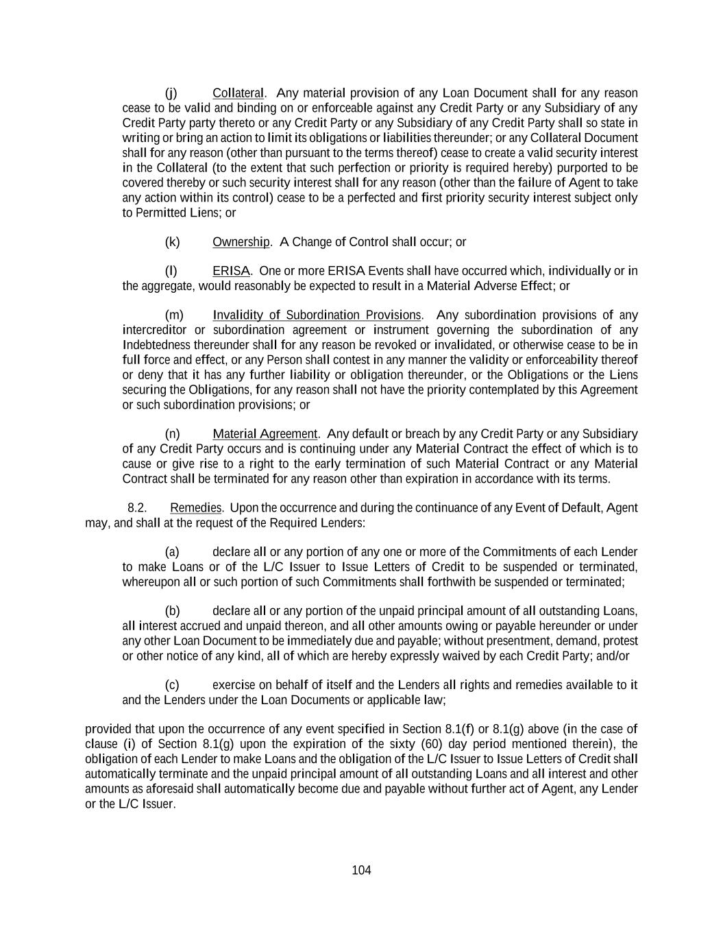 104 (j) Collateral. Any material provision of any Loan Document shall for any reason cease to be valid and binding on or enforceable against any Credit Party or any Subsidiary of any Credit Party party thereto or any Credit Party or any Subsidiary of any Credit Party shall so state in writing or bring an action to limit its obligations or liabilities thereunder; or any Collateral Document shall for any reason (other than pursuant to the terms thereof) cease to create a valid security interest in the Collateral (to the extent that such perfection or priority is required hereby) purported to be covered thereby or such security interest shall for any reason (other than the failure of Agent to take any action within its control) cease to be a perfected and first priority security interest subject only to Permitted Liens; or (k) Ownership. A Change of Control shall occur; or (l) ERISA. One or more ERISA Events shall have occurred which, individually or in the aggregate, would reasonably be expected to result in a Material Adverse Effect; or (m) Invalidity of Subordination Provisions. Any subordination provisions of any intercreditor or subordination agreement or instrument governing the subordination of any Indebtedness thereunder shall for any reason be revoked or invalidated, or otherwise cease to be in full force and effect, or any Person shall contest in any manner the validity or enforceability thereof or deny that it has any further liability or obligation thereunder, or the Obligations or the Liens securing the Obligations, for any reason shall not have the priority contemplated by this Agreement or such subordination provisions; or (n) Material Agreement. Any default or breach by any Credit Party or any Subsidiary of any Credit Party occurs and is continuing under any Material Contract the effect of which is to cause or give rise to a right to the early termination of such Material Contract or any Material Contract shall be terminated for any reason other than expiration in accordance with its terms. 8.2. Remedies. Upon the occurrence and during the continuance of any Event of Default, Agent may, and shall at the request of the Required Lenders: (a) declare all or any portion of any one or more of the Commitments of each Lender to make Loans or of the L/C Issuer to Issue Letters of Credit to be suspended or terminated, whereupon all or such portion of such Commitments shall forthwith be suspended or terminated; (b) declare all or any portion of the unpaid principal amount of all outstanding Loans, all interest accrued and unpaid thereon, and all other amounts owing or payable hereunder or under any other Loan Document to be immediately due and payable; without presentment, demand, protest or other notice of any kind, all of which are hereby expressly waived by each Credit Party; and/or (c) exercise on behalf of itself and the Lenders all rights and remedies available to it and the Lenders under the Loan Documents or applicable law; provided that upon the occurrence of any event specified in Section 8.1(f) or 8.1(g) above (in the case of clause (i) of Section 8.1(g) upon the expiration of the sixty (60) day period mentioned therein), the obligation of each Lender to make Loans and the obligation of the L/C Issuer to Issue Letters of Credit shall automatically terminate and the unpaid principal amount of all outstanding Loans and all interest and other amounts as aforesaid shall automatically become due and payable without further act of Agent, any Lender or the L/C Issuer.
