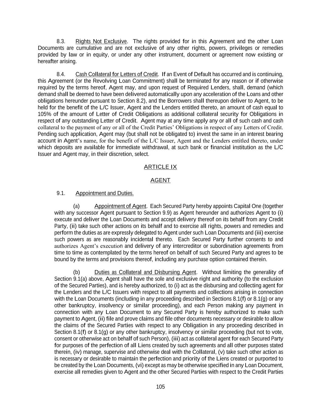 105 8.3. Rights Not Exclusive. The rights provided for in this Agreement and the other Loan Documents are cumulative and are not exclusive of any other rights, powers, privileges or remedies provided by law or in equity, or under any other instrument, document or agreement now existing or hereafter arising. 8.4. Cash Collateral for Letters of Credit. If an Event of Default has occurred and is continuing, this Agreement (or the Revolving Loan Commitment) shall be terminated for any reason or if otherwise required by the terms hereof, Agent may, and upon request of Required Lenders, shall, demand (which demand shall be deemed to have been delivered automatically upon any acceleration of the Loans and other obligations hereunder pursuant to Section 8.2), and the Borrowers shall thereupon deliver to Agent, to be held for the benefit of the L/C Issuer, Agent and the Lenders entitled thereto, an amount of cash equal to 105% of the amount of Letter of Credit Obligations as additional collateral security for Obligations in respect of any outstanding Letter of Credit. Agent may at any time apply any or all of such cash and cash collateral to the payment of any or all of the Credit Parties’ Obligations in respect of any Letters of Credit. Pending such application, Agent may (but shall not be obligated to) invest the same in an interest bearing account in Agent’s name, for the benefit of the L/C Issuer, Agent and the Lenders entitled thereto, under which deposits are available for immediate withdrawal, at such bank or financial institution as the L/C Issuer and Agent may, in their discretion, select. ARTICLE IX AGENT 9.1. Appointment and Duties. (a) Appointment of Agent. Each Secured Party hereby appoints Capital One (together with any successor Agent pursuant to Section 9.9) as Agent hereunder and authorizes Agent to (i) execute and deliver the Loan Documents and accept delivery thereof on its behalf from any Credit Party, (ii) take such other actions on its behalf and to exercise all rights, powers and remedies and perform the duties as are expressly delegated to Agent under such Loan Documents and (iii) exercise such powers as are reasonably incidental thereto. Each Secured Party further consents to and authorizes Agent’s execution and delivery of any intercreditor or subordination agreements from time to time as contemplated by the terms hereof on behalf of such Secured Party and agrees to be bound by the terms and provisions thereof, including any purchase option contained therein. (b) Duties as Collateral and Disbursing Agent. Without limiting the generality of Section 9.1(a) above, Agent shall have the sole and exclusive right and authority (to the exclusion of the Secured Parties), and is hereby authorized, to (i) act as the disbursing and collecting agent for the Lenders and the L/C Issuers with respect to all payments and collections arising in connection with the Loan Documents (including in any proceeding described in Sections 8.1(f) or 8.1(g) or any other bankruptcy, insolvency or similar proceeding), and each Person making any payment in connection with any Loan Document to any Secured Party is hereby authorized to make such payment to Agent, (ii) file and prove claims and file other documents necessary or desirable to allow the claims of the Secured Parties with respect to any Obligation in any proceeding described in Section 8.1(f) or 8.1(g) or any other bankruptcy, insolvency or similar proceeding (but not to vote, consent or otherwise act on behalf of such Person), (iii) act as collateral agent for each Secured Party for purposes of the perfection of all Liens created by such agreements and all other purposes stated therein, (iv) manage, supervise and otherwise deal with the Collateral, (v) take such other action as is necessary or desirable to maintain the perfection and priority of the Liens created or purported to be created by the Loan Documents, (vi) except as may be otherwise specified in any Loan Document, exercise all remedies given to Agent and the other Secured Parties with respect to the Credit Parties