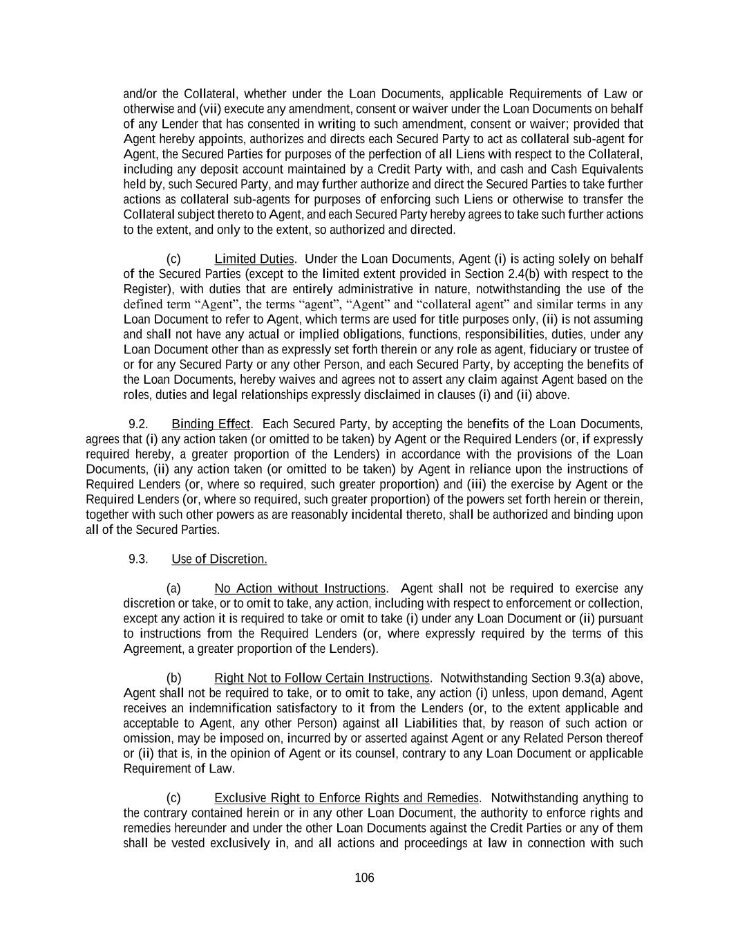 106 and/or the Collateral, whether under the Loan Documents, applicable Requirements of Law or otherwise and (vii) execute any amendment, consent or waiver under the Loan Documents on behalf of any Lender that has consented in writing to such amendment, consent or waiver; provided that Agent hereby appoints, authorizes and directs each Secured Party to act as collateral sub-agent for Agent, the Secured Parties for purposes of the perfection of all Liens with respect to the Collateral, including any deposit account maintained by a Credit Party with, and cash and Cash Equivalents held by, such Secured Party, and may further authorize and direct the Secured Parties to take further actions as collateral sub-agents for purposes of enforcing such Liens or otherwise to transfer the Collateral subject thereto to Agent, and each Secured Party hereby agrees to take such further actions to the extent, and only to the extent, so authorized and directed. (c) Limited Duties. Under the Loan Documents, Agent (i) is acting solely on behalf of the Secured Parties (except to the limited extent provided in Section 2.4(b) with respect to the Register), with duties that are entirely administrative in nature, notwithstanding the use of the defined term “Agent”, the terms “agent”, “Agent” and “collateral agent” and similar terms in any Loan Document to refer to Agent, which terms are used for title purposes only, (ii) is not assuming and shall not have any actual or implied obligations, functions, responsibilities, duties, under any Loan Document other than as expressly set forth therein or any role as agent, fiduciary or trustee of or for any Secured Party or any other Person, and each Secured Party, by accepting the benefits of the Loan Documents, hereby waives and agrees not to assert any claim against Agent based on the roles, duties and legal relationships expressly disclaimed in clauses (i) and (ii) above. 9.2. Binding Effect. Each Secured Party, by accepting the benefits of the Loan Documents, agrees that (i) any action taken (or omitted to be taken) by Agent or the Required Lenders (or, if expressly required hereby, a greater proportion of the Lenders) in accordance with the provisions of the Loan Documents, (ii) any action taken (or omitted to be taken) by Agent in reliance upon the instructions of Required Lenders (or, where so required, such greater proportion) and (iii) the exercise by Agent or the Required Lenders (or, where so required, such greater proportion) of the powers set forth herein or therein, together with such other powers as are reasonably incidental thereto, shall be authorized and binding upon all of the Secured Parties. 9.3. Use of Discretion. (a) No Action without Instructions. Agent shall not be required to exercise any discretion or take, or to omit to take, any action, including with respect to enforcement or collection, except any action it is required to take or omit to take (i) under any Loan Document or (ii) pursuant to instructions from the Required Lenders (or, where expressly required by the terms of this Agreement, a greater proportion of the Lenders). (b) Right Not to Follow Certain Instructions. Notwithstanding Section 9.3(a) above, Agent shall not be required to take, or to omit to take, any action (i) unless, upon demand, Agent receives an indemnification satisfactory to it from the Lenders (or, to the extent applicable and acceptable to Agent, any other Person) against all Liabilities that, by reason of such action or omission, may be imposed on, incurred by or asserted against Agent or any Related Person thereof or (ii) that is, in the opinion of Agent or its counsel, contrary to any Loan Document or applicable Requirement of Law. (c) Exclusive Right to Enforce Rights and Remedies. Notwithstanding anything to the contrary contained herein or in any other Loan Document, the authority to enforce rights and remedies hereunder and under the other Loan Documents against the Credit Parties or any of them shall be vested exclusively in, and all actions and proceedings at law in connection with such