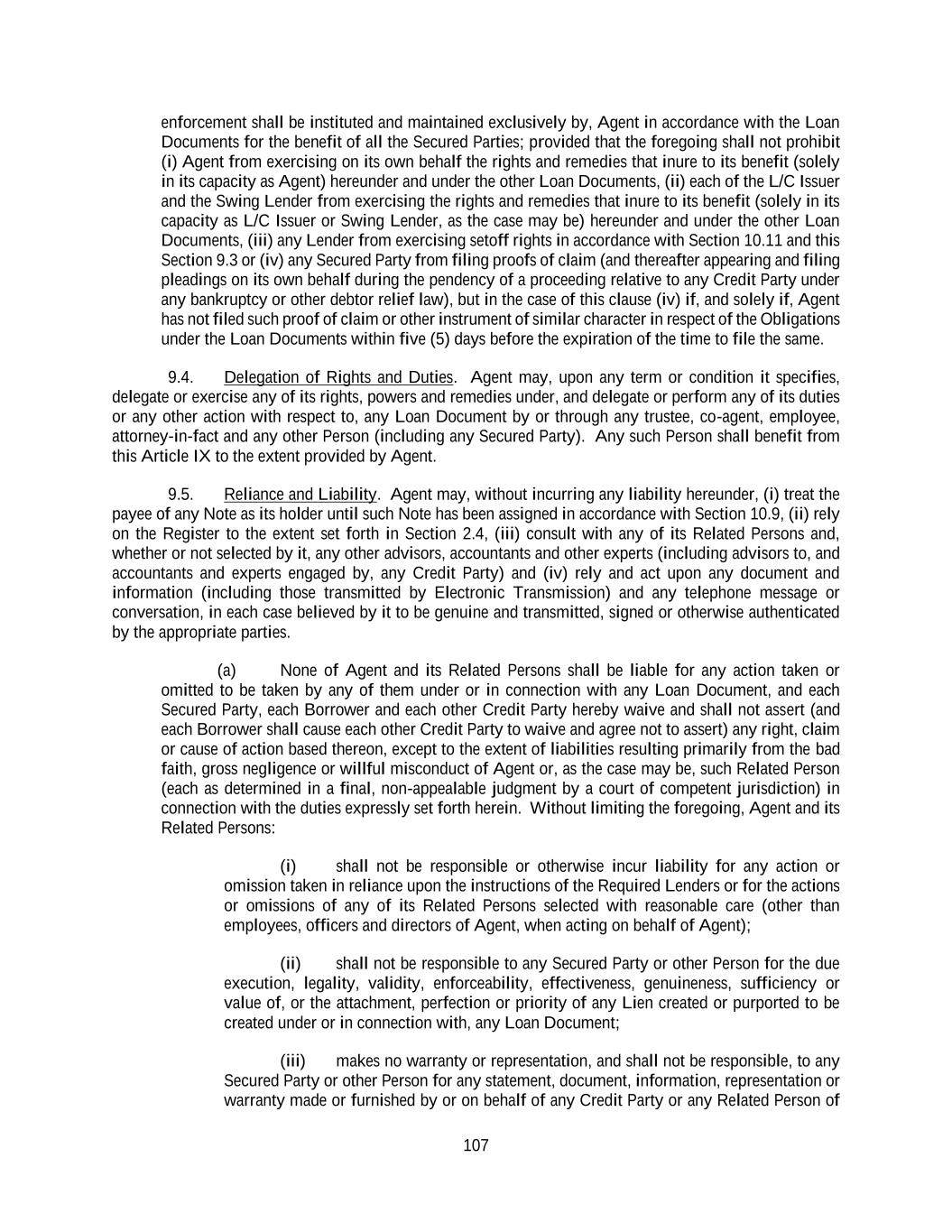 107 enforcement shall be instituted and maintained exclusively by, Agent in accordance with the Loan Documents for the benefit of all the Secured Parties; provided that the foregoing shall not prohibit (i) Agent from exercising on its own behalf the rights and remedies that inure to its benefit (solely in its capacity as Agent) hereunder and under the other Loan Documents, (ii) each of the L/C Issuer and the Swing Lender from exercising the rights and remedies that inure to its benefit (solely in its capacity as L/C Issuer or Swing Lender, as the case may be) hereunder and under the other Loan Documents, (iii) any Lender from exercising setoff rights in accordance with Section 10.11 and this Section 9.3 or (iv) any Secured Party from filing proofs of claim (and thereafter appearing and filing pleadings on its own behalf during the pendency of a proceeding relative to any Credit Party under any bankruptcy or other debtor relief law), but in the case of this clause (iv) if, and solely if, Agent has not filed such proof of claim or other instrument of similar character in respect of the Obligations under the Loan Documents within five (5) days before the expiration of the time to file the same. 9.4. Delegation of Rights and Duties. Agent may, upon any term or condition it specifies, delegate or exercise any of its rights, powers and remedies under, and delegate or perform any of its duties or any other action with respect to, any Loan Document by or through any trustee, co-agent, employee, attorney-in-fact and any other Person (including any Secured Party). Any such Person shall benefit from this Article IX to the extent provided by Agent. 9.5. Reliance and Liability. Agent may, without incurring any liability hereunder, (i) treat the payee of any Note as its holder until such Note has been assigned in accordance with Section 10.9, (ii) rely on the Register to the extent set forth in Section 2.4, (iii) consult with any of its Related Persons and, whether or not selected by it, any other advisors, accountants and other experts (including advisors to, and accountants and experts engaged by, any Credit Party) and (iv) rely and act upon any document and information (including those transmitted by Electronic Transmission) and any telephone message or conversation, in each case believed by it to be genuine and transmitted, signed or otherwise authenticated by the appropriate parties. (a) None of Agent and its Related Persons shall be liable for any action taken or omitted to be taken by any of them under or in connection with any Loan Document, and each Secured Party, each Borrower and each other Credit Party hereby waive and shall not assert (and each Borrower shall cause each other Credit Party to waive and agree not to assert) any right, claim or cause of action based thereon, except to the extent of liabilities resulting primarily from the bad faith, gross negligence or willful misconduct of Agent or, as the case may be, such Related Person (each as determined in a final, non-appealable judgment by a court of competent jurisdiction) in connection with the duties expressly set forth herein. Without limiting the foregoing, Agent and its Related Persons: (i) shall not be responsible or otherwise incur liability for any action or omission taken in reliance upon the instructions of the Required Lenders or for the actions or omissions of any of its Related Persons selected with reasonable care (other than employees, officers and directors of Agent, when acting on behalf of Agent); (ii) shall not be responsible to any Secured Party or other Person for the due execution, legality, validity, enforceability, effectiveness, genuineness, sufficiency or value of, or the attachment, perfection or priority of any Lien created or purported to be created under or in connection with, any Loan Document; (iii) makes no warranty or representation, and shall not be responsible, to any Secured Party or other Person for any statement, document, information, representation or warranty made or furnished by or on behalf of any Credit Party or any Related Person of