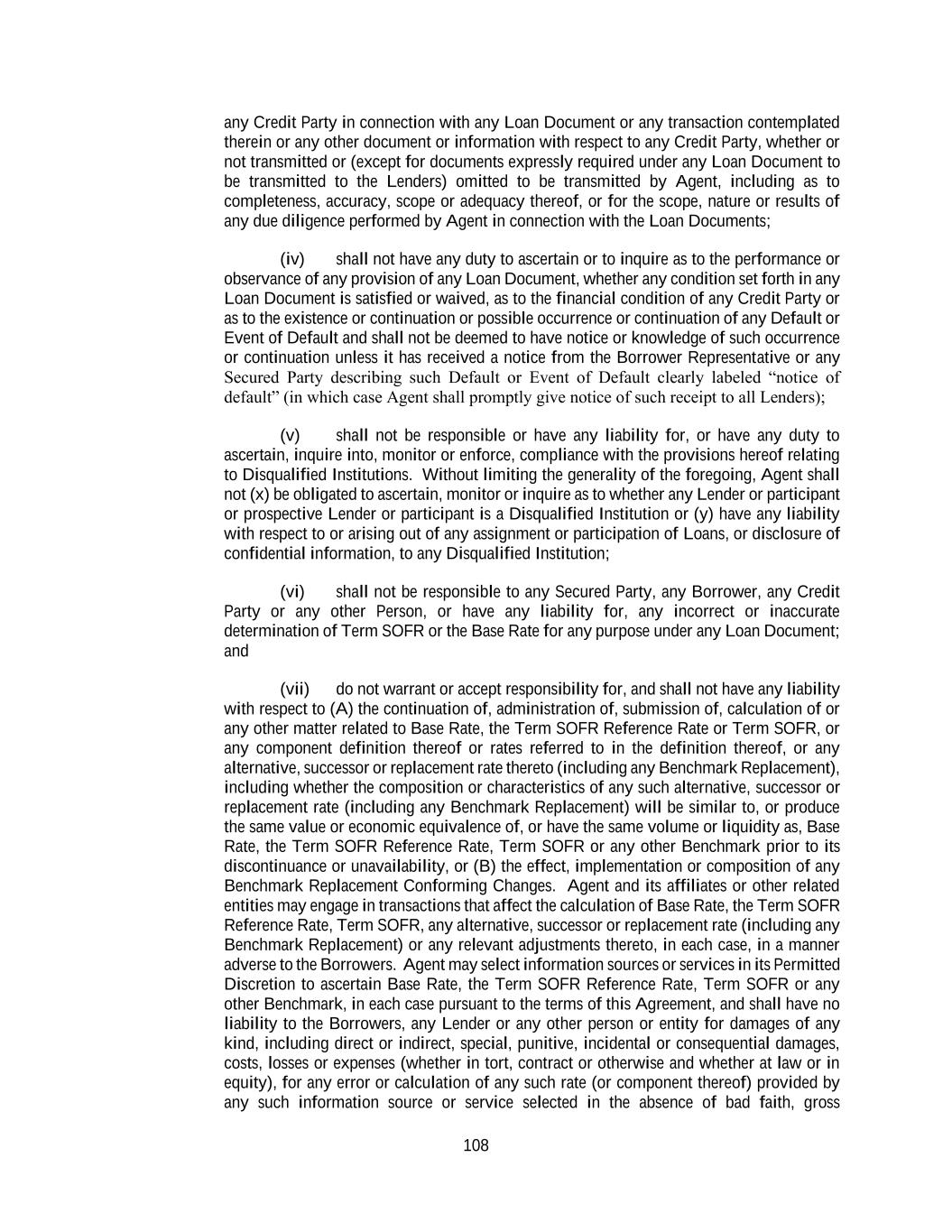 108 any Credit Party in connection with any Loan Document or any transaction contemplated therein or any other document or information with respect to any Credit Party, whether or not transmitted or (except for documents expressly required under any Loan Document to be transmitted to the Lenders) omitted to be transmitted by Agent, including as to completeness, accuracy, scope or adequacy thereof, or for the scope, nature or results of any due diligence performed by Agent in connection with the Loan Documents; (iv) shall not have any duty to ascertain or to inquire as to the performance or observance of any provision of any Loan Document, whether any condition set forth in any Loan Document is satisfied or waived, as to the financial condition of any Credit Party or as to the existence or continuation or possible occurrence or continuation of any Default or Event of Default and shall not be deemed to have notice or knowledge of such occurrence or continuation unless it has received a notice from the Borrower Representative or any Secured Party describing such Default or Event of Default clearly labeled “notice of default” (in which case Agent shall promptly give notice of such receipt to all Lenders); (v) shall not be responsible or have any liability for, or have any duty to ascertain, inquire into, monitor or enforce, compliance with the provisions hereof relating to Disqualified Institutions. Without limiting the generality of the foregoing, Agent shall not (x) be obligated to ascertain, monitor or inquire as to whether any Lender or participant or prospective Lender or participant is a Disqualified Institution or (y) have any liability with respect to or arising out of any assignment or participation of Loans, or disclosure of confidential information, to any Disqualified Institution; (vi) shall not be responsible to any Secured Party, any Borrower, any Credit Party or any other Person, or have any liability for, any incorrect or inaccurate determination of Term SOFR or the Base Rate for any purpose under any Loan Document; and (vii) do not warrant or accept responsibility for, and shall not have any liability with respect to (A) the continuation of, administration of, submission of, calculation of or any other matter related to Base Rate, the Term SOFR Reference Rate or Term SOFR, or any component definition thereof or rates referred to in the definition thereof, or any alternative, successor or replacement rate thereto (including any Benchmark Replacement), including whether the composition or characteristics of any such alternative, successor or replacement rate (including any Benchmark Replacement) will be similar to, or produce the same value or economic equivalence of, or have the same volume or liquidity as, Base Rate, the Term SOFR Reference Rate, Term SOFR or any other Benchmark prior to its discontinuance or unavailability, or (B) the effect, implementation or composition of any Benchmark Replacement Conforming Changes. Agent and its affiliates or other related entities may engage in transactions that affect the calculation of Base Rate, the Term SOFR Reference Rate, Term SOFR, any alternative, successor or replacement rate (including any Benchmark Replacement) or any relevant adjustments thereto, in each case, in a manner adverse to the Borrowers. Agent may select information sources or services in its Permitted Discretion to ascertain Base Rate, the Term SOFR Reference Rate, Term SOFR or any other Benchmark, in each case pursuant to the terms of this Agreement, and shall have no liability to the Borrowers, any Lender or any other person or entity for damages of any kind, including direct or indirect, special, punitive, incidental or consequential damages, costs, losses or expenses (whether in tort, contract or otherwise and whether at law or in equity), for any error or calculation of any such rate (or component thereof) provided by any such information source or service selected in the absence of bad faith, gross