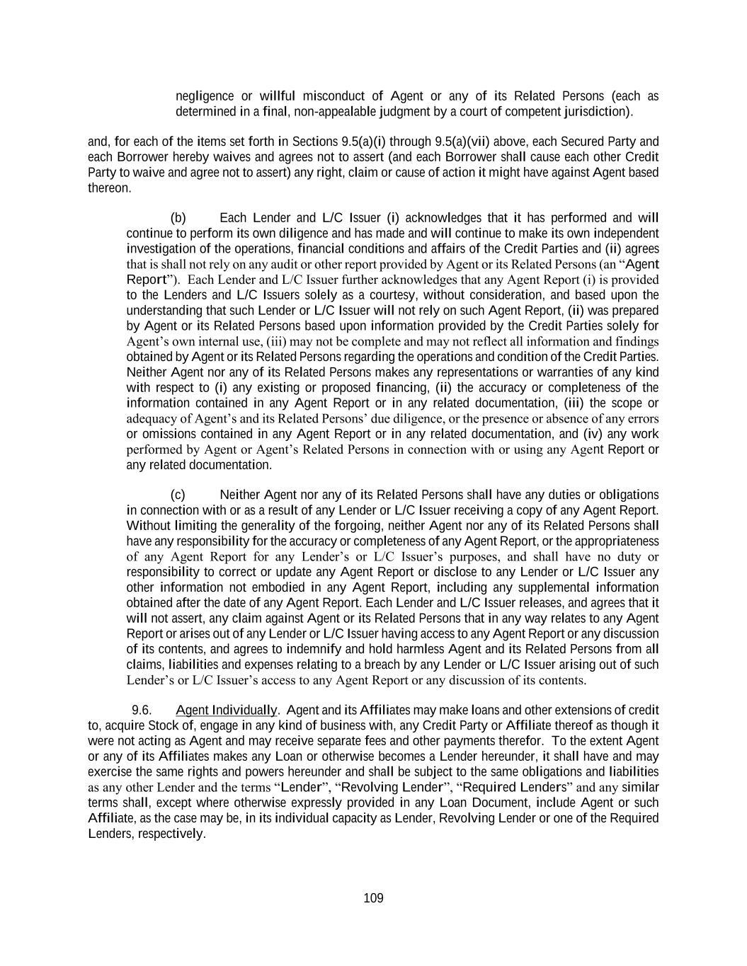 109 negligence or willful misconduct of Agent or any of its Related Persons (each as determined in a final, non-appealable judgment by a court of competent jurisdiction). and, for each of the items set forth in Sections 9.5(a)(i) through 9.5(a)(vii) above, each Secured Party and each Borrower hereby waives and agrees not to assert (and each Borrower shall cause each other Credit Party to waive and agree not to assert) any right, claim or cause of action it might have against Agent based thereon. (b) Each Lender and L/C Issuer (i) acknowledges that it has performed and will continue to perform its own diligence and has made and will continue to make its own independent investigation of the operations, financial conditions and affairs of the Credit Parties and (ii) agrees that is shall not rely on any audit or other report provided by Agent or its Related Persons (an “Agent Report”). Each Lender and L/C Issuer further acknowledges that any Agent Report (i) is provided to the Lenders and L/C Issuers solely as a courtesy, without consideration, and based upon the understanding that such Lender or L/C Issuer will not rely on such Agent Report, (ii) was prepared by Agent or its Related Persons based upon information provided by the Credit Parties solely for Agent’s own internal use, (iii) may not be complete and may not reflect all information and findings obtained by Agent or its Related Persons regarding the operations and condition of the Credit Parties. Neither Agent nor any of its Related Persons makes any representations or warranties of any kind with respect to (i) any existing or proposed financing, (ii) the accuracy or completeness of the information contained in any Agent Report or in any related documentation, (iii) the scope or adequacy of Agent’s and its Related Persons’ due diligence, or the presence or absence of any errors or omissions contained in any Agent Report or in any related documentation, and (iv) any work performed by Agent or Agent’s Related Persons in connection with or using any Agent Report or any related documentation. (c) Neither Agent nor any of its Related Persons shall have any duties or obligations in connection with or as a result of any Lender or L/C Issuer receiving a copy of any Agent Report. Without limiting the generality of the forgoing, neither Agent nor any of its Related Persons shall have any responsibility for the accuracy or completeness of any Agent Report, or the appropriateness of any Agent Report for any Lender’s or L/C Issuer’s purposes, and shall have no duty or responsibility to correct or update any Agent Report or disclose to any Lender or L/C Issuer any other information not embodied in any Agent Report, including any supplemental information obtained after the date of any Agent Report. Each Lender and L/C Issuer releases, and agrees that it will not assert, any claim against Agent or its Related Persons that in any way relates to any Agent Report or arises out of any Lender or L/C Issuer having access to any Agent Report or any discussion of its contents, and agrees to indemnify and hold harmless Agent and its Related Persons from all claims, liabilities and expenses relating to a breach by any Lender or L/C Issuer arising out of such Lender’s or L/C Issuer’s access to any Agent Report or any discussion of its contents. 9.6. Agent Individually. Agent and its Affiliates may make loans and other extensions of credit to, acquire Stock of, engage in any kind of business with, any Credit Party or Affiliate thereof as though it were not acting as Agent and may receive separate fees and other payments therefor. To the extent Agent or any of its Affiliates makes any Loan or otherwise becomes a Lender hereunder, it shall have and may exercise the same rights and powers hereunder and shall be subject to the same obligations and liabilities as any other Lender and the terms “Lender”, “Revolving Lender”, “Required Lenders” and any similar terms shall, except where otherwise expressly provided in any Loan Document, include Agent or such Affiliate, as the case may be, in its individual capacity as Lender, Revolving Lender or one of the Required Lenders, respectively.