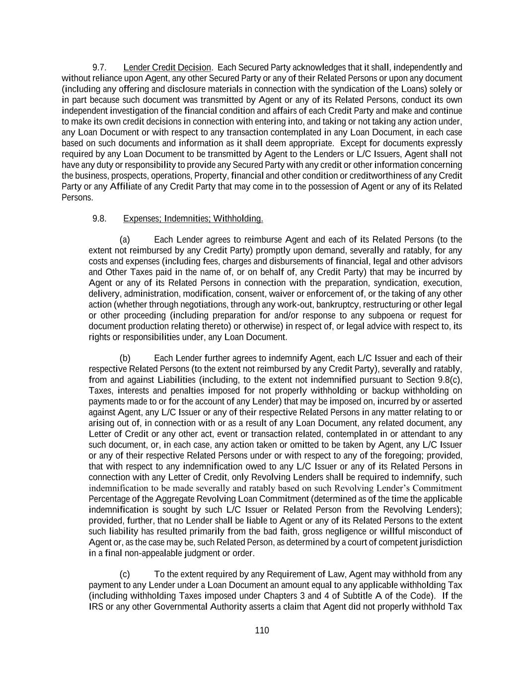 110 9.7. Lender Credit Decision. Each Secured Party acknowledges that it shall, independently and without reliance upon Agent, any other Secured Party or any of their Related Persons or upon any document (including any offering and disclosure materials in connection with the syndication of the Loans) solely or in part because such document was transmitted by Agent or any of its Related Persons, conduct its own independent investigation of the financial condition and affairs of each Credit Party and make and continue to make its own credit decisions in connection with entering into, and taking or not taking any action under, any Loan Document or with respect to any transaction contemplated in any Loan Document, in each case based on such documents and information as it shall deem appropriate. Except for documents expressly required by any Loan Document to be transmitted by Agent to the Lenders or L/C Issuers, Agent shall not have any duty or responsibility to provide any Secured Party with any credit or other information concerning the business, prospects, operations, Property, financial and other condition or creditworthiness of any Credit Party or any Affiliate of any Credit Party that may come in to the possession of Agent or any of its Related Persons. 9.8. Expenses; Indemnities; Withholding. (a) Each Lender agrees to reimburse Agent and each of its Related Persons (to the extent not reimbursed by any Credit Party) promptly upon demand, severally and ratably, for any costs and expenses (including fees, charges and disbursements of financial, legal and other advisors and Other Taxes paid in the name of, or on behalf of, any Credit Party) that may be incurred by Agent or any of its Related Persons in connection with the preparation, syndication, execution, delivery, administration, modification, consent, waiver or enforcement of, or the taking of any other action (whether through negotiations, through any work-out, bankruptcy, restructuring or other legal or other proceeding (including preparation for and/or response to any subpoena or request for document production relating thereto) or otherwise) in respect of, or legal advice with respect to, its rights or responsibilities under, any Loan Document. (b) Each Lender further agrees to indemnify Agent, each L/C Issuer and each of their respective Related Persons (to the extent not reimbursed by any Credit Party), severally and ratably, from and against Liabilities (including, to the extent not indemnified pursuant to Section 9.8(c), Taxes, interests and penalties imposed for not properly withholding or backup withholding on payments made to or for the account of any Lender) that may be imposed on, incurred by or asserted against Agent, any L/C Issuer or any of their respective Related Persons in any matter relating to or arising out of, in connection with or as a result of any Loan Document, any related document, any Letter of Credit or any other act, event or transaction related, contemplated in or attendant to any such document, or, in each case, any action taken or omitted to be taken by Agent, any L/C Issuer or any of their respective Related Persons under or with respect to any of the foregoing; provided, that with respect to any indemnification owed to any L/C Issuer or any of its Related Persons in connection with any Letter of Credit, only Revolving Lenders shall be required to indemnify, such indemnification to be made severally and ratably based on such Revolving Lender’s Commitment Percentage of the Aggregate Revolving Loan Commitment (determined as of the time the applicable indemnification is sought by such L/C Issuer or Related Person from the Revolving Lenders); provided, further, that no Lender shall be liable to Agent or any of its Related Persons to the extent such liability has resulted primarily from the bad faith, gross negligence or willful misconduct of Agent or, as the case may be, such Related Person, as determined by a court of competent jurisdiction in a final non-appealable judgment or order. (c) To the extent required by any Requirement of Law, Agent may withhold from any payment to any Lender under a Loan Document an amount equal to any applicable withholding Tax (including withholding Taxes imposed under Chapters 3 and 4 of Subtitle A of the Code). If the IRS or any other Governmental Authority asserts a claim that Agent did not properly withhold Tax