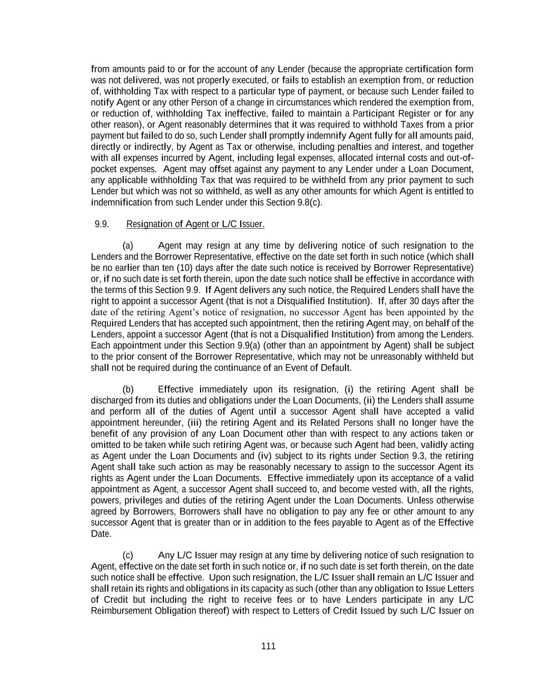 111 from amounts paid to or for the account of any Lender (because the appropriate certification form was not delivered, was not properly executed, or fails to establish an exemption from, or reduction of, withholding Tax with respect to a particular type of payment, or because such Lender failed to notify Agent or any other Person of a change in circumstances which rendered the exemption from, or reduction of, withholding Tax ineffective, failed to maintain a Participant Register or for any other reason), or Agent reasonably determines that it was required to withhold Taxes from a prior payment but failed to do so, such Lender shall promptly indemnify Agent fully for all amounts paid, directly or indirectly, by Agent as Tax or otherwise, including penalties and interest, and together with all expenses incurred by Agent, including legal expenses, allocated internal costs and out-of- pocket expenses. Agent may offset against any payment to any Lender under a Loan Document, any applicable withholding Tax that was required to be withheld from any prior payment to such Lender but which was not so withheld, as well as any other amounts for which Agent is entitled to indemnification from such Lender under this Section 9.8(c). 9.9. Resignation of Agent or L/C Issuer. (a) Agent may resign at any time by delivering notice of such resignation to the Lenders and the Borrower Representative, effective on the date set forth in such notice (which shall be no earlier than ten (10) days after the date such notice is received by Borrower Representative) or, if no such date is set forth therein, upon the date such notice shall be effective in accordance with the terms of this Section 9.9. If Agent delivers any such notice, the Required Lenders shall have the right to appoint a successor Agent (that is not a Disqualified Institution). If, after 30 days after the date of the retiring Agent’s notice of resignation, no successor Agent has been appointed by the Required Lenders that has accepted such appointment, then the retiring Agent may, on behalf of the Lenders, appoint a successor Agent (that is not a Disqualified Institution) from among the Lenders. Each appointment under this Section 9.9(a) (other than an appointment by Agent) shall be subject to the prior consent of the Borrower Representative, which may not be unreasonably withheld but shall not be required during the continuance of an Event of Default. (b) Effective immediately upon its resignation, (i) the retiring Agent shall be discharged from its duties and obligations under the Loan Documents, (ii) the Lenders shall assume and perform all of the duties of Agent until a successor Agent shall have accepted a valid appointment hereunder, (iii) the retiring Agent and its Related Persons shall no longer have the benefit of any provision of any Loan Document other than with respect to any actions taken or omitted to be taken while such retiring Agent was, or because such Agent had been, validly acting as Agent under the Loan Documents and (iv) subject to its rights under Section 9.3, the retiring Agent shall take such action as may be reasonably necessary to assign to the successor Agent its rights as Agent under the Loan Documents. Effective immediately upon its acceptance of a valid appointment as Agent, a successor Agent shall succeed to, and become vested with, all the rights, powers, privileges and duties of the retiring Agent under the Loan Documents. Unless otherwise agreed by Borrowers, Borrowers shall have no obligation to pay any fee or other amount to any successor Agent that is greater than or in addition to the fees payable to Agent as of the Effective Date. (c) Any L/C Issuer may resign at any time by delivering notice of such resignation to Agent, effective on the date set forth in such notice or, if no such date is set forth therein, on the date such notice shall be effective. Upon such resignation, the L/C Issuer shall remain an L/C Issuer and shall retain its rights and obligations in its capacity as such (other than any obligation to Issue Letters of Credit but including the right to receive fees or to have Lenders participate in any L/C Reimbursement Obligation thereof) with respect to Letters of Credit Issued by such L/C Issuer on