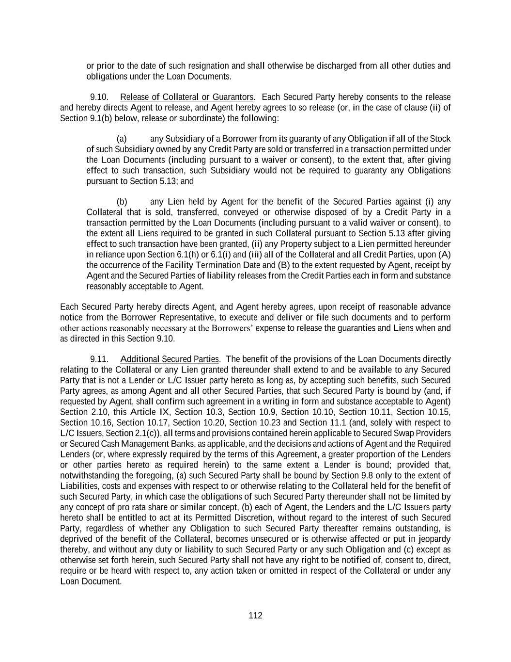 112 or prior to the date of such resignation and shall otherwise be discharged from all other duties and obligations under the Loan Documents. 9.10. Release of Collateral or Guarantors. Each Secured Party hereby consents to the release and hereby directs Agent to release, and Agent hereby agrees to so release (or, in the case of clause (ii) of Section 9.1(b) below, release or subordinate) the following: (a) any Subsidiary of a Borrower from its guaranty of any Obligation if all of the Stock of such Subsidiary owned by any Credit Party are sold or transferred in a transaction permitted under the Loan Documents (including pursuant to a waiver or consent), to the extent that, after giving effect to such transaction, such Subsidiary would not be required to guaranty any Obligations pursuant to Section 5.13; and (b) any Lien held by Agent for the benefit of the Secured Parties against (i) any Collateral that is sold, transferred, conveyed or otherwise disposed of by a Credit Party in a transaction permitted by the Loan Documents (including pursuant to a valid waiver or consent), to the extent all Liens required to be granted in such Collateral pursuant to Section 5.13 after giving effect to such transaction have been granted, (ii) any Property subject to a Lien permitted hereunder in reliance upon Section 6.1(h) or 6.1(i) and (iii) all of the Collateral and all Credit Parties, upon (A) the occurrence of the Facility Termination Date and (B) to the extent requested by Agent, receipt by Agent and the Secured Parties of liability releases from the Credit Parties each in form and substance reasonably acceptable to Agent. Each Secured Party hereby directs Agent, and Agent hereby agrees, upon receipt of reasonable advance notice from the Borrower Representative, to execute and deliver or file such documents and to perform other actions reasonably necessary at the Borrowers’ expense to release the guaranties and Liens when and as directed in this Section 9.10. 9.11. Additional Secured Parties. The benefit of the provisions of the Loan Documents directly relating to the Collateral or any Lien granted thereunder shall extend to and be available to any Secured Party that is not a Lender or L/C Issuer party hereto as long as, by accepting such benefits, such Secured Party agrees, as among Agent and all other Secured Parties, that such Secured Party is bound by (and, if requested by Agent, shall confirm such agreement in a writing in form and substance acceptable to Agent) Section 2.10, this Article IX, Section 10.3, Section 10.9, Section 10.10, Section 10.11, Section 10.15, Section 10.16, Section 10.17, Section 10.20, Section 10.23 and Section 11.1 (and, solely with respect to L/C Issuers, Section 2.1(c)), all terms and provisions contained herein applicable to Secured Swap Providers or Secured Cash Management Banks, as applicable, and the decisions and actions of Agent and the Required Lenders (or, where expressly required by the terms of this Agreement, a greater proportion of the Lenders or other parties hereto as required herein) to the same extent a Lender is bound; provided that, notwithstanding the foregoing, (a) such Secured Party shall be bound by Section 9.8 only to the extent of Liabilities, costs and expenses with respect to or otherwise relating to the Collateral held for the benefit of such Secured Party, in which case the obligations of such Secured Party thereunder shall not be limited by any concept of pro rata share or similar concept, (b) each of Agent, the Lenders and the L/C Issuers party hereto shall be entitled to act at its Permitted Discretion, without regard to the interest of such Secured Party, regardless of whether any Obligation to such Secured Party thereafter remains outstanding, is deprived of the benefit of the Collateral, becomes unsecured or is otherwise affected or put in jeopardy thereby, and without any duty or liability to such Secured Party or any such Obligation and (c) except as otherwise set forth herein, such Secured Party shall not have any right to be notified of, consent to, direct, require or be heard with respect to, any action taken or omitted in respect of the Collateral or under any Loan Document.