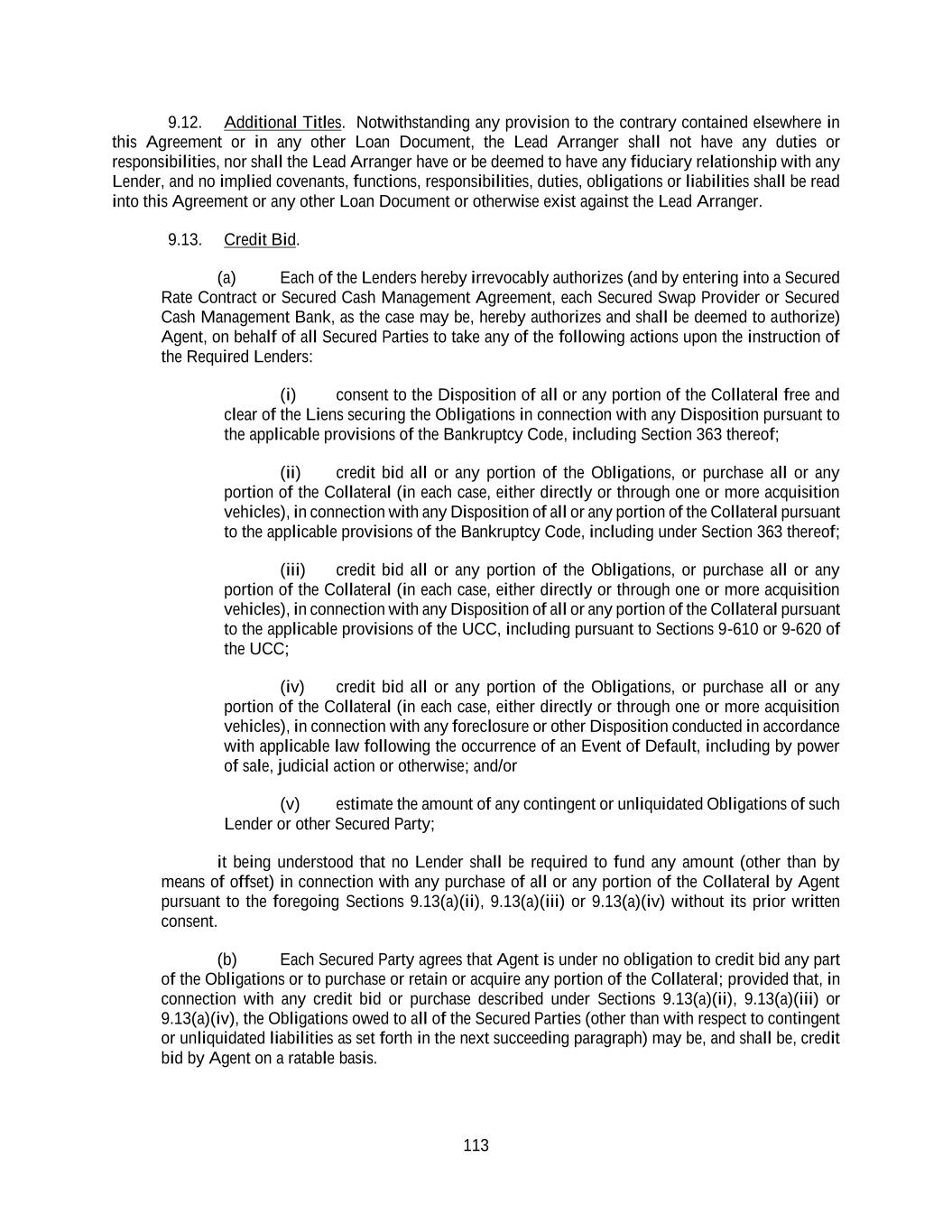 113 9.12. Additional Titles. Notwithstanding any provision to the contrary contained elsewhere in this Agreement or in any other Loan Document, the Lead Arranger shall not have any duties or responsibilities, nor shall the Lead Arranger have or be deemed to have any fiduciary relationship with any Lender, and no implied covenants, functions, responsibilities, duties, obligations or liabilities shall be read into this Agreement or any other Loan Document or otherwise exist against the Lead Arranger. 9.13. Credit Bid. (a) Each of the Lenders hereby irrevocably authorizes (and by entering into a Secured Rate Contract or Secured Cash Management Agreement, each Secured Swap Provider or Secured Cash Management Bank, as the case may be, hereby authorizes and shall be deemed to authorize) Agent, on behalf of all Secured Parties to take any of the following actions upon the instruction of the Required Lenders: (i) consent to the Disposition of all or any portion of the Collateral free and clear of the Liens securing the Obligations in connection with any Disposition pursuant to the applicable provisions of the Bankruptcy Code, including Section 363 thereof; (ii) credit bid all or any portion of the Obligations, or purchase all or any portion of the Collateral (in each case, either directly or through one or more acquisition vehicles), in connection with any Disposition of all or any portion of the Collateral pursuant to the applicable provisions of the Bankruptcy Code, including under Section 363 thereof; (iii) credit bid all or any portion of the Obligations, or purchase all or any portion of the Collateral (in each case, either directly or through one or more acquisition vehicles), in connection with any Disposition of all or any portion of the Collateral pursuant to the applicable provisions of the UCC, including pursuant to Sections 9-610 or 9-620 of the UCC; (iv) credit bid all or any portion of the Obligations, or purchase all or any portion of the Collateral (in each case, either directly or through one or more acquisition vehicles), in connection with any foreclosure or other Disposition conducted in accordance with applicable law following the occurrence of an Event of Default, including by power of sale, judicial action or otherwise; and/or (v) estimate the amount of any contingent or unliquidated Obligations of such Lender or other Secured Party; it being understood that no Lender shall be required to fund any amount (other than by means of offset) in connection with any purchase of all or any portion of the Collateral by Agent pursuant to the foregoing Sections 9.13(a)(ii), 9.13(a)(iii) or 9.13(a)(iv) without its prior written consent. (b) Each Secured Party agrees that Agent is under no obligation to credit bid any part of the Obligations or to purchase or retain or acquire any portion of the Collateral; provided that, in connection with any credit bid or purchase described under Sections 9.13(a)(ii), 9.13(a)(iii) or 9.13(a)(iv), the Obligations owed to all of the Secured Parties (other than with respect to contingent or unliquidated liabilities as set forth in the next succeeding paragraph) may be, and shall be, credit bid by Agent on a ratable basis.